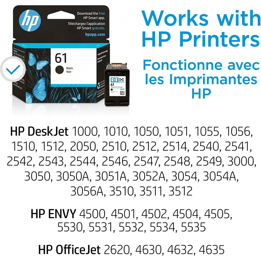 Key Features: Original HP Ink is engineered to work with HP printers to provide consistent quality, reliability and value This cartridge works with: HP DeskJet 1000, 1010, 1050, 1051, 1055, 1056, 1510, 1512, 2050, 2510, 2512, 2514, 2540, 2541, 2542, 2543, 2544, 2546, 2547, 2548, 2549, 3000, 3050, 3050A, 3051A, 3052A, 3054, 3054A, 3056A, 3510, 3511, 3512 This cartridge works with: HP ENVY 4500, 4501, 4502, 4504, 4505, 5530, 5531, 5532, 5534, 5535; HP OfficeJet 2620, 4630, 4632,4635 Cartridge yield (approx.): 190 page Up to 2x more prints with Original HP Ink vs. non-Original HP Ink 82% of HP ink cartridges are manufactured with recycled plastic Get ink your way: buy Original HP Ink Cartridges or save up to 50% and never run out with HP Instant Ink, the Smart Ink Subscription What’s in the box: 1 new Original HP 61 Black Ink Cartridge (CH561WN)