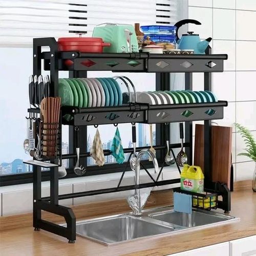Key Features: Over The Sink Dish Drying Rack, 2 Tier Stainless Steel Large Adjustable Kitchen Dish Drainer, Home Storage Organizer Shelf Above Counter With 6 Hooks- Black. SPACE SAVER – This dish rack expands for use on the counter, in the sink, or over the sink. Easy to assemble, over-the-sink would save much more space in the kitchen. Large capacity, and easily store a variety of bowls and dishes. You can fully use the space above the sink,perfect for your limited kitchen countertop. SUPERIOR QUALITY – This dish drying rack is made of Stainless steel material-polishing, and a fixed welding process, prevent rusting. Two-layer dish rack with height adjustment is sturdy, durable, and more effective for storage. EXTENDABLE SIZE – The unit (collapsed) measures 35.0/37.2 (L) x 9.8 (W) x 31.0 (H) inches(please test the size of your sink before purchase). ANTI-SLIP PADS – Sturdy Pipes, Anti-Skid Pads protect the pipes of the four legs and they are very stout to bear a lot of weight. There are anti-slip PADS on the bottom of the 4 feet in case of sliding even if there is water on the table. MODERN STYLE – The dish rack has a safe edge and smooth slot, which do not hurt dishes and bowls. Adjustable pads, removable hooks, special water pans for chopsticks, modern style dish drainer gives you an interesting look to your kitchen