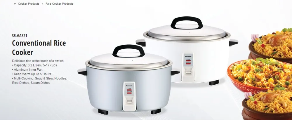 Panasonic Conventional Rice Cooker (3L) SR-GA321 Conventional Rice Cooker Delicious rice at the touch of a switch. • Capacity: 3.2 Litres / 5-17 cups • Aluminum Inner Pan • Keep Warm Up To 5 Hours • Multi-Cooking: Soup & Stew, Noodles, Rice Dishes, Steam Dishes Conventional Rice Cooker SR-GA321 Thumbnail Image 1Conventional Rice Cooker SR-GA321 Thumbnail Easy & Convenient Stainless Steel Lid Stainless Steel Lid with convenient handle enables easy handling. Cooking Plate Ensure starch filtration and prevents sticking of cooked food. Removable Inner Pan Makes cleaning easy. Keep Warm Function Once food is cooked switches automatically to this mode. Keep food warm for 5 hours. Key Features: Panasonic Conventional Rice Cooker (3L) SR-GA321 Conventional Rice Cooker Delicious rice at the touch of a switch. • Capacity: 3.2 Litres / 5-17 cups • Aluminum Inner Pan • Keep Warm Up To 5 Hours • Multi-Cooking: Soup & Stew, Noodles, Rice Dishes, Steam Dishes Conventional Rice Cooker SR-GA321 Thumbnail Image 1Conventional Rice Cooker SR-GA321 Thumbnail