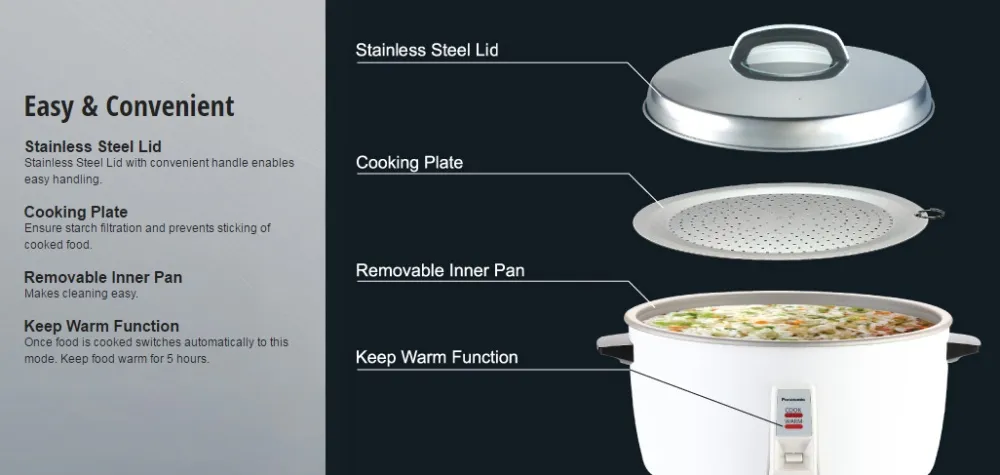 Panasonic Conventional Rice Cooker (4L) SR-GA421 Conventional Rice Cooker Delicious rice at the touch of a switch. • Capacity: 4l • Aluminum Inner Pan • Keep Warm Up To 5 Hours • Multi-Cooking: Soup & Stew, Noodles, Rice Dishes, Steam Dishes Conventional Rice Cooker SR-GA421 Thumbnail Image 1Conventional Rice Cooker SR-GA421 Thumbnail Easy & Convenient Stainless Steel Lid Stainless Steel Lid with convenient handle enables easy handling. Cooking Plate Ensure starch filtration and prevents sticking of cooked food. Removable Inner Pan Makes cleaning easy. Keep Warm Function Once food is cooked switches automatically to this mode. Keep food warm for 5 hours. Key Features: Panasonic Conventional Rice Cooker (4L) SR-GA421 Capacity: 4.2L Cooking Capacity 5 – 23 cups Stainless steel lid Keep warm function Power: 1550W Inner Pan Anodised Aluminium