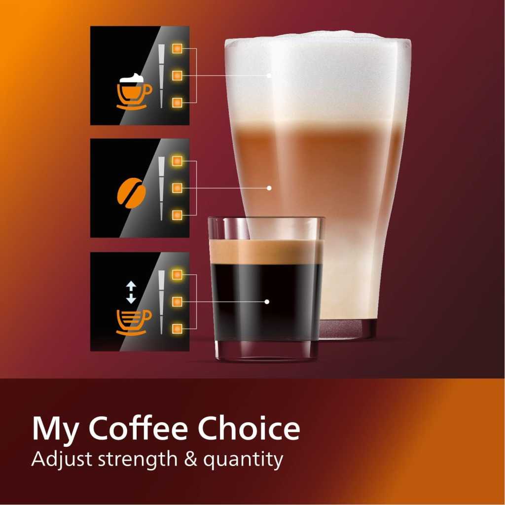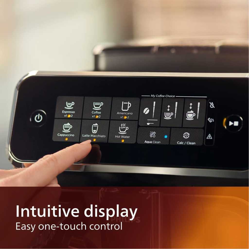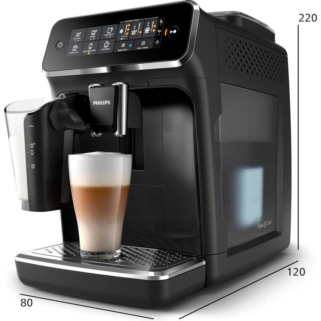 Key Features: With Philips 3200 Series enjoy the delicious taste and aroma of coffee from fresh beans and perfect temperature, thanks to our intelligent brewing system. The LatteGo milk system allows you to create a silky smooth cappuccino or latte macchiato with ease EASY BEVERAGE SELECTION: Easily select your favorite drinks in just one touch with 6 beverage options – Espresso, Coffee, Americano, Latte Macchiato, Cappuccino and Hot Water LATTEGO MILK SYSTEM: Effortlessly make silky-smooth milk froth, even with plant-based alternatives for your milk based drinks DURABLE CERAMIC GRINDER: Bring out the full flavour of your coffee with our hard-wearing ceramic grinder. The durable ceramic grinder can be adjusted in 12 steps, from fine to coarse grindings EASY CUSTOMIZATION WITH INTUITIVE TOUCH DISPLAY: Adjust your coffee your way with the My Coffee Choice function: choose your preferred coffee strength, length, and milk froth level, just to your taste with one touch AQUACLEAN FILTER: By changing the filter after being prompted by the machine, you will not need to descale your machine for up to 5000 cups***, while enjoying your coffee with clear and purified water EASY CLEANING: Save time with dishwasher safe parts and our removable brew group allows you to clean thoroughly with just a rinse 2 YEAR WARRANTY