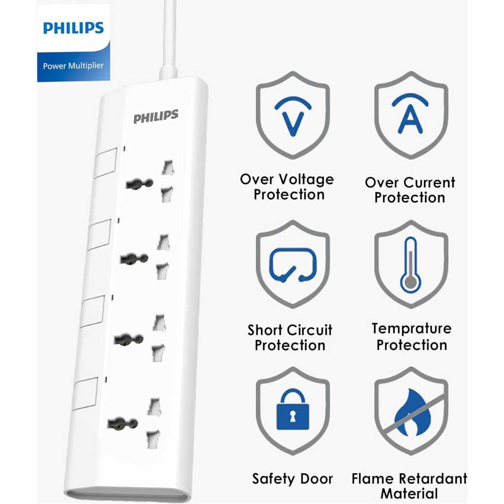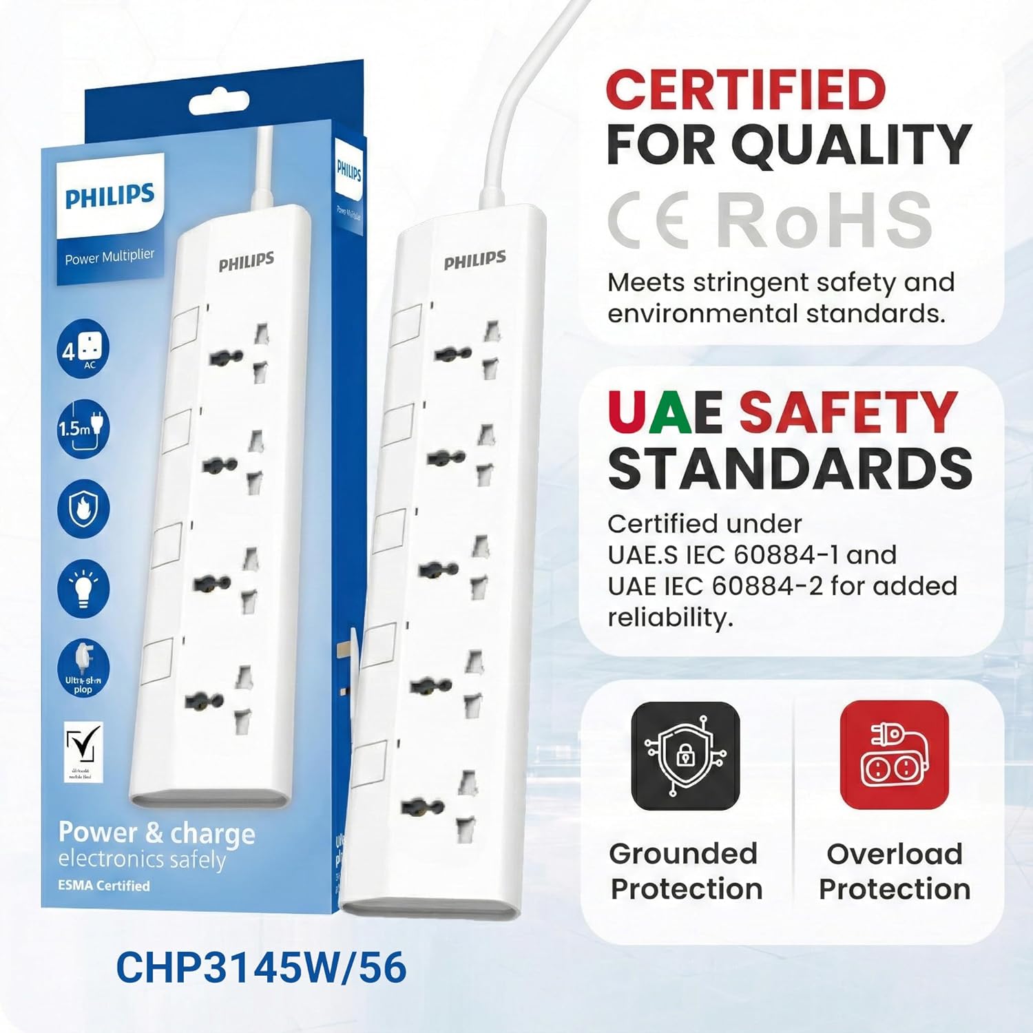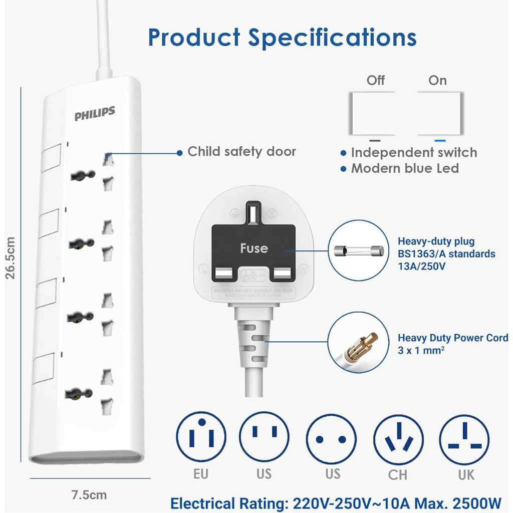 Key Features: ✅ Individual Control & Safety Shutters: Take full control of your power. Each of the 4 universal sockets features its own independent on/off switch and a clear power indicator light. Built-in safety shutters protect children and pets from accessing live parts. Always keep out of reach of children. ESMA & UAE SAFETY CERTIFIED: Charge with ultimate peace of mind. This power strip is fully ESMA Certified and compliant with all local UAE Safety Standards, including UAE S IEC 60884-1 and UAE S IEC 60884-2. Certified Overload & Fire Protection: Protect your valuable electronics. The strip is rated for a 2500W / 10A maximum load. The heavy-duty plug conforms to BS1363/A standards, contains a replaceable 13A fuse for overload protection, and features the official Safety Mark. The housing is 750°C fire-resistant. 1.5M Heavy-Duty 3x1mm² Cable: Enjoy flexible placement and superior performance. The 1.5-meter heavy-duty power cord is built with a 3x1mm² specification (100% pure copper) for superior conductivity, reduced heat, and maximum power efficiency. Ultra-Slim Plug & Power Indicators: Features a modern, ultra-slim plug that fits neatly behind furniture. A clear power indicator lets you know your power is functioning properly for each individual socket.