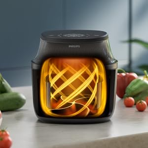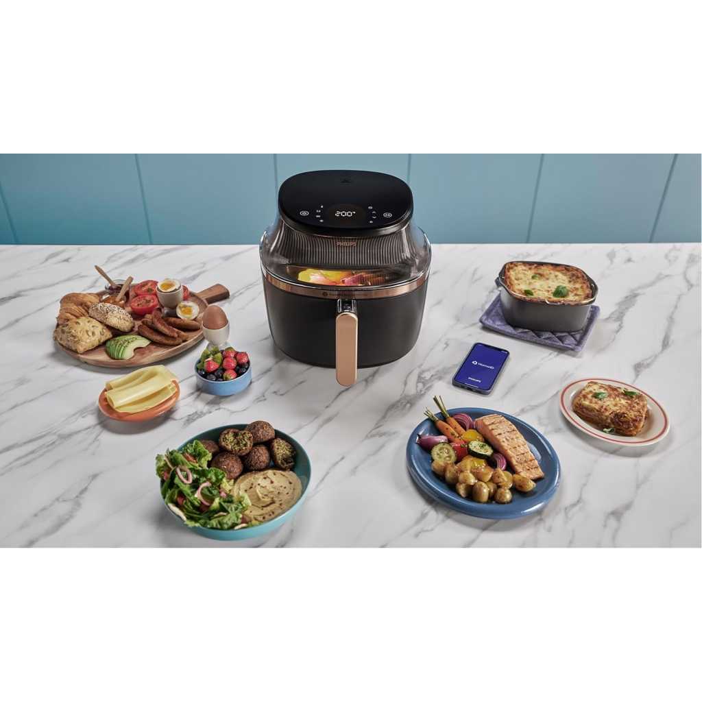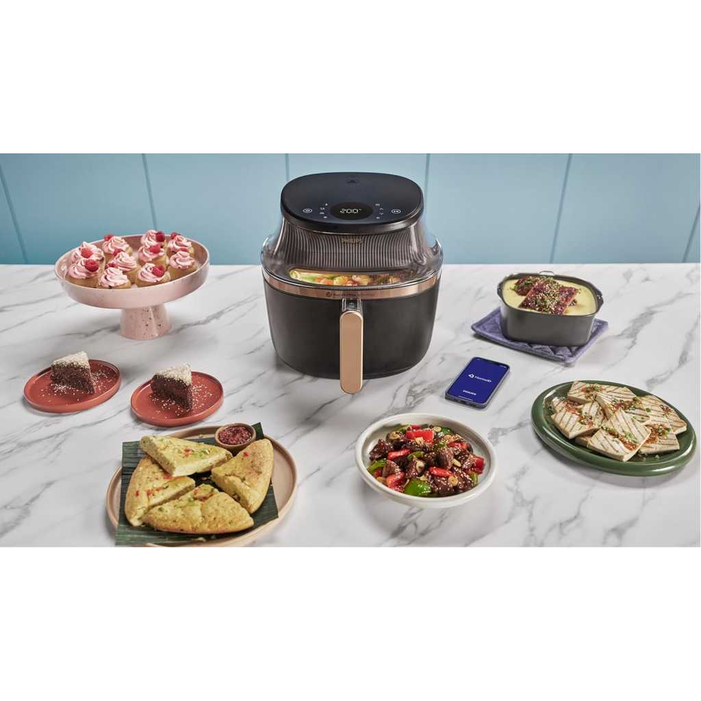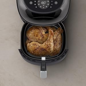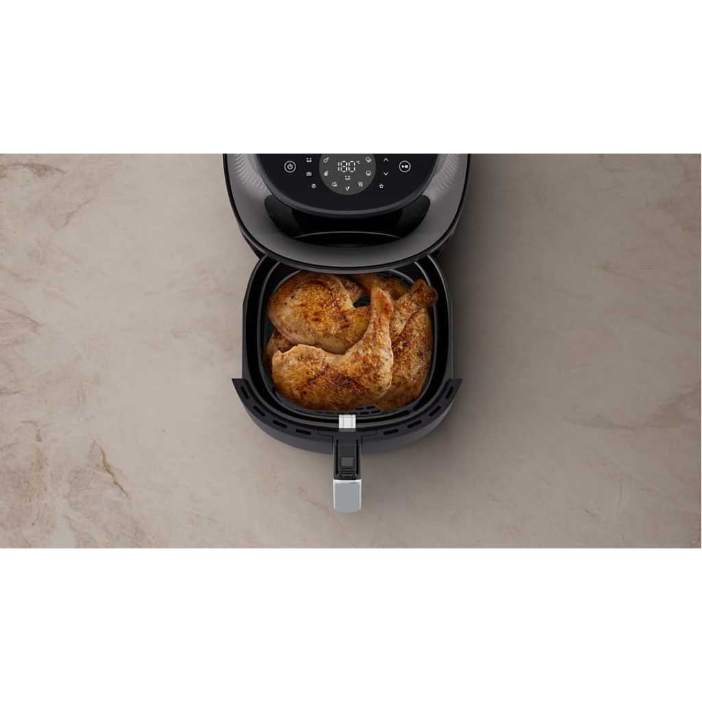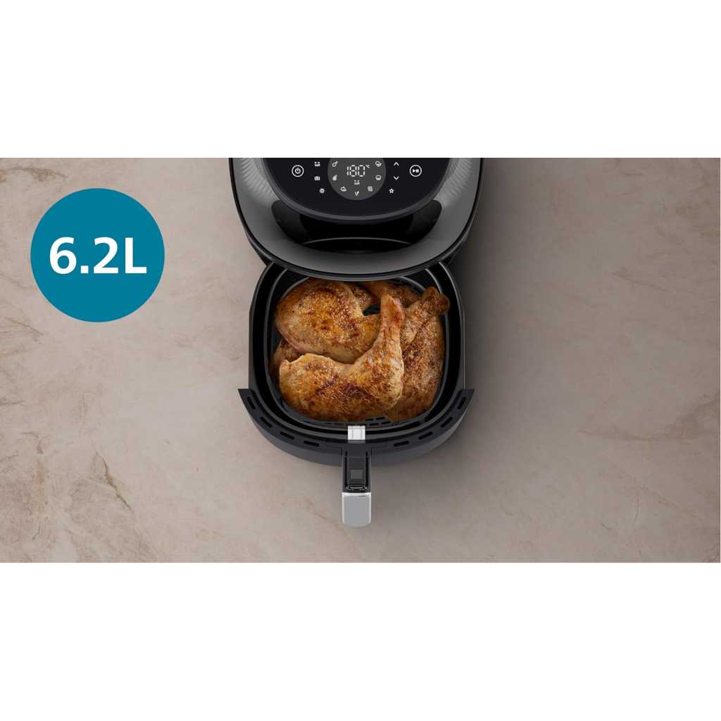 Key Features: RAPIDAIR PLUS TECHNOLOGY: Enjoy delicious food with up to 90% less fat. Patented RapidAir Plus Technology with unique star-shaped design circulates hot air around and through the food with faster airflow, ensuring even cooking inside and outside to create tasty homemade meals. COOKING WINDOW: No more guessing. Watch while you cook and see when it’s done to perfection. 6.2L CAPACITY: Enough capacity for your all family meals. Holds up to 1000 grams of veggies; 8 chicken drumsticks; 5 pieces of salmon or 7 muffins. 16 IN 1: Cooking possibilities from baking and grilling to defrosting and reheating. Settings go as low as 40℃ and as long as 24 hours for dehydrating and fermentation, too. FAT REMOVAL: Up to 40% of excess fat drips away for healthier meals with full flavor. The basket keeps food separate from the fat collected in the pan as it cooks.