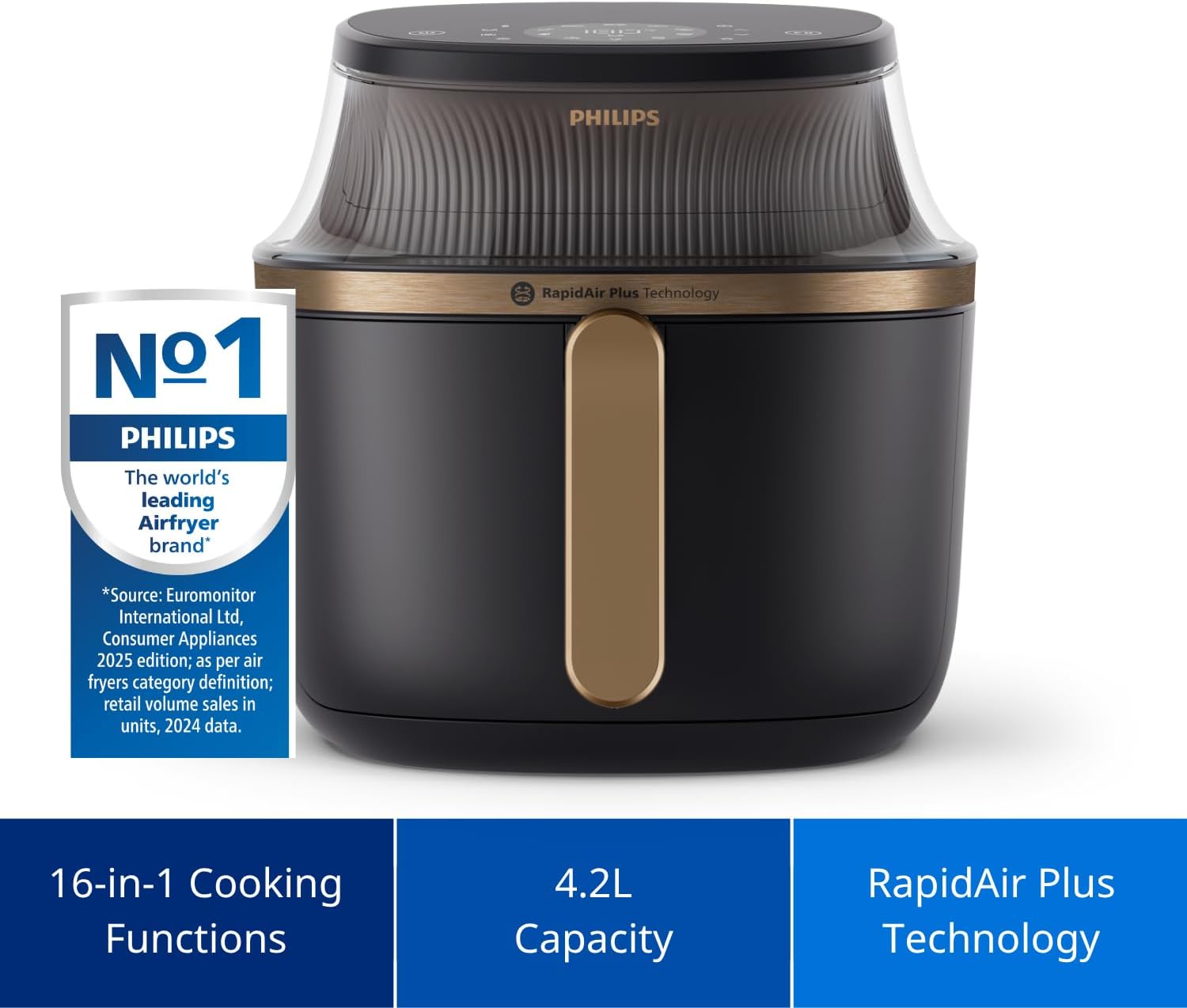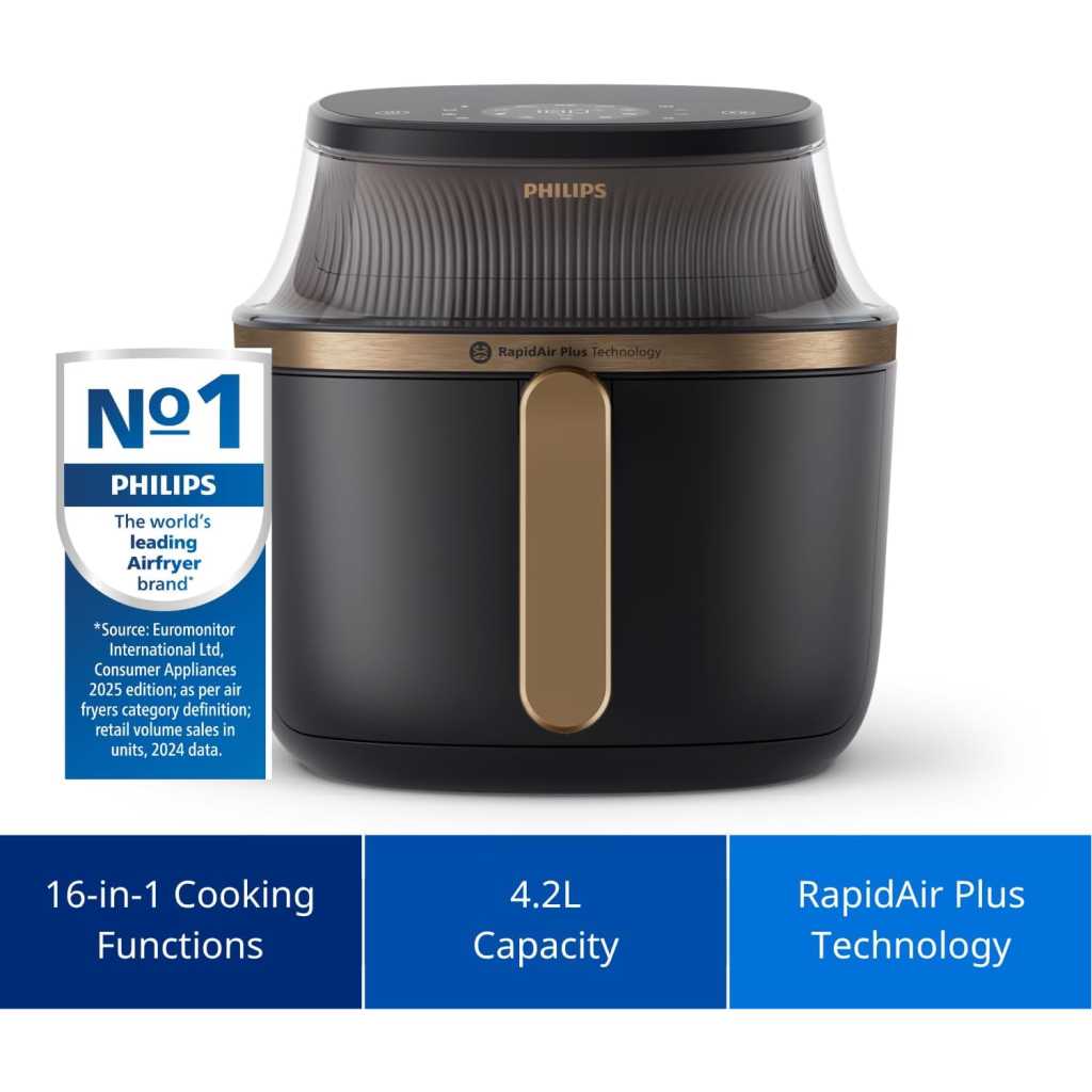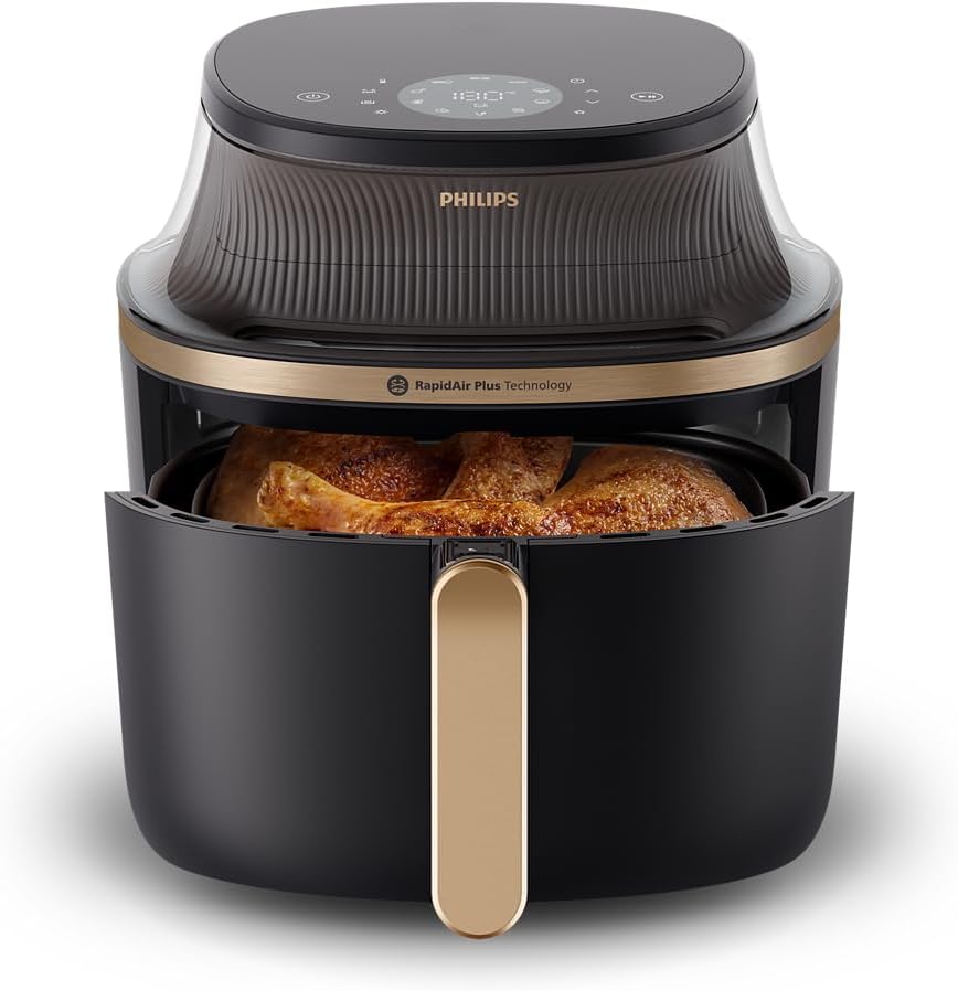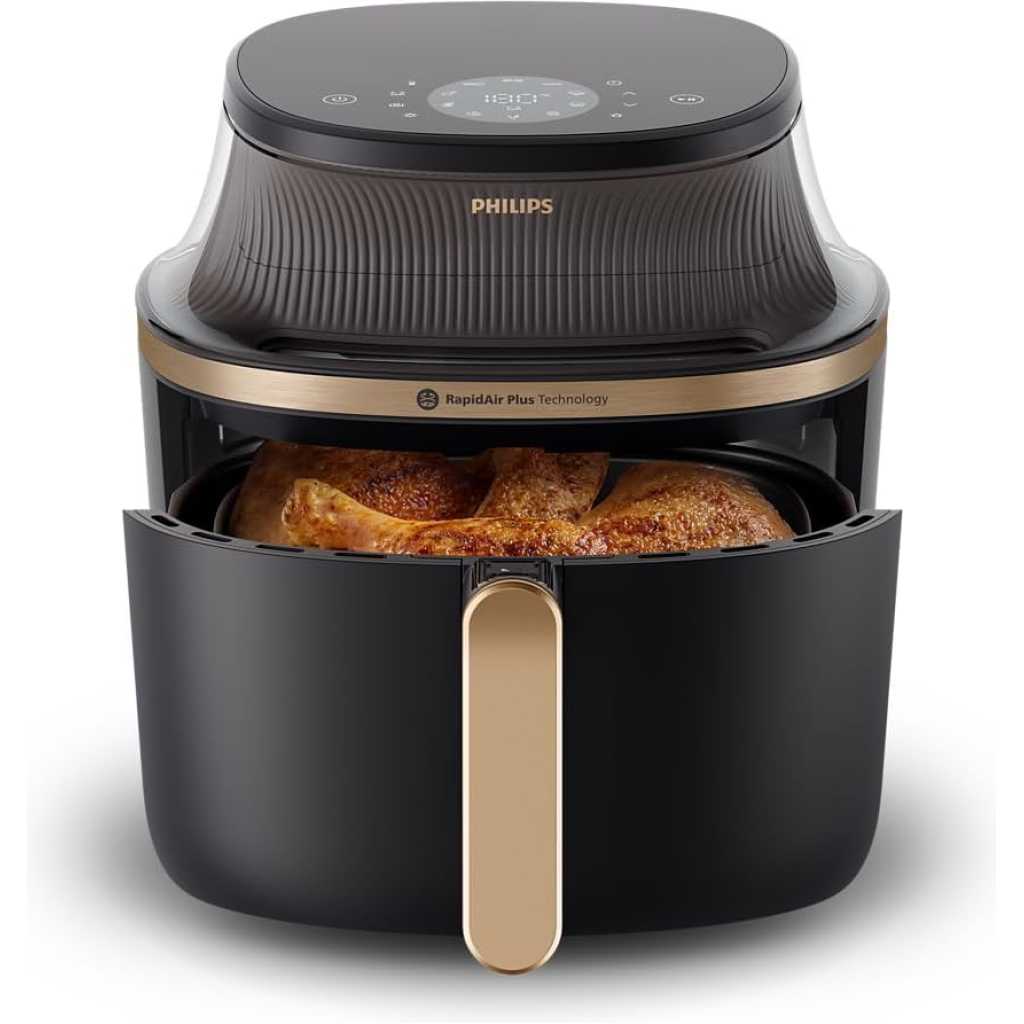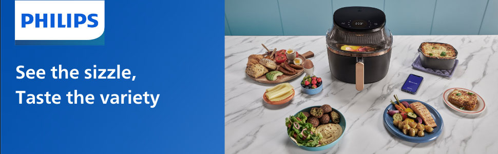 Key Features: RAPIDAIR PLUS TECHNOLOGY: Enjoy delicious food with up to 90% less fat. Patented RapidAir Plus Technology with unique star-shaped design circulates hot air around and through the food with faster airflow, ensuring even cooking inside and outside to create tasty homemade meals. COOKING WINDOW: No more guessing. Watch while you cook and see when it’s done to perfection. 6.2L CAPACITY: Enough capacity for your all family meals. Holds up to 1000 grams of veggies; 8 chicken drumsticks; 5 pieces of salmon or 7 muffins. 16 IN 1: Cooking possibilities from baking and grilling to defrosting and reheating. Settings go as low as 40℃ and as long as 24 hours for dehydrating and fermentation, too. FAT REMOVAL: Up to 40% of excess fat drips away for healthier meals with full flavor. The basket keeps food separate from the fat collected in the pan as it cooks.