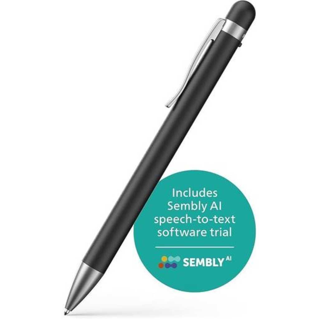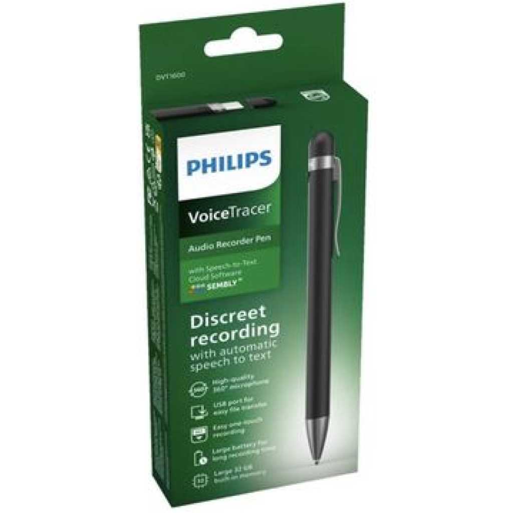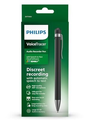 VoiceTracer DVT1600 Audio Recorder DVT1600 Discreet recording Sembly Speech-to Text Cloud Software 360° microphone One touch recording 32 GB memory Long battery life Philips Audio Recorder Pen Discreet recording with automatic speech-to-text The pen’s built-in, 360° microphone is highly sensitive and can pick up voices in clear audio quality. Perfect for recording conversations or just jotting down ideas on-the-go. Combined with Sembly’s AI Speech-to-Text Cloud Software, turn your recordings into text quickly and accurately. Upload your files to Sembly when you are back at your computer and automatically convert your recordings to text for you High-quality 360° microphone for excellent sound quality 32 GB internal memory storage for extra-long recording time Discreet design ideal for even sensitive situations Ergonomic design for comfortable writing and easy portability Automatically convert your recordings to text. Transcription available in English, German, French, Spanish, Italian Sembly AI created automatic meeting minutes, to do-lists with multi-speaker transcription for easy following up Long battery runtime for capturing even extensive meetings Highlights High-quality 360° microphone The high-quality 360° microphone delivers clear sound quality when recording notes, conversations, or meetings, at your desk or on the go. Discreet recording The Audio Recorder Pen is also incredibly discreet, making it ideal for sensitive situations where a standard recorder might be too obvious. Its compact size means it can easily fit in your pocket, briefcase, or bag, so you can take it with you wherever you go. Long battery life The pen’s rechargeable battery means you won’t have to keep buying new batteries. If the battery should run out, your recording will be saved, before the device switches itself off. One touch recording Experience effortless recording with our Audio Recorder Pen with its single button operation which makes capturing important notes and conversations a breeze. Press the button to turn the device on and start recording. The same button turns the recording off when you are done. Ergonomic design The lightweight and ergonomic design of the Audio Recorder Pen makes it perfect for carrying around with you all day and comfortable to write with. The practical clip allows you to attach it to your clothes and record hands-free. Automatic speech-to-text Put an end to tedious typing and create text documents directly from recorded audio files. Using the Sembly Speech-to-Text Software is at least three times quicker than typing up the document yourself. Simply record your notes, interviews or meetings, upload them to Sembly, and receive a written document almost instantly. Large 32 GB built-in memory With the 32 GB of built-in memory, your recorder is able to capture multiple hours of continuous recording. You will never have to worry about missing a single word in important meetings or conversations. Easy file transfer The recorder requires no special installation. Simply plug your recorder into your PC or Mac and play back your files or transfer them to your computer right away. Your recorder pen can also be used as a USB storage device. Automatic meeting minutes If you want to record meetings, Sembly Speech-to-Text Software creates automatic meeting minutes, so you can focus on your conversation and not get distracted by having to take notes. Thanks to multi-speaker identification you can clearly identify who said what. Top About this item Similar Product information From the Brand Reviews Philips DVT1600 VoiceTracer, Recording Pen, 32GB. Sembly AI trial license: transcription, AI created summaries, AI powered meeting insights What’s in the box? 6 spare ink cartridges USB-C to USB-A adapter cable Sembly voucher: transcription English, German, French, Italian, Spanish