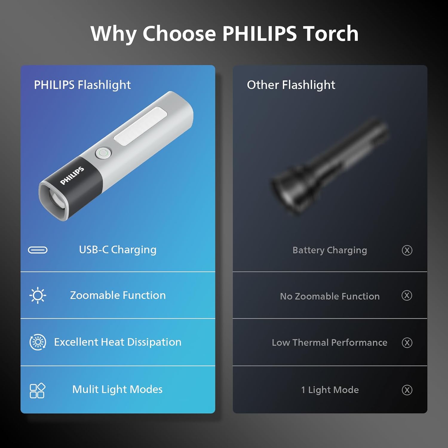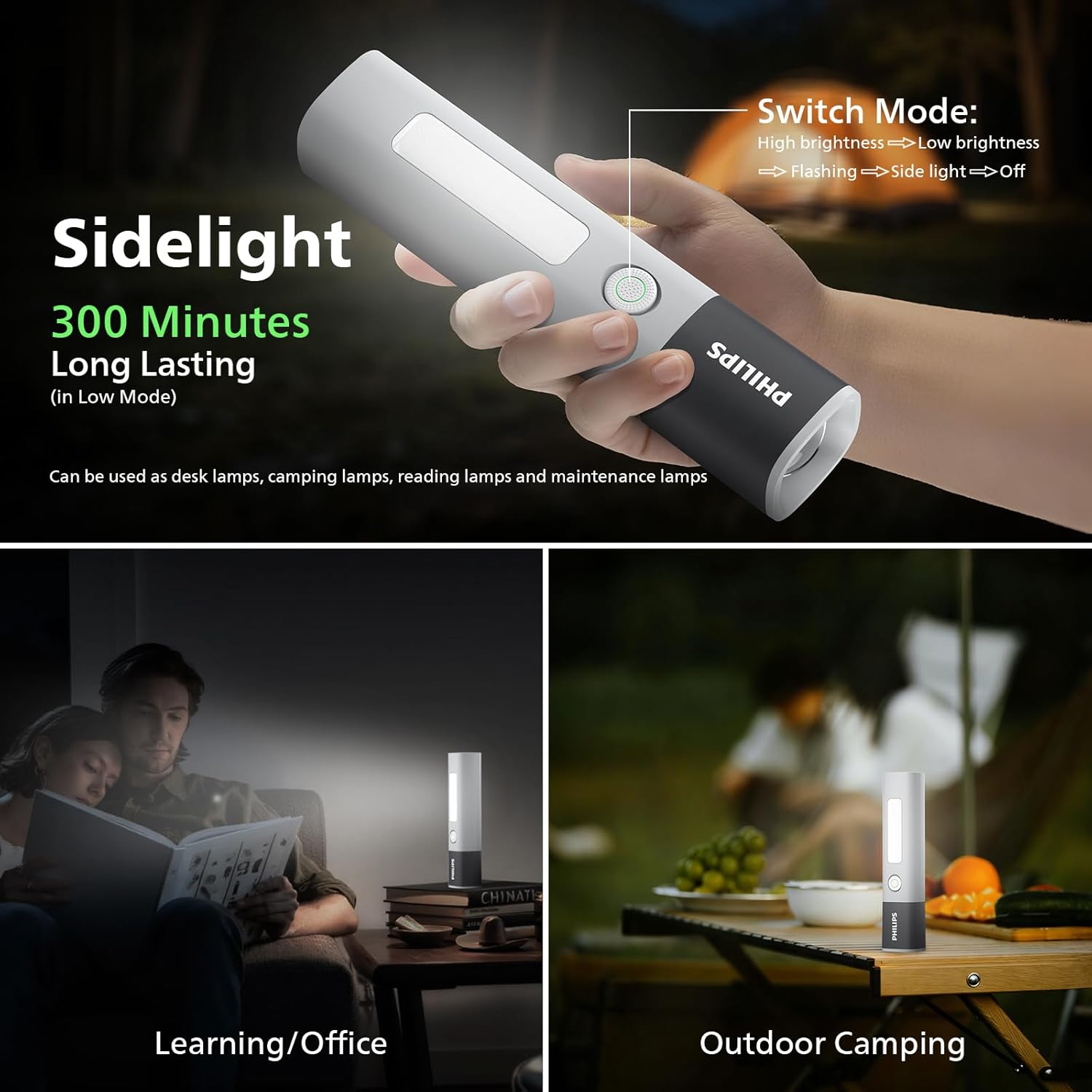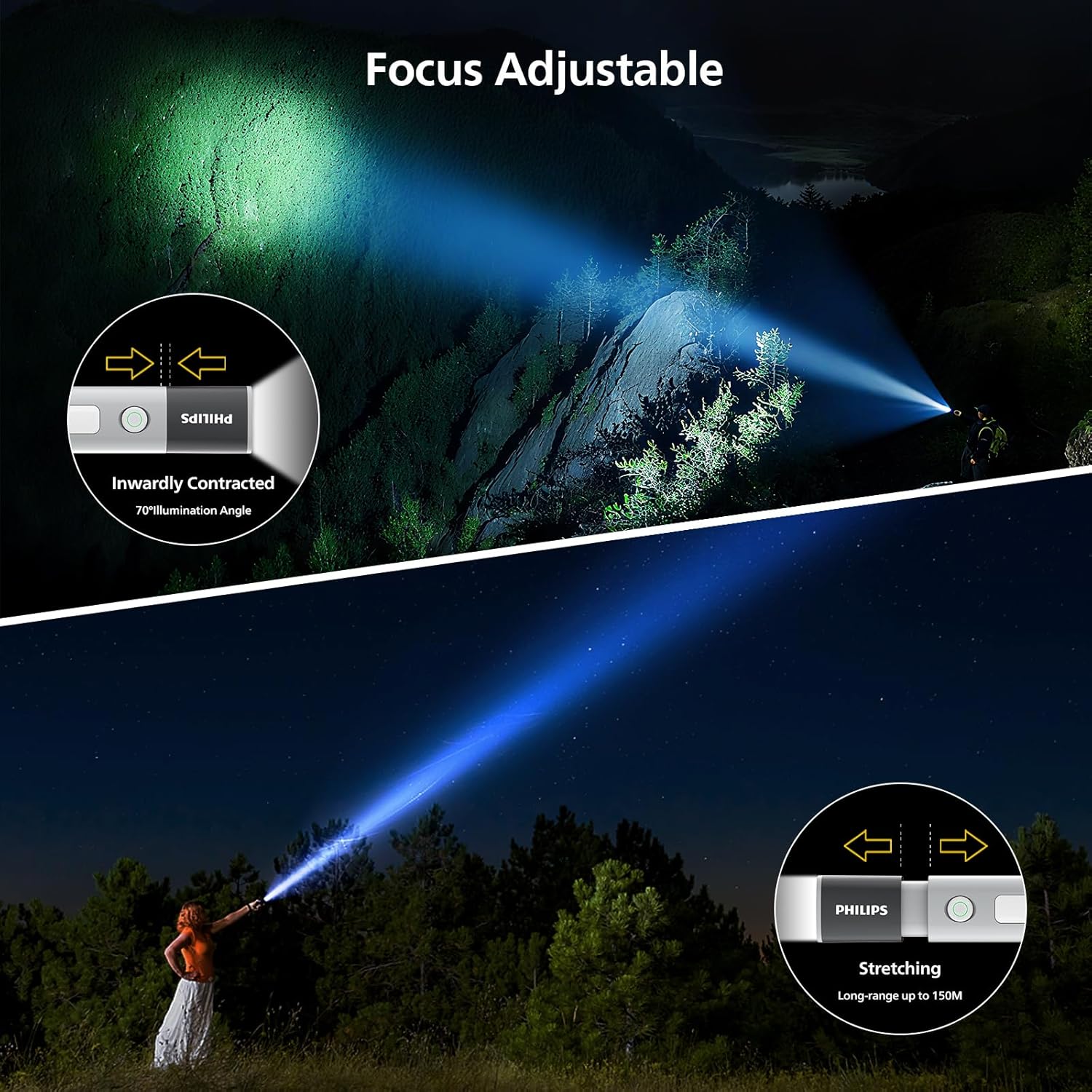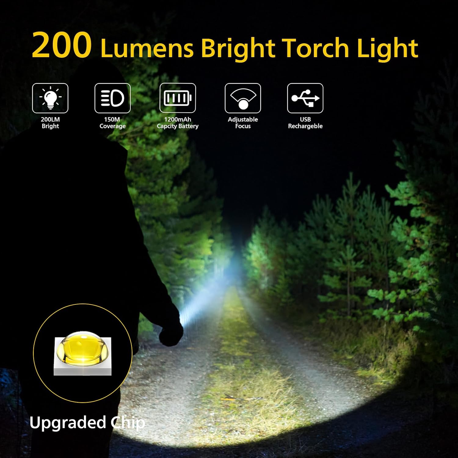【Multifunctional Flashlight】The mini flashlight design with 200lm and the led light has a maximum illumination range of 150 meters, whether you’re camping, hiking, or other indoor, outdoor activities, our super bright flashlight will provide the reliable lighting you need 【4 Lighting Modes Torch Light】Supporting flashlight normal(high/low/off light) mode, stepless dimming mode, flashing mode, SOS mode. Click to switch 1.high light mode 2.low light mode 3. flashing mode 4.side light mode, suitable for various use scenarios 【1200mAh Long Endurance】Torch light Built in 1200mAh rechargeable lithium battery, capable of illuminating for 300 minutes in low light mode&120 minutes in high light mode, paired with USB-C charging port for easy charging at any time 【Telescopic Zoom】Adjustable high and low beams, adjustable illumination range through telescopic flashlight, 150 meter long focusing beam for further illumination, 70 ° defocused short distance wide range illumination for clearer field of view. Whether focused or defocused, it can present perfect light shape 【Waterproof & Anti Drop】12 month warranty. The flashlight is made of durable ABS+PC material, high strength and good toughness, drop resistance height of 1 meter. Hidden waterproof USB-C charging port, IP44 level, waterproof and dustproof, safe and reliable 【Power Indicator Light & Anti-Slip】The remaining battery level indicator light is green for 100% -20%, red for 20% -10%, and flashing red for less than 10%. The anti slip pattern makes you grip more firmly, not afraid of bumps, compact and easy to carry, suitable for various outdoor use scenarios