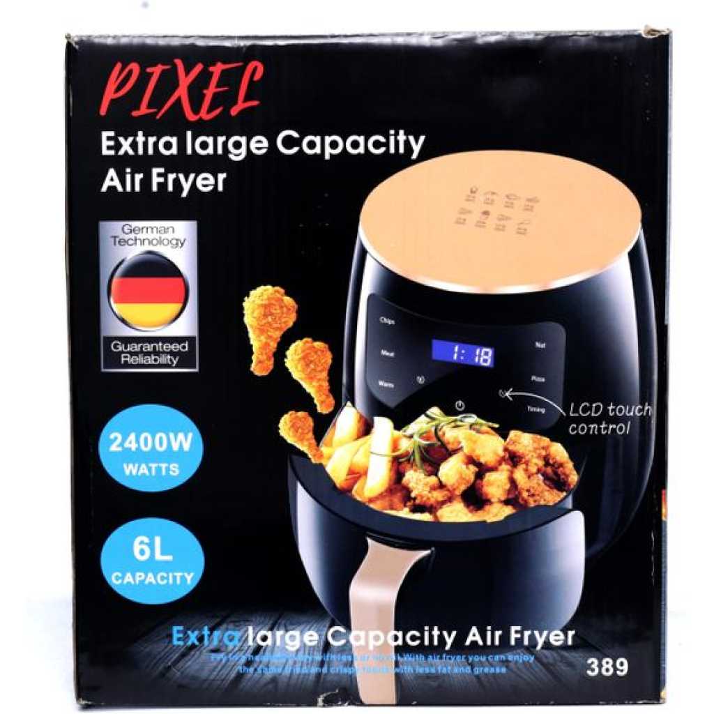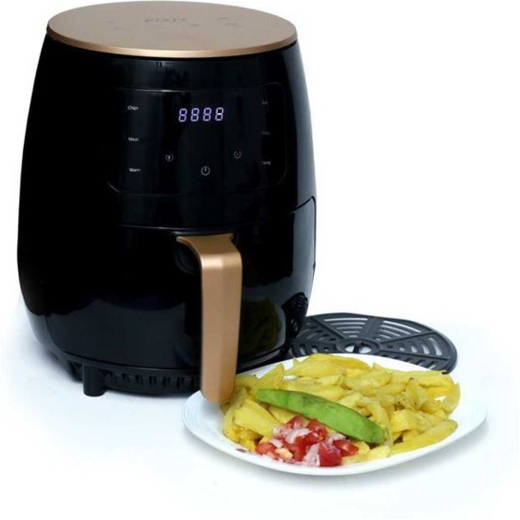 Pixel 6L Healthy Oil Free Air Fryer (6 Litres) – Black Pixel 6 Liters Healthy Oil Free This New elegant, high quality Air fryer Healthier Oil Free Fryer-Chip & Fries Maker is a guilt-free food fryer which makes everything 80 percent less fatty. It has a large capacity. This Air Dryer is a Nonstick Pan For Frying, Deep Fry, Roast, Grill and Cook as well.Air fry your favorite foods with little to no oil. Thanks to the rapid air technology in this air fryer there is no need to use excessive amounts of oil when cooking your favorite fried foods. With a one touch presets for perfectly cooked food every single time whether it’s fries, chicken, roast, steak, fish, shrimp, cheese melt or pizza. It’s Easy-to-use dual controls allow you to set temperature to 90-200 degrees and cook from 1 to 30 minutes. The simplicity helps you when following along to recipes found online or in other recipe books. Comes with a detachable basket to help transport hot foods onto plates making cooking safer for you and your family. The top has a handle that makes it easy to carry. Has an indicator light lets you know when desired temperature has been reached. Just set the dial to the desired temperature and wait a few seconds until light comes on. Make an order today for this high quality Air fryer through TilyExpress and have it delivered to your doorstep. This is an original and very durable product you can trust. It has a detouchable frying basket that eases cleaning 50% faster frying and energy saving It has 30 min timer with auto power off If you are looking to fry, grill or bake the RAF air fryer is the way to go.