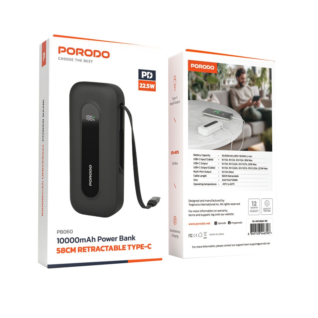 Key Features: 10000mAh,3.85V 38.5Wh Li-ion Battery Capacity Simultaneous Charging 0-60% Charging in 35 minutes 58cm Retractable Cable Length -10°C to 60°C Operating Temperature 5V/3A, 9V/2.22A, 12V/1.67A, 10V/2.25A, 22.5W Max USB-C Output (Cable) 5V/3A, 9V/2.22A, 12V/1.67A, 20W Max USB-C Output 5V/3A, 9V/2A, 12V/1.5A, 18W Max USB-C Input 5V/3A (Max) Multi-Port Output Premium Quality Durable