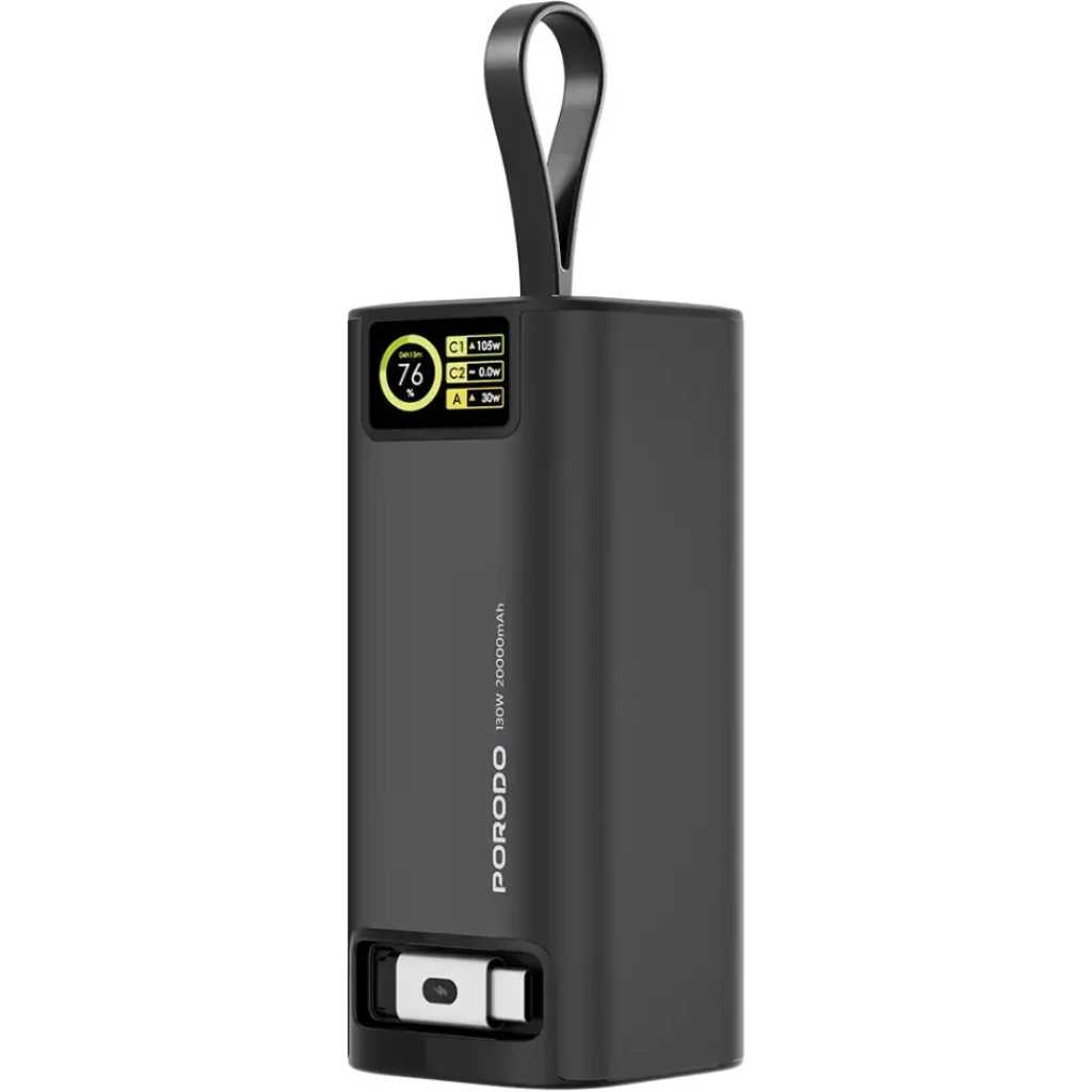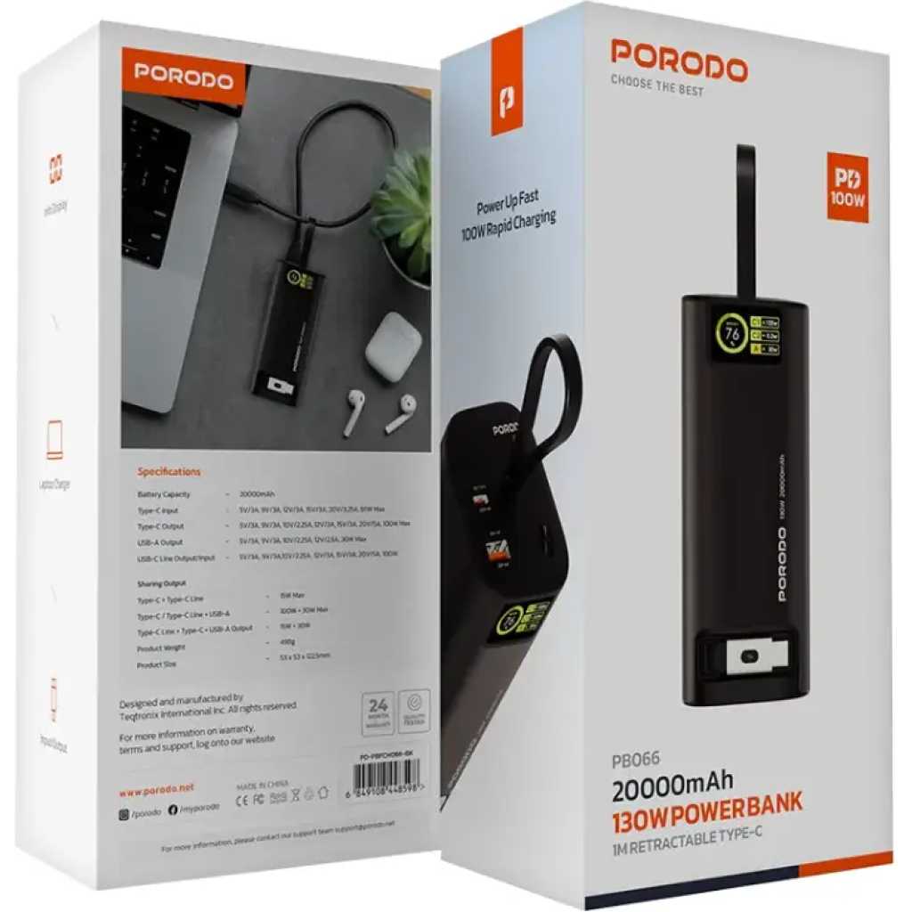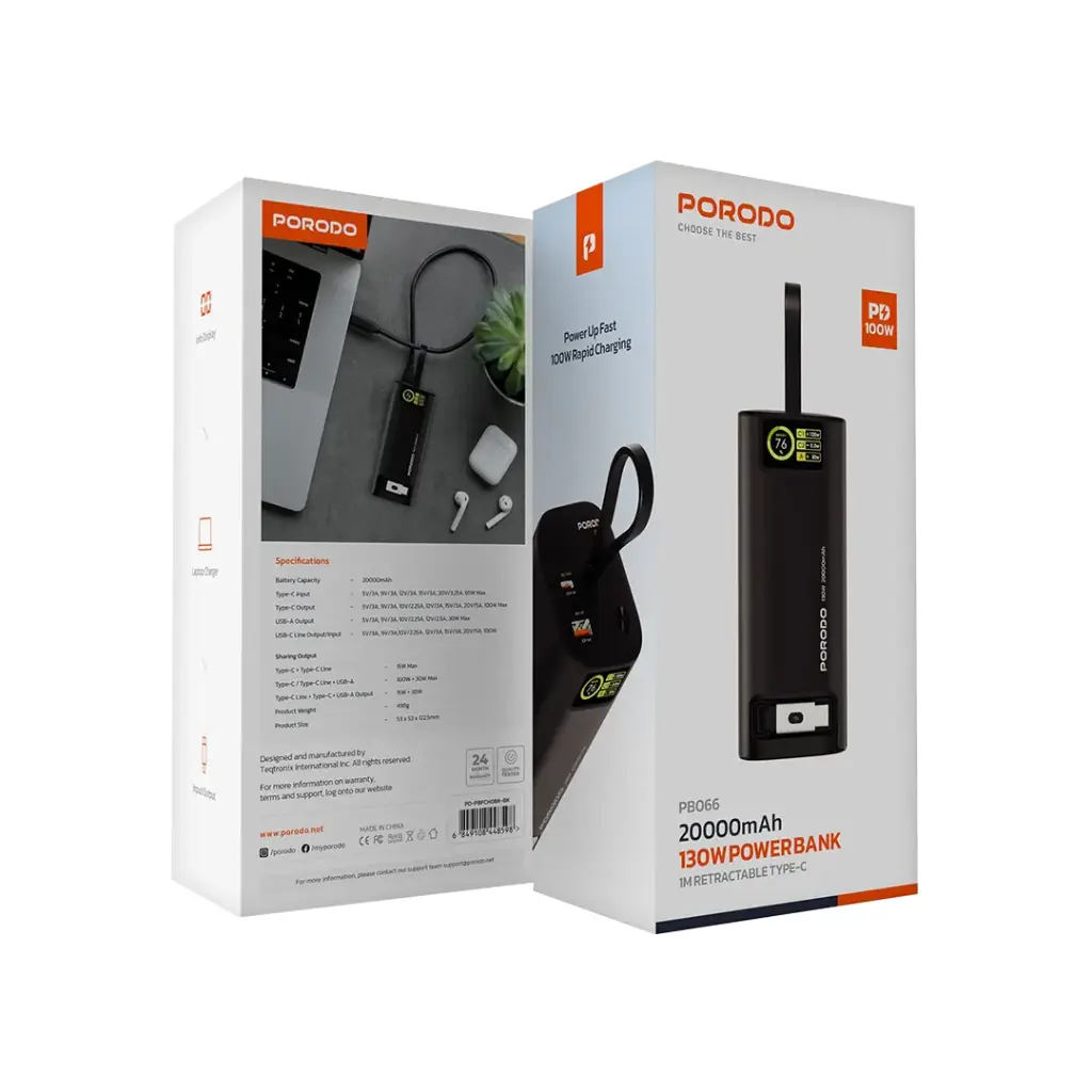 The Porodo 20000mAh 130W Power Bank is a high-performance, versatile charging solution designed to cater to a wide range of devices. With a model number of PB066, this power bank features a Type-C input capable of 5V/3A, 9V/3A, 12V/3A, 15V/3A, 20V/3.25A, supporting a maximum of 65W for fast recharging. Its Type-C output delivers an impressive 5V/3A, 9V/3A, 10V/2.25A, 12V/3A, 15V/3A, and 20V/5A, with a maximum of 100W, making it suitable for quick charging of high-power devices. The power bank also includes a USB-A output with power options of 5V/3A, 9V/3A, 10V/2.25A, and 12V/2.5A, supporting up to 30W of power for compatible devices. The Type-C line output/input provides 5V/3A, 9V/3A, 10V/2.25A, 12V/3A, 15V/3A, and 20V/5A at 100W, ensuring fast power delivery to devices that require more demanding charging. With a large 20000mAh battery capacity, this power bank provides ample power for extended use. It comes with a 1-meter retractable Type-C cable that supports both input and output, adding to its flexibility and convenience. The power bank also features an information display, making it easy to monitor charging status. It can be used to charge laptops and supports simultaneous output via Type-C and USB-A ports, providing 15W and 30W respectively. The Type-C/Type-C Line and USB-A output can deliver 100W and 30W, while the Type-C + Type-C Line can handle up to 15W. With rapid PD 100W charging, this power bank ensures that your devices charge quickly and efficiently.