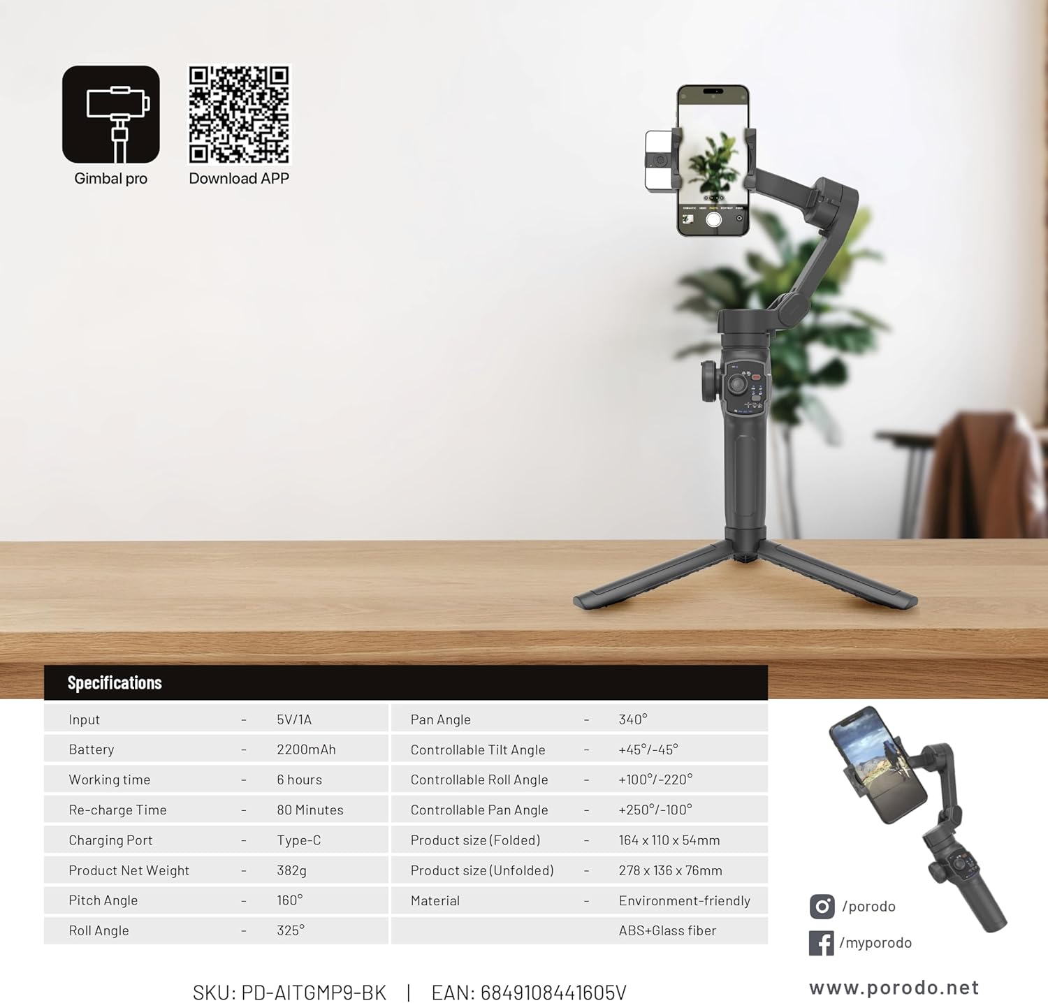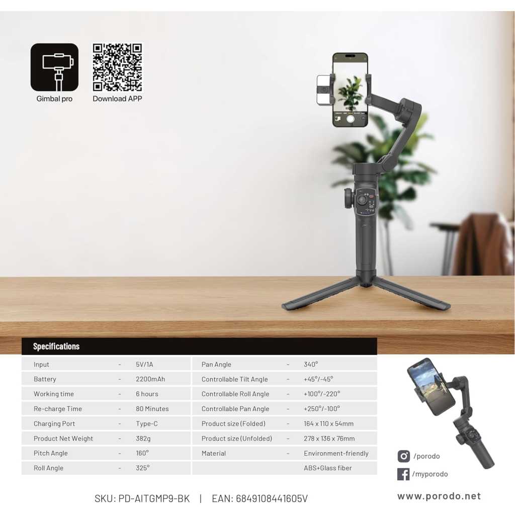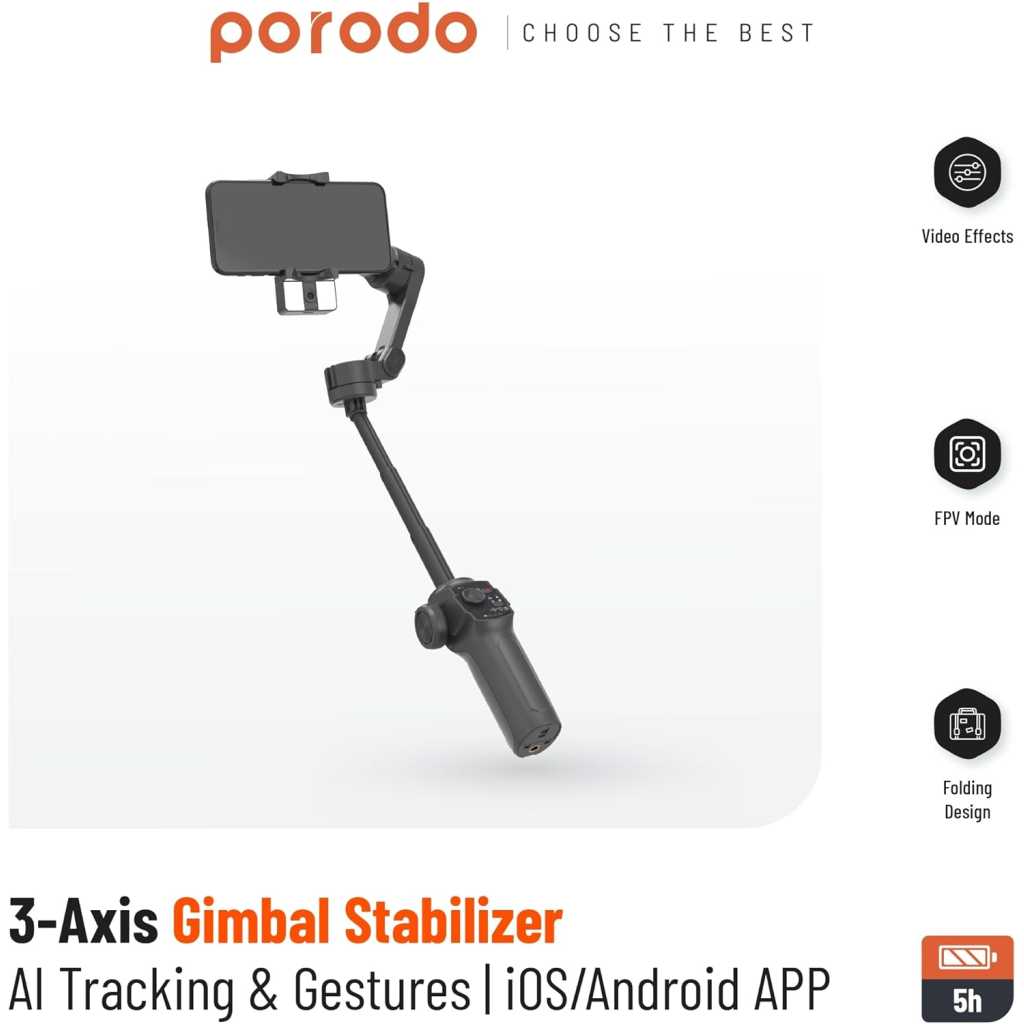 Introducing the Porodo 3-Axis Gimbal Stabilizer, where modern science and creative videography meet. Get fluid dynamic photos with powerful AI tracking and gesture control. With a variety of video effects, including the FPV mode, the specialized iOS/Android app improves your filmmaking. Stability on different surfaces is provided by a special 3-Legged support. Its foldable form makes it portable, and the built-in extension rod, which can extend up to 170mm, enables a wide range of shooting angles. The stabilizer has a robust 2200mAh battery that offers 6 hours of continuous use and quickly recharges through a Type-C connector in only 80 minutes. This gimbal is made of environmentally friendly ABS and glass fiber, making it both lightweight and durable. The Porodo 3-Axis Gimbal Stabilizer will take your videography to new levels of cinematic perfection.
