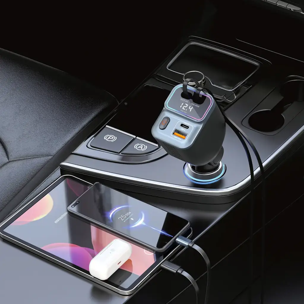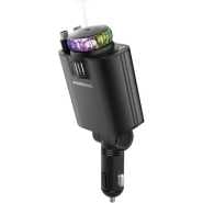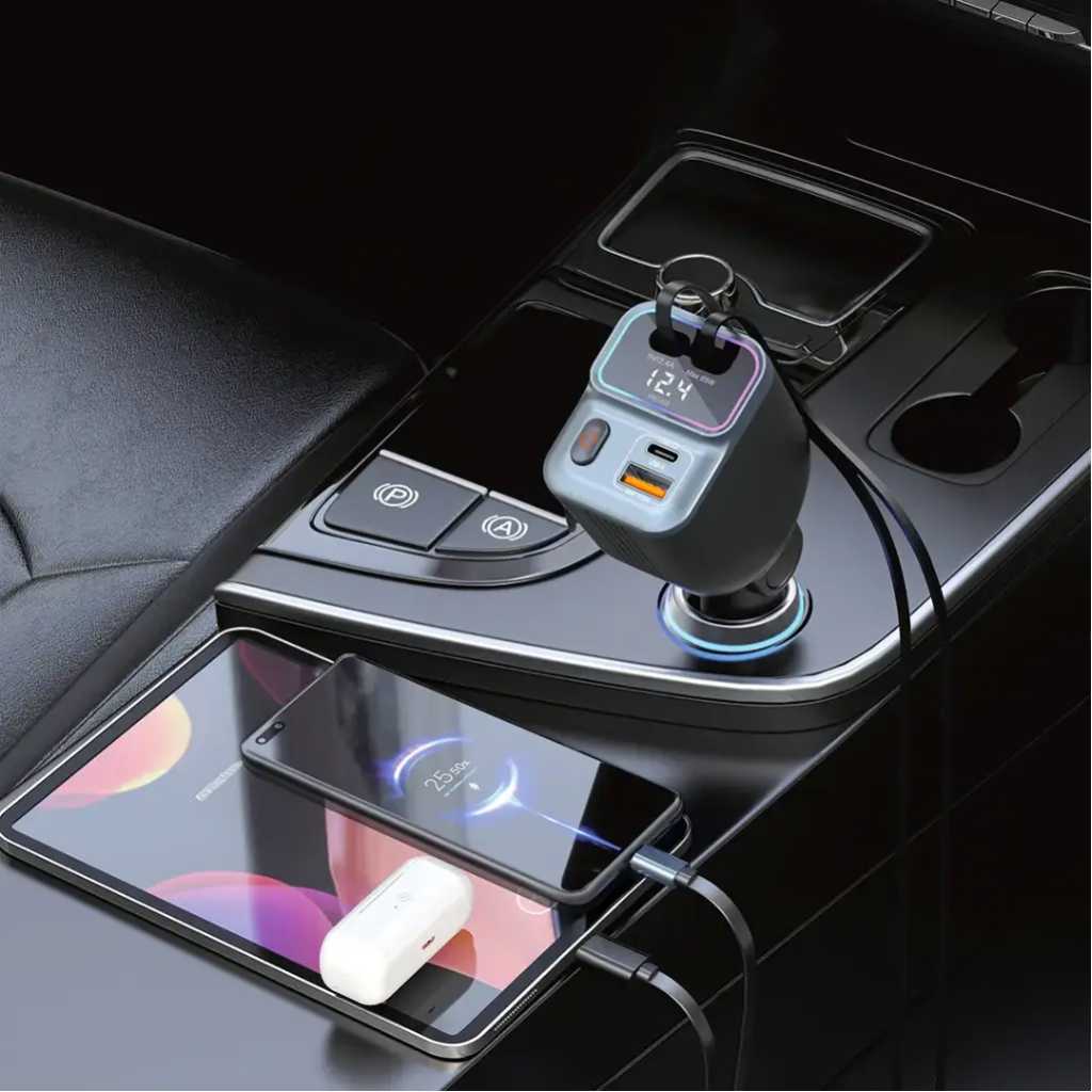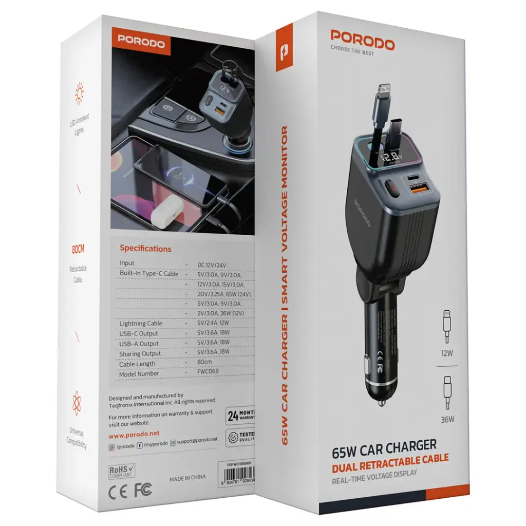 charging your devices on the go. Designed with convenience in mind, this charger features two built-in retractable cables: one Type-C and one Lightning, ensuring compatibility with a wide range of devices. The 80 cm cable length provides flexibility, while the sleek, compact design makes it easy to store and use in your car without clutter. This car charger offers multiple output options, including USB-C, USB-A, and sharing outputs, delivering fast charging speeds of up to 65W (for Type-C) and 18W (for USB). The real-time voltage display and LED ambient lights add a modern touch, allowing you to monitor the charging status with ease while driving. It’s built to support both 12V and 24V input, ensuring it’s suitable for most vehicles. With built-in safety features and universal compatibility, the Porodo 65W Car Charger is an essential accessory for your car. Whether you’re powering your phone, tablet, or other devices, this charger delivers fast, reliable performance. Its durable construction and efficient design make it a must-have for tech-savvy drivers who need to stay connected while on the road.