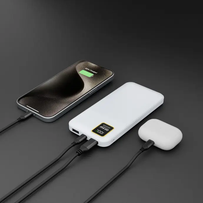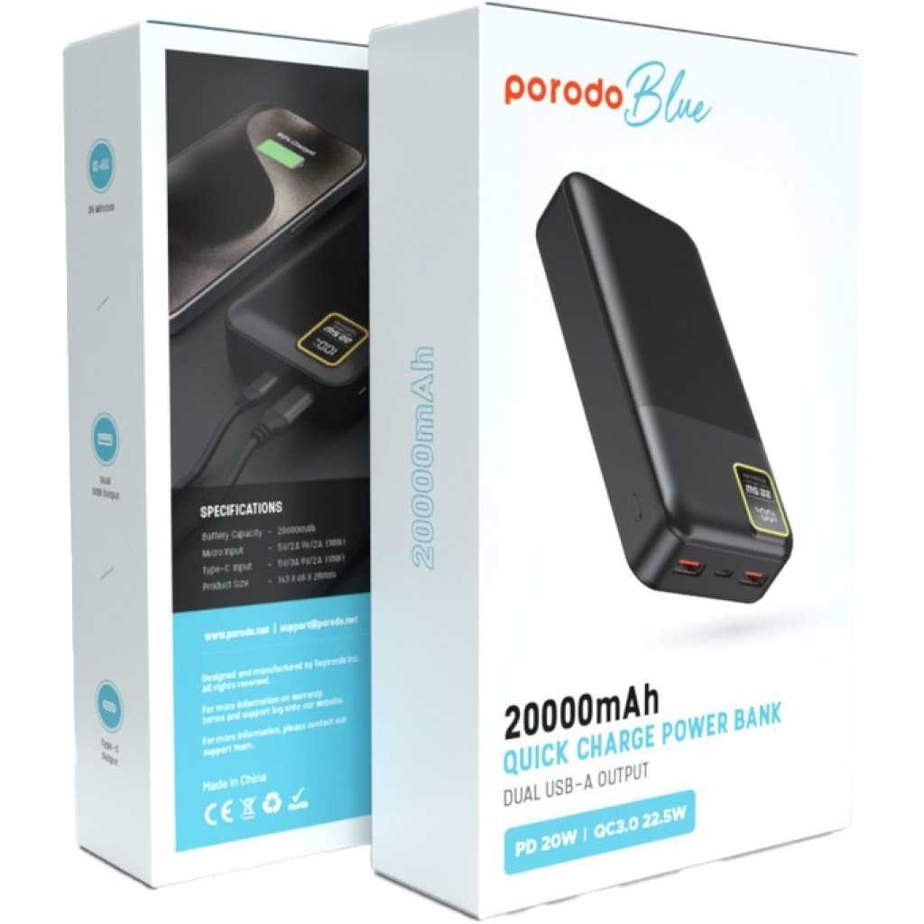 Porodo Blue power bank provides you with a fast 20W power delivery, taking only 35min to charge from 0% to 65%. Its 22.5W dual QC 3.0 USB-A output makes it super easy to fully charge your gadgets, and it comes with a long-lasting 10000mAh battery capacity. It also features a small digital display to show the battery status. Having a lightweight and catchy design, it enables you to easily carry it on your travels or wherever you go, while looking smart and stylish.