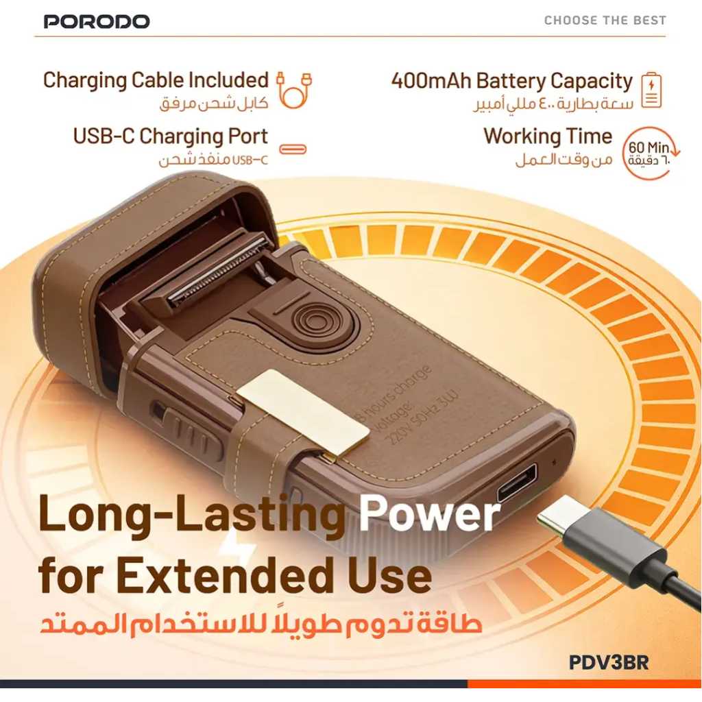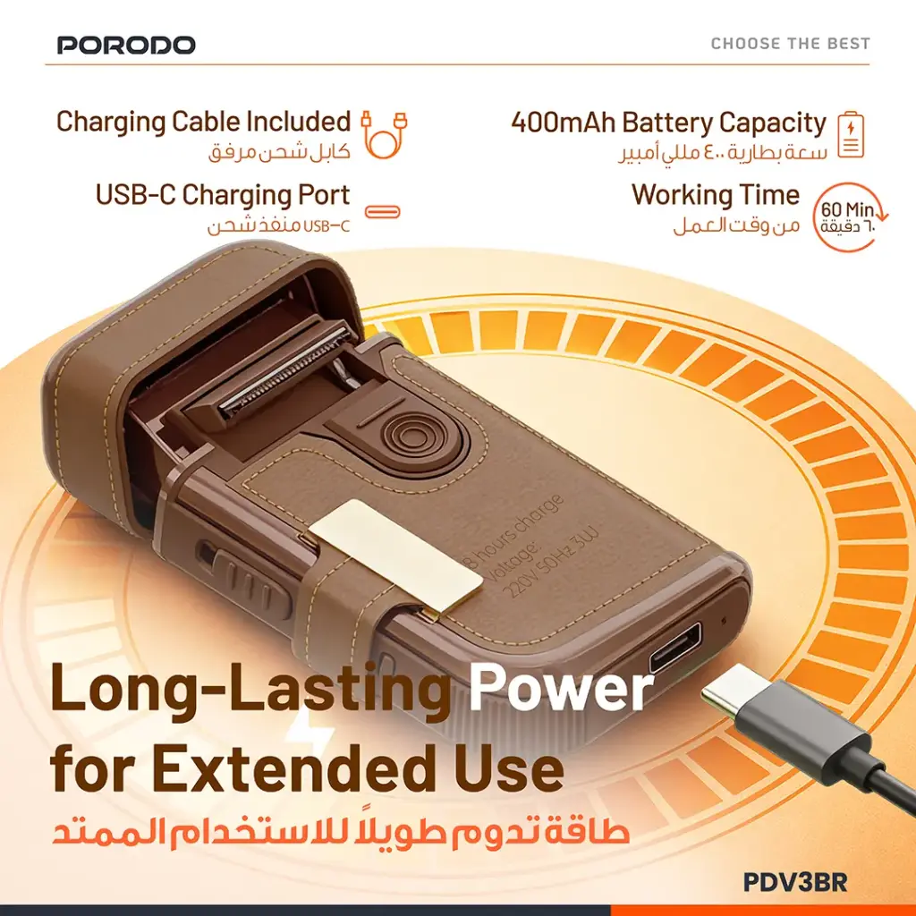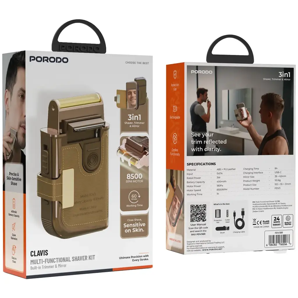 Porodo Clavis Multi-Functional Shaver Kit with Built-In Trimmer & Mirror, 180Pa Motor Power, 8500RPM Motor Power, 60 Minutes Working Time, 400mAh Battery Capacity, Brown