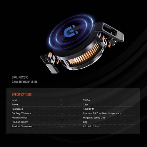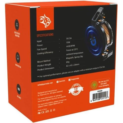 Stylish RGB LED Lighting: The cooling device also features RGB LED lights, adding a stylish touch to your gaming setup. You can customize the lighting to match your preferences. This adds an extra layer of visual appeal while keeping your phone cool. Powerful Performance: Running on a 5V/3A input, the cooling system delivers consistent cooling power. It ensures your device stays cool even at high ambient temperatures of up to 25°C. This means you can game without worrying about performance drops due to heat. User-Friendly Design: The device features removable and rotating clips, making it easy to attach or adjust for your comfort. Its detachable front cover allows for easy cleaning, keeping the cooling system in top shape. This thoughtful design makes it simple to maintain and use Easy Mounting Options: You can attach this cooling device in two ways. It easily snaps on for wide range of devices as it is compatible with MagSafe. For other phones that does not have this technology, a spring clip securely holds the device in place. Effective Cooling Technology: The Porodo Gaming Freezing Semiconductor Mobile Cooling device uses a 15W semiconductor system to keep your smartphone cool. This technology ensures your phone stays at the right temperature during long gaming sessions. With a 4400 RPM fan, it efficiently moves air to prevent overheating.