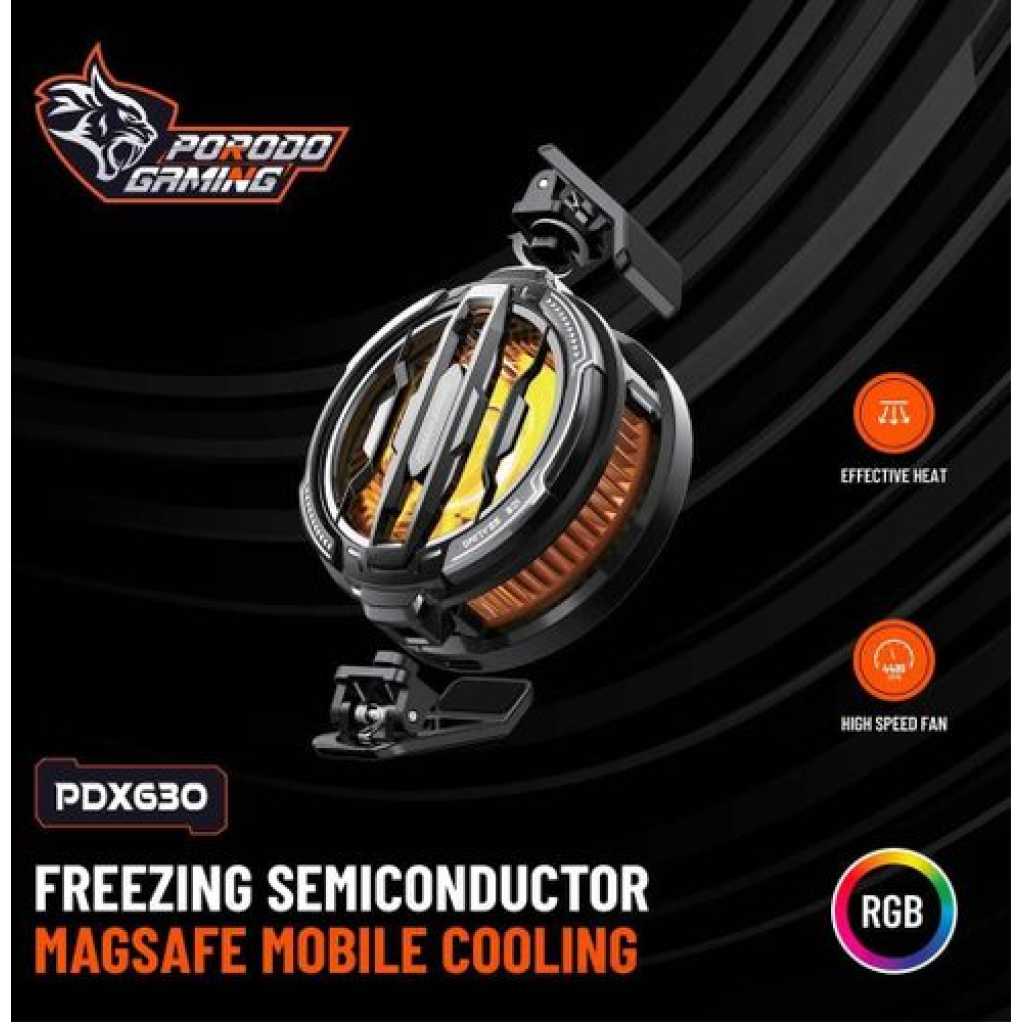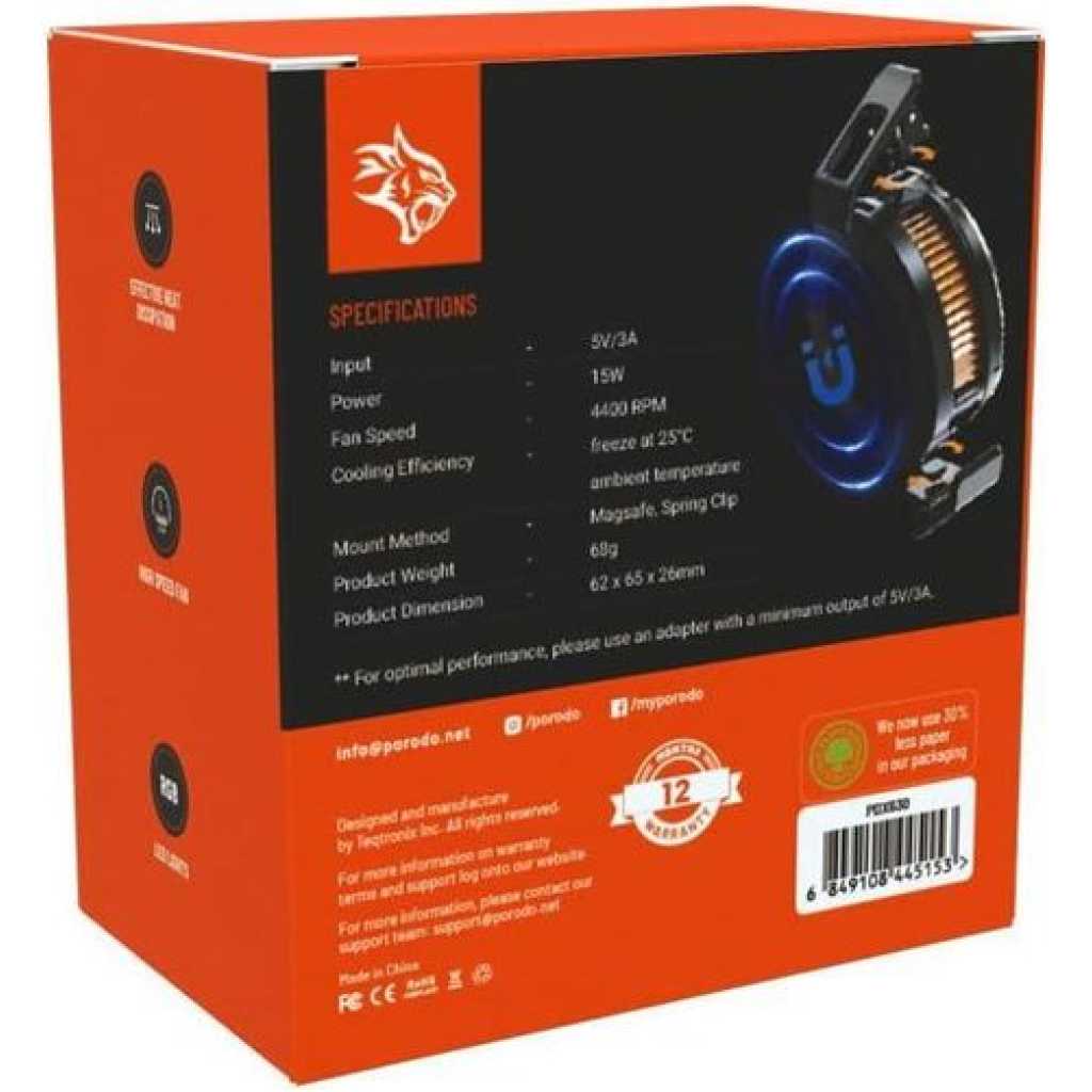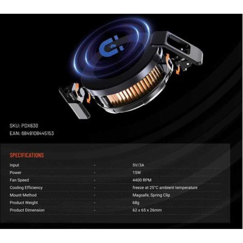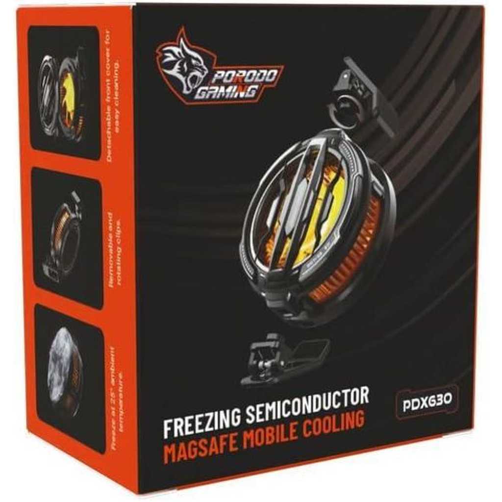 Porodo Gaming Wireless Charging Phone Cooler 15W, 6000RPM, Freeze at 25° Ambient Temperature Compatible with MagSafe Gaming Freezing Semiconductor, Removable and Rotating Clips, High Speed Fan, RGB LE