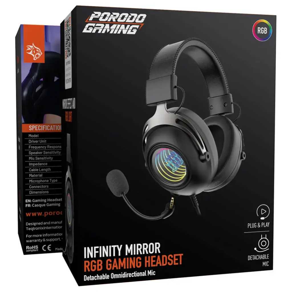 Key Features: Precise Audio Delivery: Immerse yourself in a new level of sound performance with the 50mm dynamic audio drivers engineered to produce deep bass, balanced mids, and crisp treble. With a frequency response of 20Hz–20kHz, this headset delivers every sound cue, from subtle footsteps to explosive effects with clarity and precision, giving you the competitive advantage you need in every game. Infinity Mirror RGB Lighting: Enhance your gaming station with Infinity Mirror RGB lighting that creates a futuristic and dynamic visual display. The reflective mirror effect amplifies the RGB glow, transforming your setup into a captivating environment that reacts to your mood and gameplay atmosphere, perfect for streamers, competitive gamers, and aesthetic enthusiasts alike. Detachable Microphone with Quick Mute: Stay in full control of your communication with the detachable omnidirectional microphone, designed for accurate voice pickup and background noise reduction. The quick-mute button allows instant muting during live sessions or calls, while the adjustable mic boom ensures optimal positioning for consistent clarity in team chats or streaming commentary. Ergonomic Design & Premium Build: Built with an aluminum alloy frame for durability and soft, breathable ear cushions, this headset offers long-lasting comfort even during extended gaming sessions. Its adjustable headband evenly distributes pressure, reducing fatigue and enhancing the fit for all-day wear, making it ideal for marathon gamers, content creators, or professional streamers. Multi-Platform Connectivity: Enjoy seamless compatibility across multiple platforms with dual 3.5mm audio and mic connectors, along with a USB-A plug for RGB illumination. No matter where you’re gaming on, Porodo Infinity Mirror RGB Headset is compatible with PS5, PS4, Xbox, PC, or even mobiles, and it ensures consistent, high-quality sound output and vibrant lighting no matter your setup. What You Get: Porodo Infinity Mirror RGB Headset, 24-Hour Customer Service, Lifetime Technical Support and Free 12 + 12 Months Warranty.