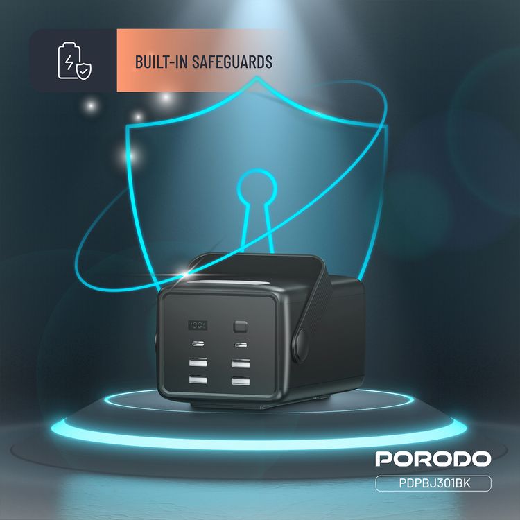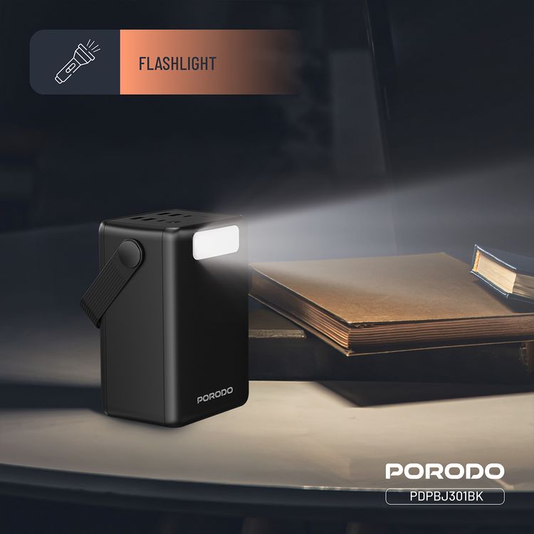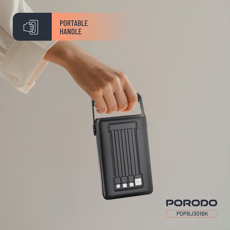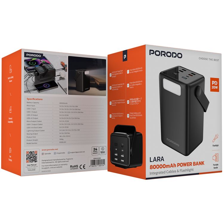 The Porodo Lara 80000mAh Power Bank with Integrated Cables & Flashlight is the perfect companion for those who need reliable, high-capacity power on the move. This power bank has a strong 80000mAh battery . So, your devices will stay charged all day, even during your busy schedule. Providing up to 20W Max power for rapid charging, it has several USB-A outputs , a USB-C input , and a micro input , among other flexible charging options. Charge your devices with ease. Use the built-in USB-C, Micro USB cables, and Lightning Output —no extra cords required. The Sharing Output feature lets you charge many devices at once with a maximum capacity of 5V/3A , or 15W . When you need illumination in dimly lit areas, the built-in flashlight is a useful tool . The Porodo Lara Power Bank is essential for all your charging needs. It offers power, portability, and convenience whether you’re working, traveling, or exploring.