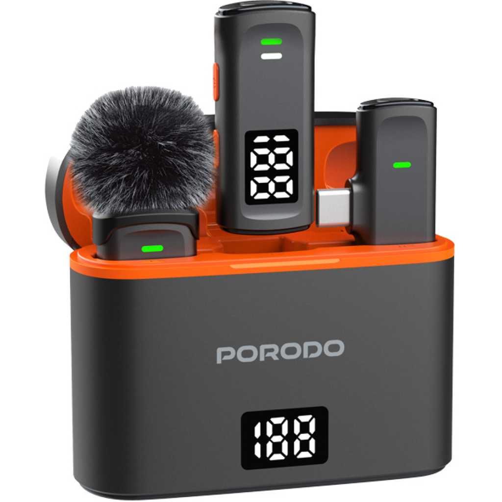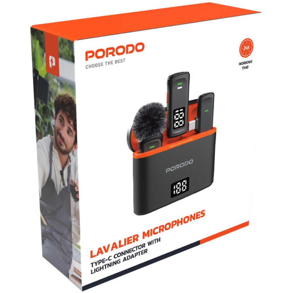 The Black Porodo Lavalier Microphone is designed to capture clear and crisp audio. Its convenience and versatility stand out due to its Type-C connector and Lightning adapter, which allow it to work with a wide range of devices. This microphone comes with a 600mAh charging case, ensuring confidence during long recording sessions, capturing every moment. Its low latency technology ensures perfect audio transmission for live streaming, vlogging, or podcasting. The magnetic clips make it easy to attach the microphone to your clothing for convenient on-the-go recording. With an SNR of 75dB, it provides crystal-clear audio and effectively reduces background noise for professional recording. The Porodo Lavalier Microphone offers up to 8 hours of work time for all your audio recording needs. With a sensitivity of -38dB ± 3dB, it effectively captures various ranges of sounds with clarity. Discover the perfect sound recording with the ultimate Porodo Lavalier Microphone, featuring superb sound quality, comfort, and compatibility for all your recording needs.