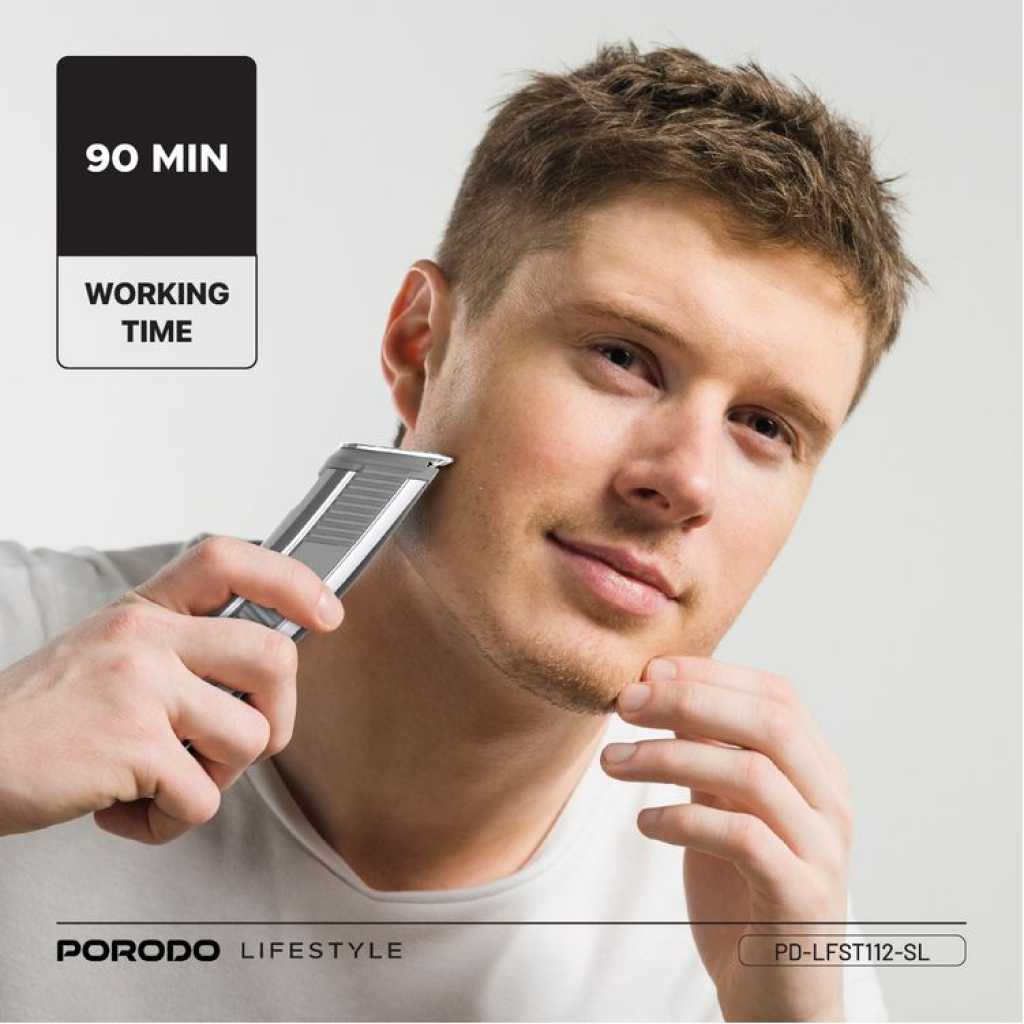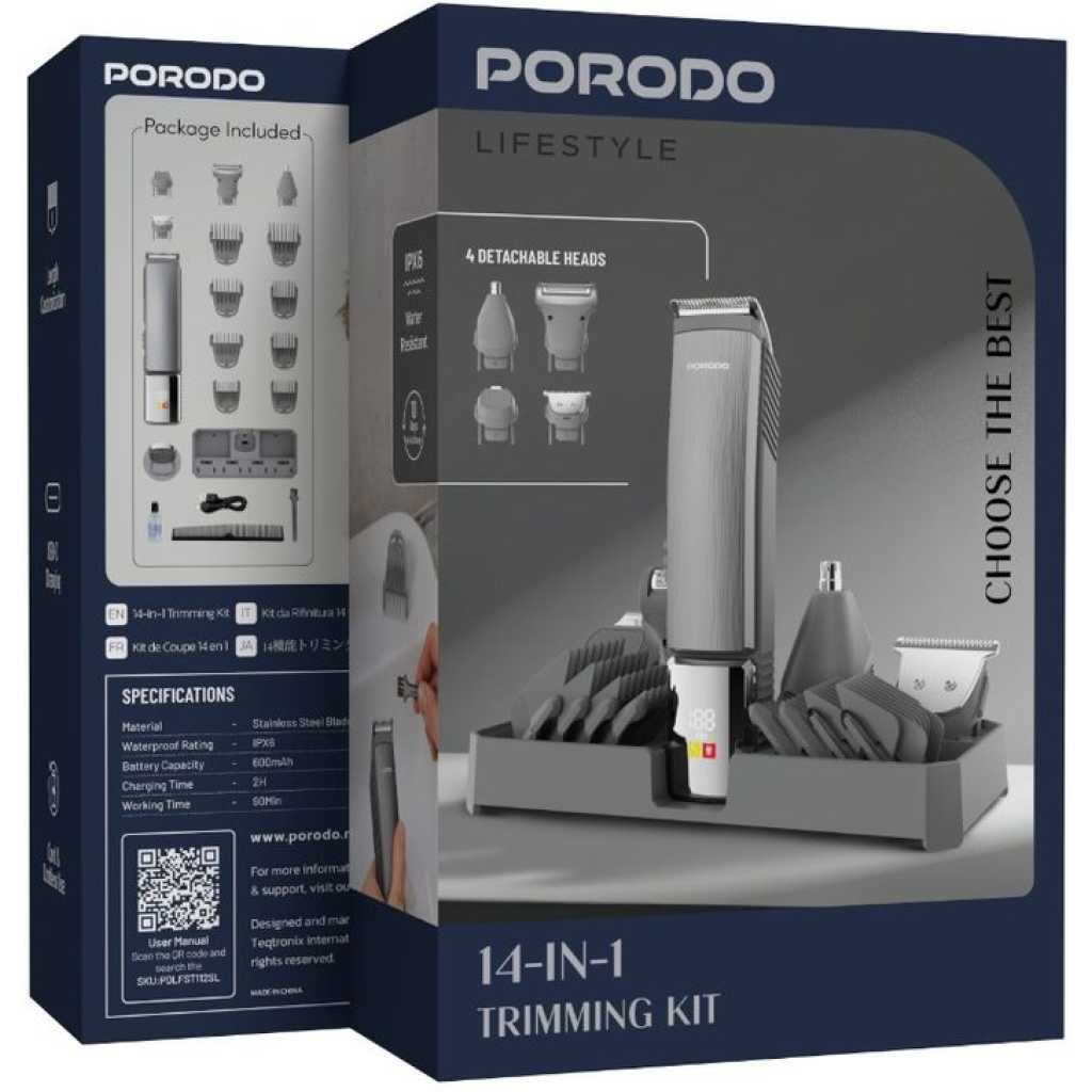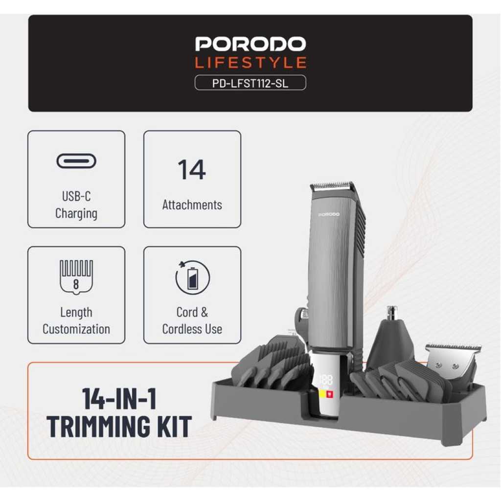 The Porodo 14 in 1 Trimming & Grooming Kit for Hair, Beard & Body (Model Number: LFS112) is a highly versatile grooming solution designed to cater to a wide range of needs. It features a selection of guide combo lengths, including 1mm, 2mm, 3mm, 5mm, 6mm, 7mm, 9mm, and 12mm, allowing for precise customization of your trim. Crafted with stainless steel blades and durable PC/ABS material, this trimmer provides a sharp and efficient performance for both hair and body grooming. With 14 attachments, this kit is suitable for all types of grooming tasks, whether for hair, beard, or body care. Powered by a 600mAh battery, it offers a working time of up to 90 minutes after a full charge. The trimmer features an IPX6 waterproof rating, allowing for easy cleaning and maintenance, even under running water. Its USB-C charging port offers convenience, and the charging time is quick, taking only 2 hours to fully recharge. Designed for both corded and cordless use, this kit offers flexibility and convenience, making it a reliable companion for all your grooming needs.