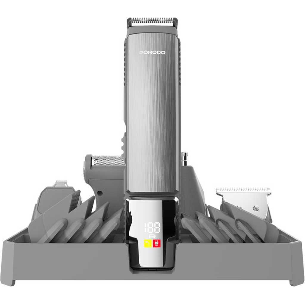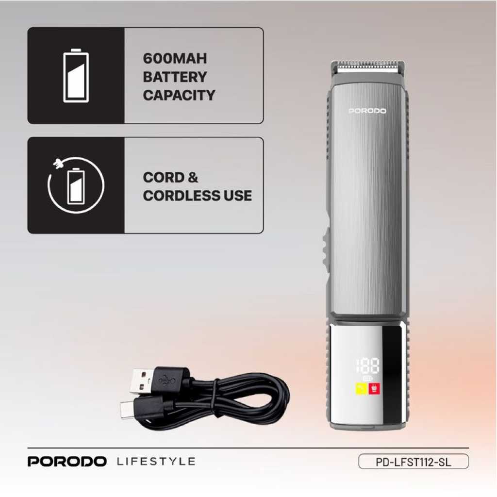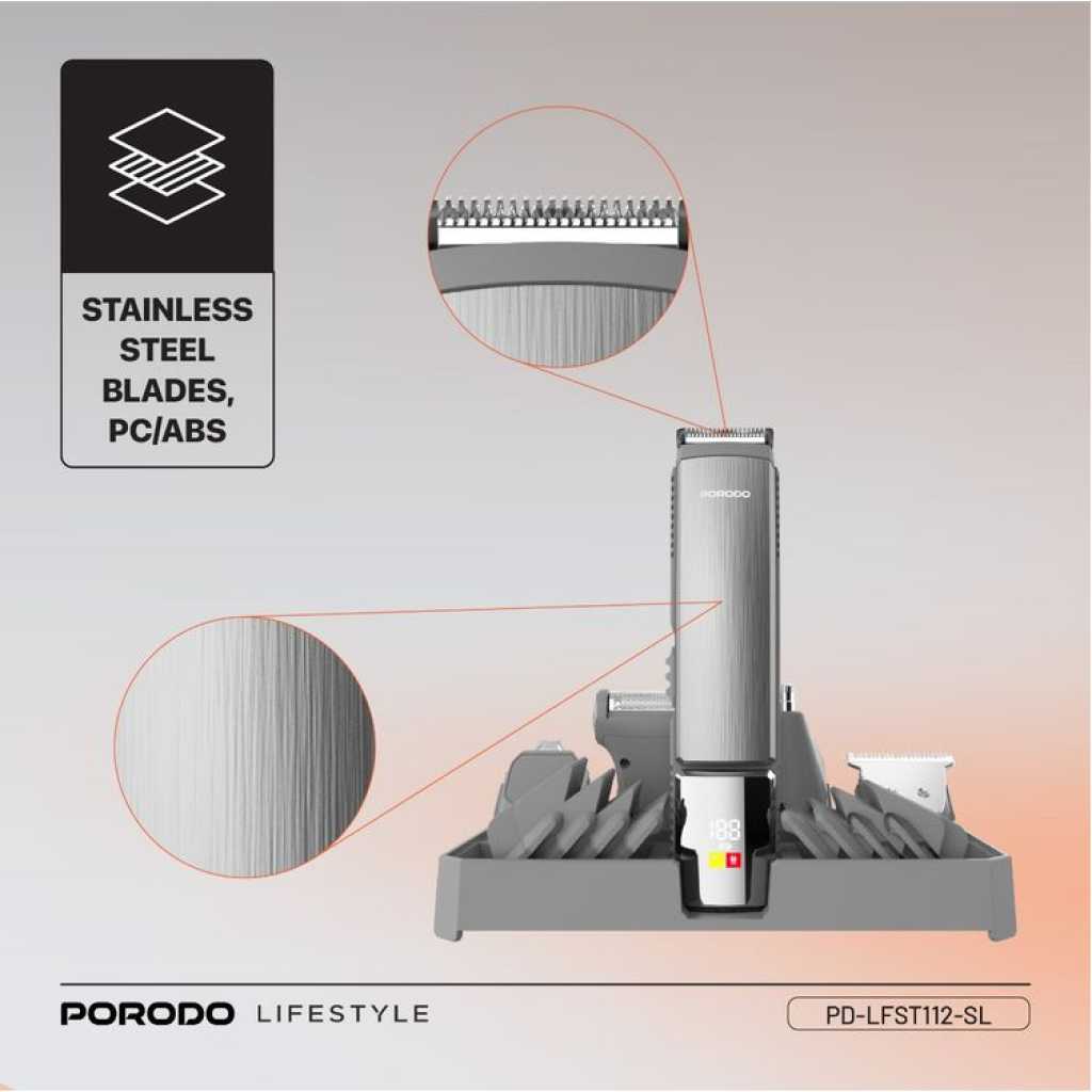 The Porodo 14 in 1 Trimming & Grooming Kit for Hair, Beard & Body (Model Number: LFS112) is a highly versatile grooming solution designed to cater to a wide range of needs. It features a selection of guide combo lengths, including 1mm, 2mm, 3mm, 5mm, 6mm, 7mm, 9mm, and 12mm, allowing for precise customization of your trim. Crafted with stainless steel blades and durable PC/ABS material, this trimmer provides a sharp and efficient performance for both hair and body grooming. With 14 attachments, this kit is suitable for all types of grooming tasks, whether for hair, beard, or body care. Powered by a 600mAh battery, it offers a working time of up to 90 minutes after a full charge. The trimmer features an IPX6 waterproof rating, allowing for easy cleaning and maintenance, even under running water. Its USB-C charging port offers convenience, and the charging time is quick, taking only 2 hours to fully recharge. Designed for both corded and cordless use, this kit offers flexibility and convenience, making it a reliable companion for all your grooming needs.