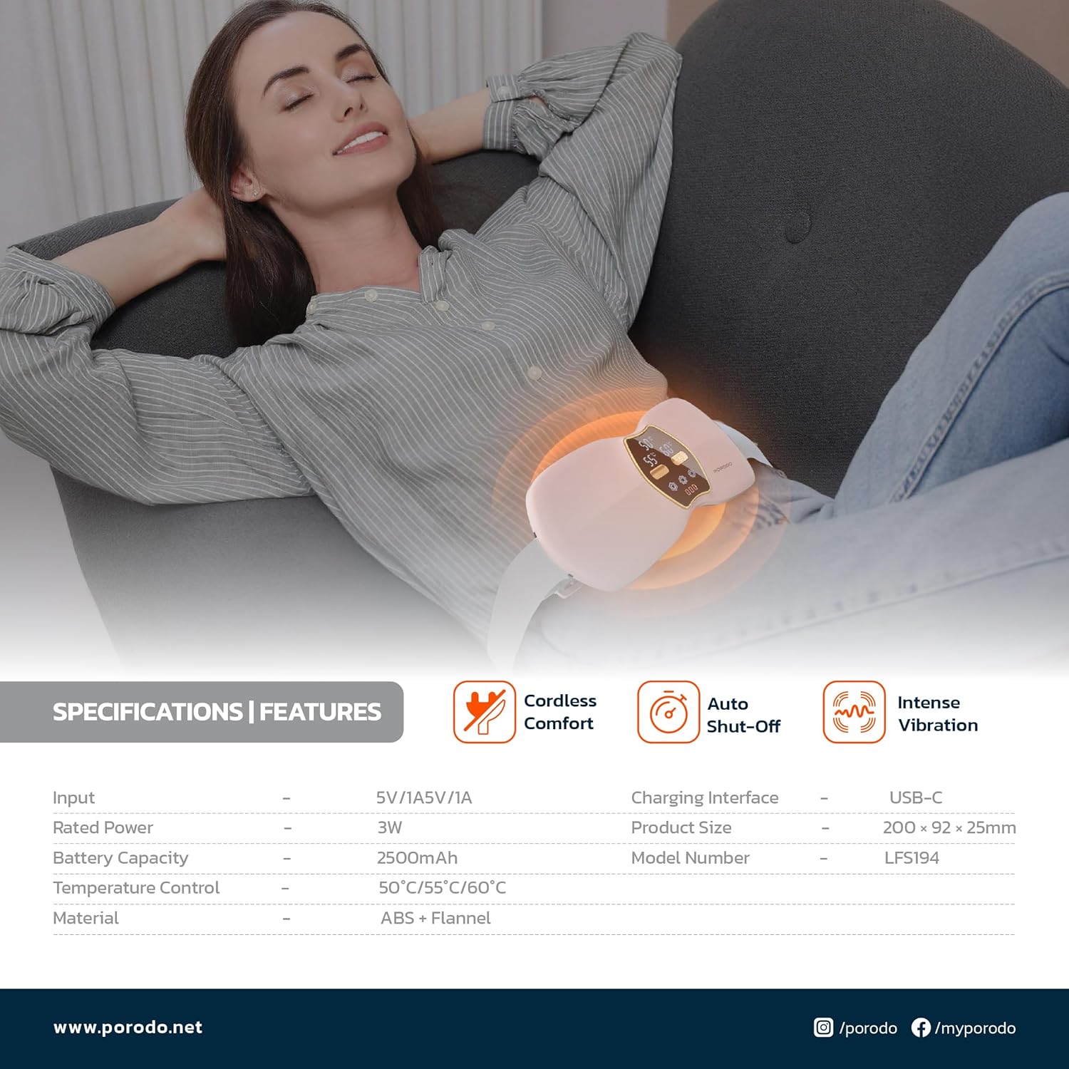 Key Features: Digital Display: The digital display on the product provides real-time information on its temperature settings, showing both the current and adjustable temperature in Fahrenheit. It is designed for easy visibility, helping users monitor the settings while in use. The display also features icons for control settings like the warm and vibration switches, offering intuitive management for a personalized experience. Charging Interface: The charging interface allows the device to be powered up when not in use. Positioned conveniently, it ensures straightforward charging, making it easy for users to keep the product ready for the next use without hassle. The interface is designed to accommodate efficient and secure charging to maintain the device’s performance. Dual Therapy (Heat & Vibration): The product is designed to use two methods to calm your muscle tension, promoting relaxation, and relieving pain, all while ensuring ultimate ease of use. 3 Heat Levels: This versatile pad offers three adjustable temperature settings to meet your needs: 122°F (50°C) for daily warming 131°F (55°C) for period nursing 140°F (60°C) for cramps and pain relief. Adjustable Strap: The Strap of the Heat & Wave Waist Belt is totally adjustable to your size whether you’re using it for your back or belly. The pad will easily fit around different body areas, providing ultimate comfort. Auto Shut-Off: This Porodo portable heating pad is designed to automatically shut down. If you fall asleep during use, our product will automatically turn off within 30; which can ensure your safety. turn it on again If you want to use it again. You will receive: Porodo Cordless Heat & Wave Massage Pad, User Manual for Easy Setup, 24 Hours Custome Service, LifetimeTechnical Support and a Free 12 + 12 Months Warranty. You will receive: Porodo Cordless Heat & Wave Massage Pad, User Manual for Easy Setup, 24 Hours Custome Service, LifetimeTechnical Support and a Free 12 + 12 Months Warranty.