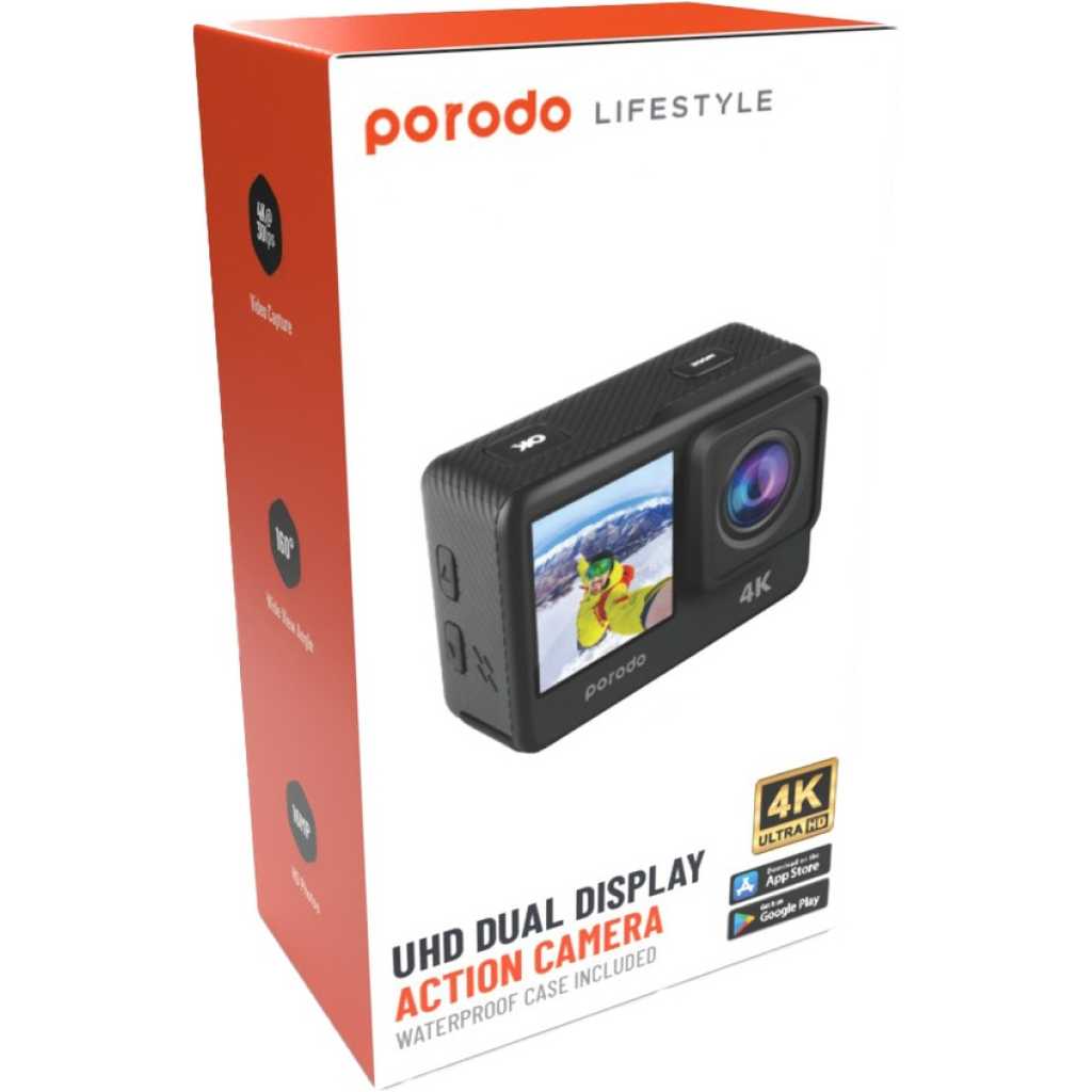 Key Features: App Store & Google Play Available Software Easily control and manage your camera settings with the dedicated app available on both the App Store and Google Play. Connect seamlessly to enhance your shooting experience. Waterproof Case Included Dive into the action without worry. The included waterproof case ensures your camera stays protected in water-related activities, allowing you to capture stunning footage even underwater. Multiple Shooting Modes Tailor your shots to perfection with a variety of shooting modes. Whether it’s capturing stills, recording video, or experimenting with time-lapse, the Porodo Lifestyle Action Camera has you covered. Dual Screen Display Benefit from the convenience of dual screens. The 2.0″ LCD screen on the back provides easy control and playback, while the 1.3″ IPS screen on the front ensures you capture the perfect selfie or monitor your recording in real-time. 16MP HD Photos Capture every detail with 16MP high-definition photos. The Porodo Lifestyle Action Camera delivers stunning image quality to preserve your memories in vivid clarity. Power 5V/1A Conveniently charge your camera with a standard 5V/1A power source, ensuring you stay powered up for your next adventure. Battery Capacity 900mAh The 900mAh battery provides ample power for extended shooting sessions. Capture the action without worrying about running out of battery. WiFi Supported Connect and share your moments instantly with built-in WiFi support. Share your experiences with friends and family seamlessly. Accessories (Waterproof Case, Bicycle Bracket, Various Mounting Clips, USB Cable, 3M Adhesive, Support Bands) The included accessories provide versatile mounting options and tools to enhance your shooting experience, ensuring you have everything you need for any adventure. Compatibility Windows & Mac Transfer and edit your footage effortlessly on both Windows and Mac platforms, ensuring flexibility in managing your content.