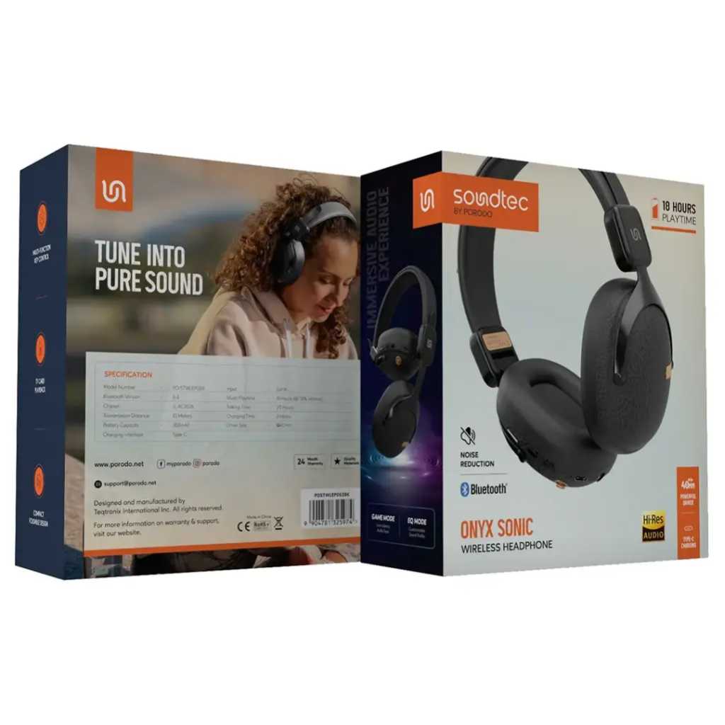 The Porodo Soundtec Onyx Sonic Wireless Headphones deliver an outstanding audio experience with a range of features tailored for both music enthusiasts and gamers. Equipped with powerful 40mm drivers, they produce rich, clear sound, enhanced by advanced noise reduction technology for immersive listening. With Bluetooth 5.4, you get stable, low-latency wireless connectivity up to 10 meters, making them ideal for gaming and multimedia use. These headphones offer up to 18 hours of music playback and 20 hours of talk time on a single charge, with fast Type-C charging in just two hours. Their foldable, compact design ensures easy portability, while the multi-function key control lets you switch effortlessly between Game Mode, EQ Mode, and more. Additional features like TF card playback and a customizable sound profile add to their versatility. Whether you’re enjoying music, taking calls, or gaming, the Onyx Sonic headphones provide comfort, convenience, and exceptional performance.