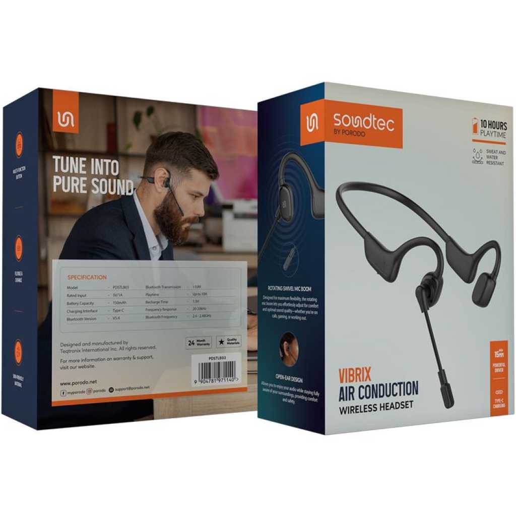 Porodo Vibrix Air Conduction Wireless Headset with Rotating Swivel Microphone, Up to 10 Hours Play Time, 150mAh Battery, Bluetooth Version 5.4, USB-C Charging Port, 1.5 Hours Recharge Time, 15mm Power