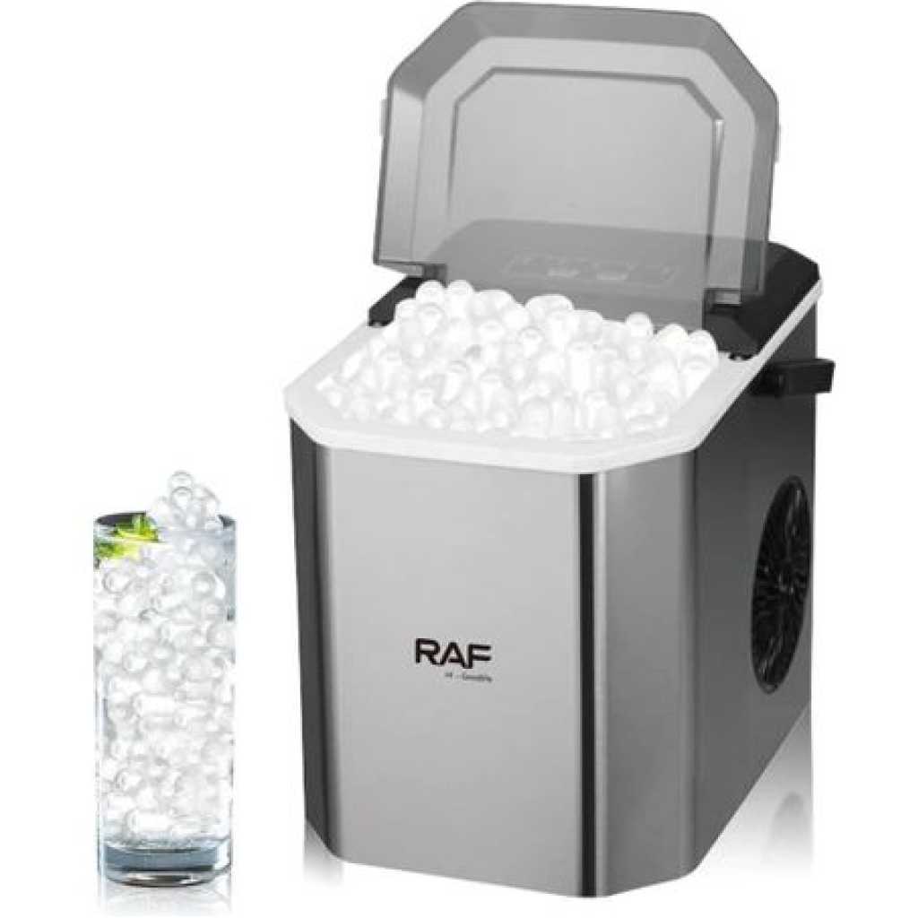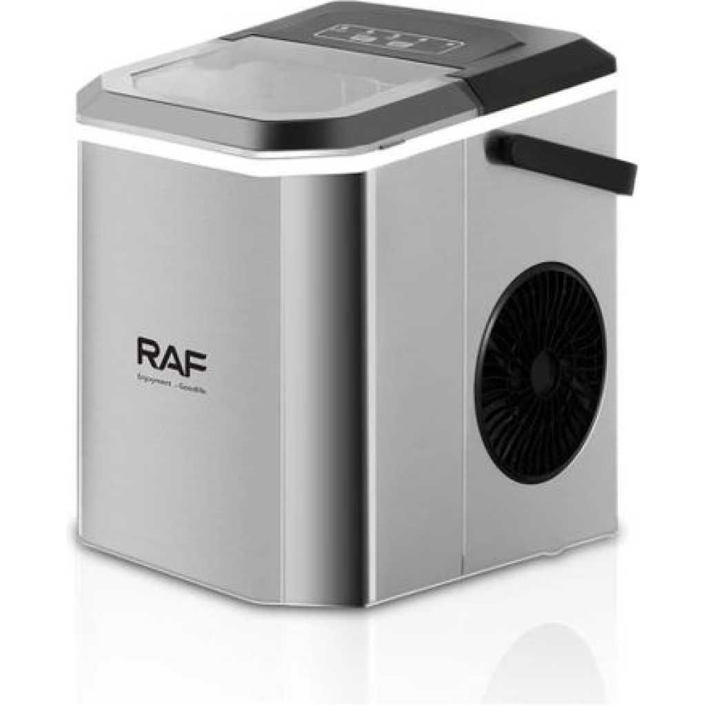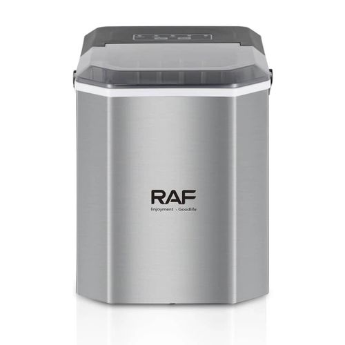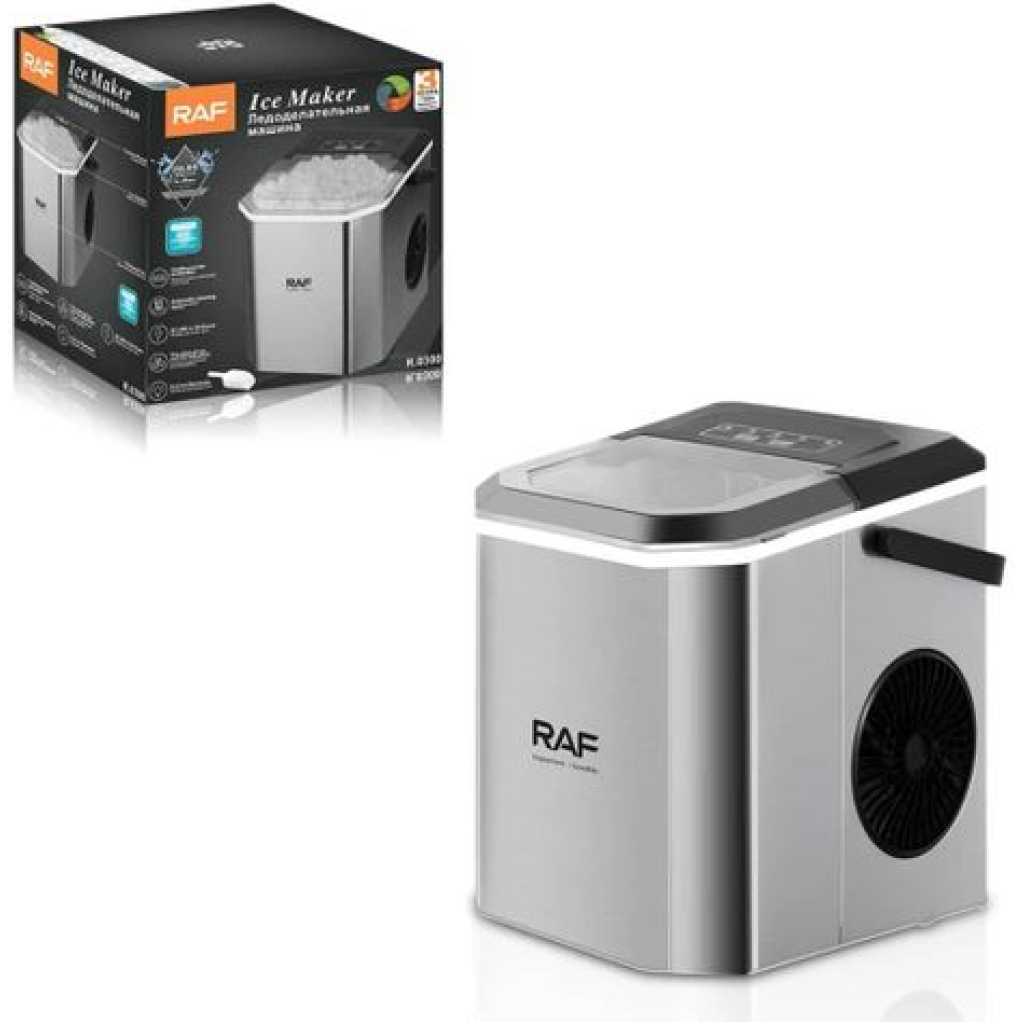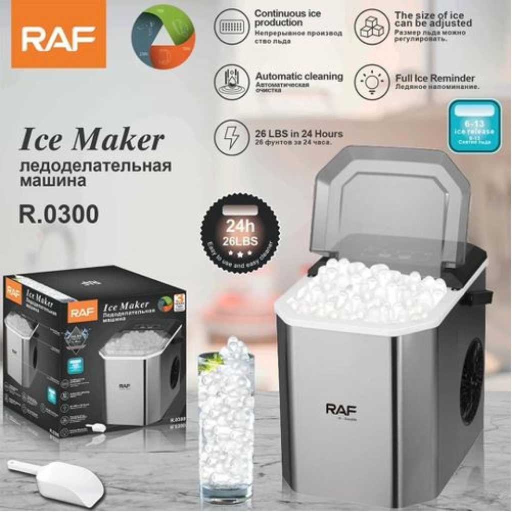Rapid ice making,Single ice release time:6-13minutes Ice cube maker has two ice size options, select whether you want small or large ice cubes Device is portable, now you can chill out anywhere anytime Continuous ice makingCan get a total of 12kg ice within 24 hours Easy to clean Material Combination Installation Table Top Colour Name Silver Product Length 20 cm Product Height 26 cm Product Width/Depth 27 cm Energy Used Electric Wattage 95 W What’s In The Box Ice Maker, Shovel Model Number R.0300 Model Name RAF ICE MAKER