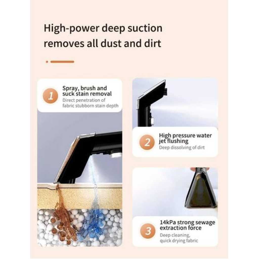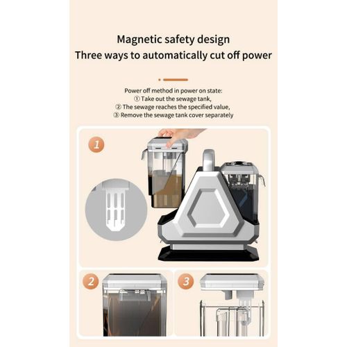 Key Features: ????SUPER SUCTION: The Ailltopd carpet cleaner machine is equipped with a 450W motor, which can provide a super suction force of 11Kpa. which can quickly and deeply handle various stains and stubborn paint, such as beverages, juice, pet urine, dust on sofa covers, etc. It is also equipped with a strong suction system, ensure that the carpet can dry quickly after cleaning, allowing it to quickly return to its normal state, making your home environment healthier and safer. ????DUAL WATER TANK SYSTEM: 0.8L sewage tank and 1.8L clean water tank are stored separately, allowing you to easily disassemble the water tank for filling, draining, and cleaning. Tips: The water volume of the sewage tank can’t exceed the MAX line, otherwise it may cause the suction of the carpet cleaner to stop. The clean water tank can be added our equipped agent and sprayed evenly on the carpet or pad to ensure better cleaning results. (Please refer to the instructions on the agent for ratio.)