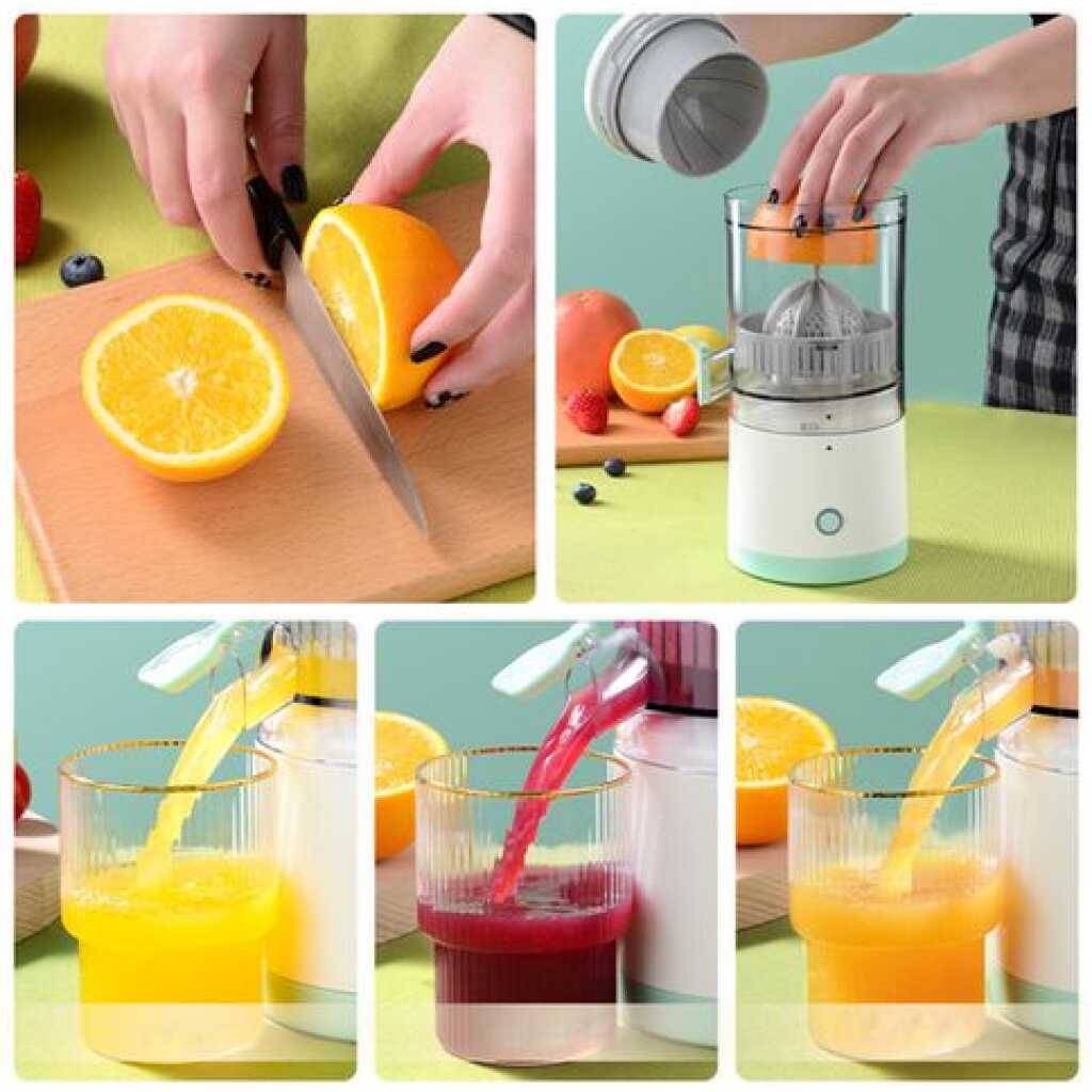 Portable Electric Citrus Juicer Rechargeable Hands-Free Orange Juicer Lemon Squeezer with USB and Cleaning Brush. Enjoy delicious juice anytime and anywhere with one click! Take our wireless citrus juicer to the outdoor camp and don’t worry about running out of power. USB RechargeableOur electric citrus juicer is wireless and rechargeable, you can use USB-C technology for charging. Portable & CompactOur electric citrus juicer is compact and portable. You can take it anywhere and it does not take up any Space.Easy to cleanOur electric citrus juicer can be easily disassembled and cleaned quickly. It contains a cleaning brush in the packageWarmly remind you that please cut the fruit in half or smaller in advance to prevent the fruit from getting stuck. No need to plug in during use. Use it after fully charged and don’t use it while charging. It takes 1.5-2 hours to charge, and when it’s fully charged, the indicator light will turn from red to white. Please do not use the dishwasher to clean all the parts and do not wash the main body, it’s recommended to wipe it with a wet cloth, other parts can be washed by hand. Suitable for many occasions WIRELESS & PORTABLE DESIGN: The electric citrus juicer uses USB-C technology for charging. Take our wireless citrus juicer to the outdoor camp and don’t worry about running out of power. Enjoy delicious juice anytime and anywhere with one click! HIGHER JUICE YIELD: Press and communicate with the orange, the juice is much tastier! This electric orange squeezer extract juice with a slow-speed system. It provides the pure taste of fruit. EASY TO USE & CLEAN: The juicer extractor is assembled in several parts, all detachable for easy separation and cleaning. It’s equipped with a brush to help clean. But please do not use the dishwasher to clean all the parts and do not wash the main body, it’s recommended to wipe it with a wet cloth, other parts can be washed by hand. COMPACT DESIGN: The size is highly compact and portable. It does not take up any Space. Use it at home or take it to the picnic so you can have nutritious juice any time of the day. SAFE TO USE: All of our slow juicer parts are made of high-quality ABS+AS material, which is safe and non-toxic. Gives you and your lovers flavorful juice every day! Warmly remind you that please cut the fruit in half or smaller in advance to prevent the fruit from getting stuck. No need to plug in during use. Use it after fully charged and don’t use it while charging. It takes 1.5-2 hours to charge, and when it’s fully charged, the indicator light will turn from red to white.