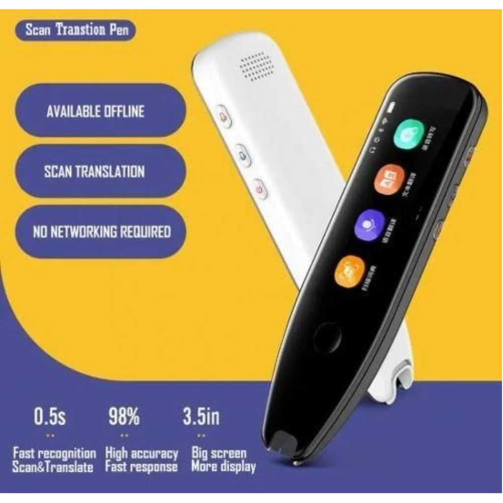 Key Features: Scanning&Translation: This scanning pen can scan text and translate the scanned text instantly.It has 98% accurate recognition rate and efficient scanning speed, just slide your handheld scanning pen across a line of printed text and watch it appear instantly on your screen. Intelligente AI TranslatorDevice: It is not only a scanning pen, it has all the functions of a translator, supporting 112 languages online voice translation, 112 languages recording translation, 55 languages scanning translation, and offline scanning translation in Chinese, English, and Japan. Tested by over 5000 users, this language translator’s translation accuracy reaches 98%. Text Excerpt: It allows you to Scan the Text, Story, or full article and transfer text to PC or Mac, directly via USB or from the 8GB storage, with no additional software required. Newly designed Intelligent recording feature functions as a digital recorder. You can record and save all your Lectures and presentation audio without missing any important words. Multifunctional Pen Scanner: This Scanner can be used as an MP3 player to connect your Bluetooth, earphone, and type C port. The 1500mah makes 8 hours voice translation and 210 hours device standby true. The user can use it for long time. This scan translation pen enhances the travel experience, it helps you overcome cross-language barriers, like hotels to stay, attractions to visit and so on while traveling overseas. Just enjoy it in anywhere. Light & Portable -portable design with the same size as a pen. 3.5inch large touch screen display with eye-protective UI design. Full angle recognition. Covered by Alloy Rear Shell: high-quality materials designed to maximum-optimize user experience. High-fidelity speaker.