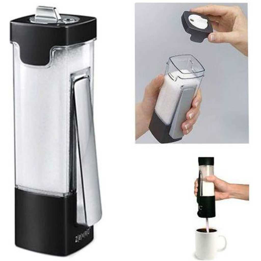 Brand New Buy with Confidence Real value for money Good Quality Dispenser for keeping sugar or other condiments conveniently on hand Mechanism for dispensing specific amounts–choose 1/4, 1/2, or 1 teaspoon Keeps out moisture and air; top can be set to sprinkle, pour, or closed Ergonomic design; refills effortlessly thanks to pull-off top; made in China Measures 2-5/9 by 2-1/8 by 8-5/6 inches The perfect portion control tool for dispensing sugar, salt, artificial sweetener and other powdered foods Dispenses a consistent, measured amount with each squeeze of the easy-to-use lever