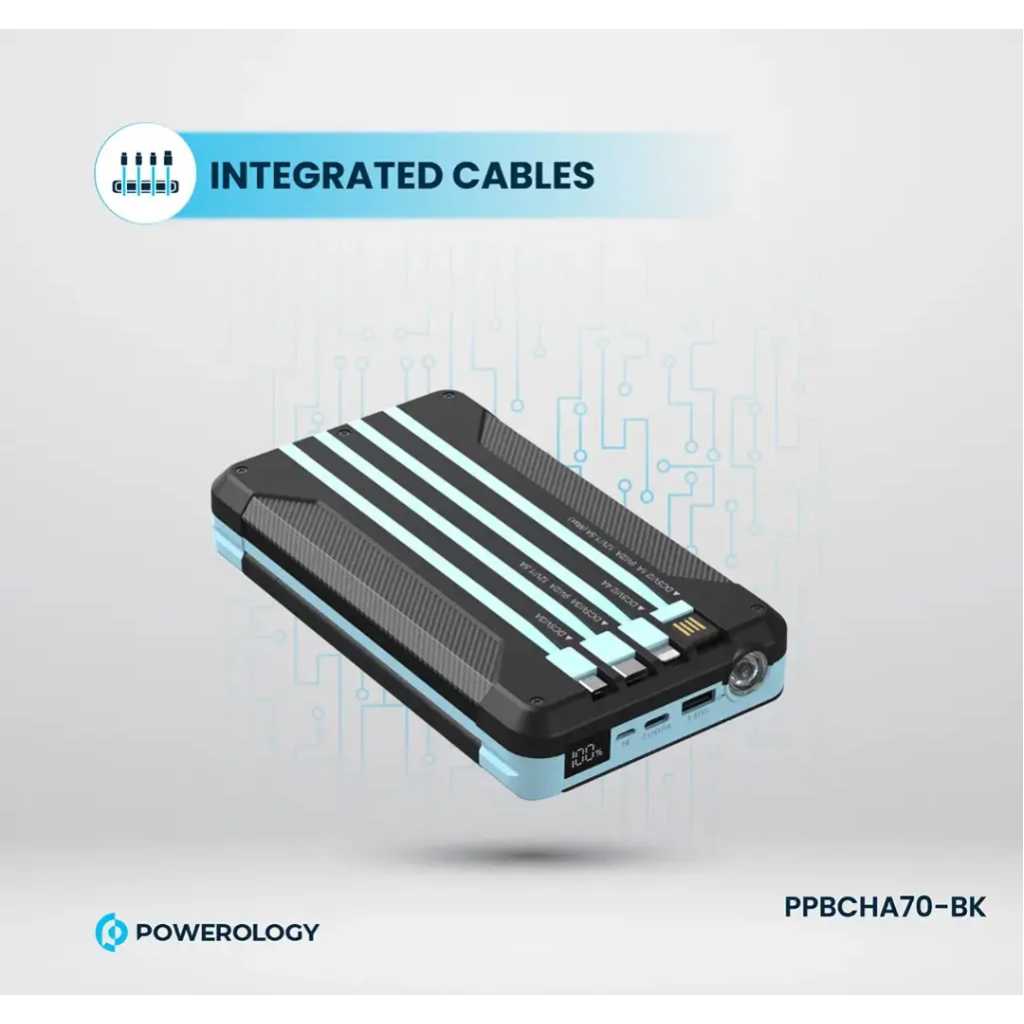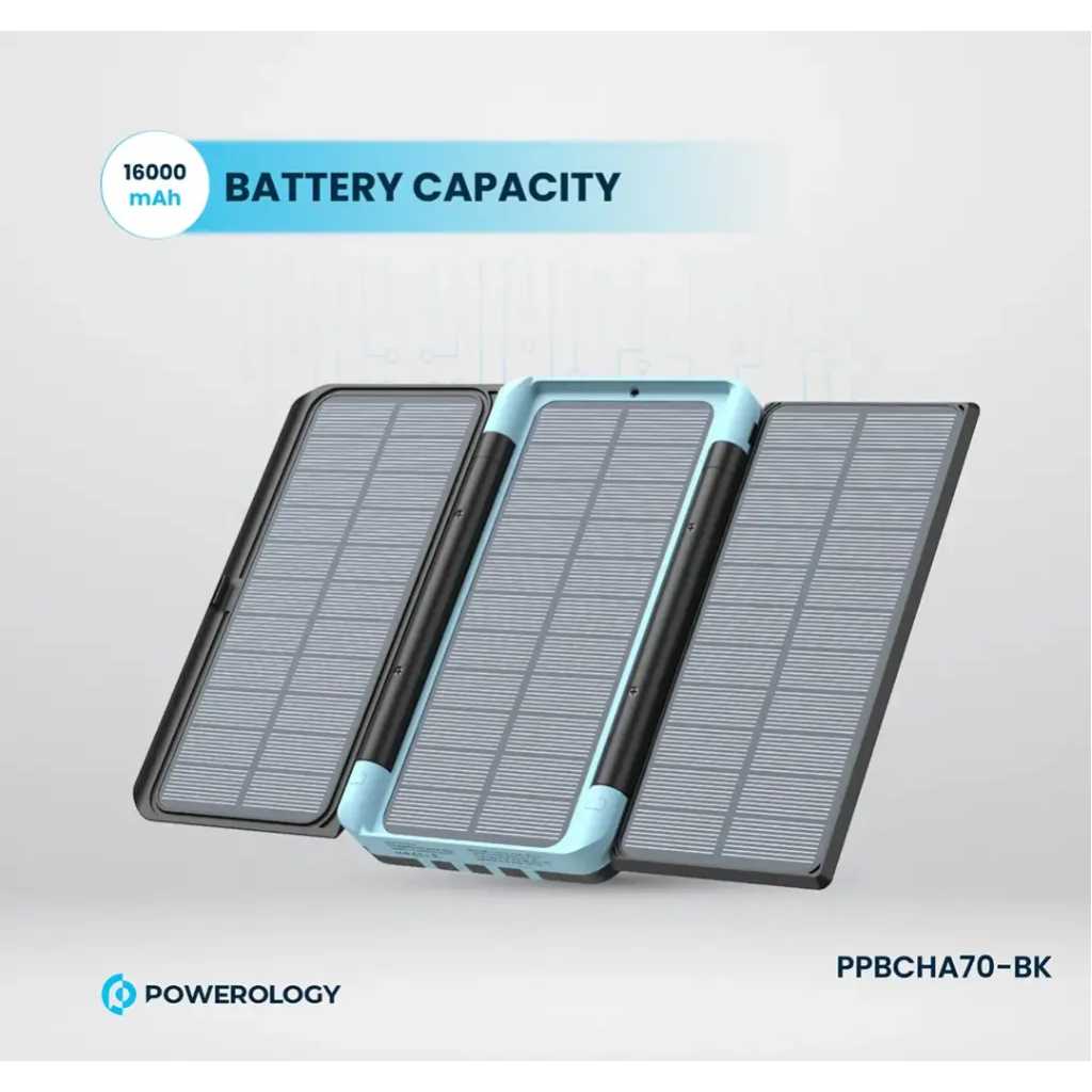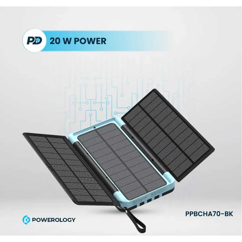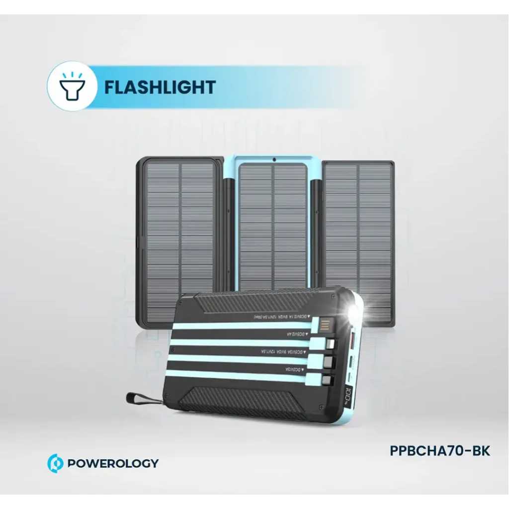The Powerology 16000mAh Solar Power device is a versatile, all-in-one gadget combining essential features for outdoor and emergency use. It offers a robust 16000mAh battery capacity, delivering 59.2Wh of power at 3.7V, making it suitable for charging devices on the go. The device supports wireless output at 2.5W, ideal for charging smartwatches, and offers FM radio functionality covering frequencies from 87.5 to 108MHz. Equipped with a 2-watt LED light and an additional emergency light, it ensures visibility in low-light conditions. Other features include an LED digital clock, an integrated cable, a 3-watt speaker, and Bluetooth V5.3 connectivity. The device also supports 20W PD for fast charging, making it a comprehensive tool for various needs.