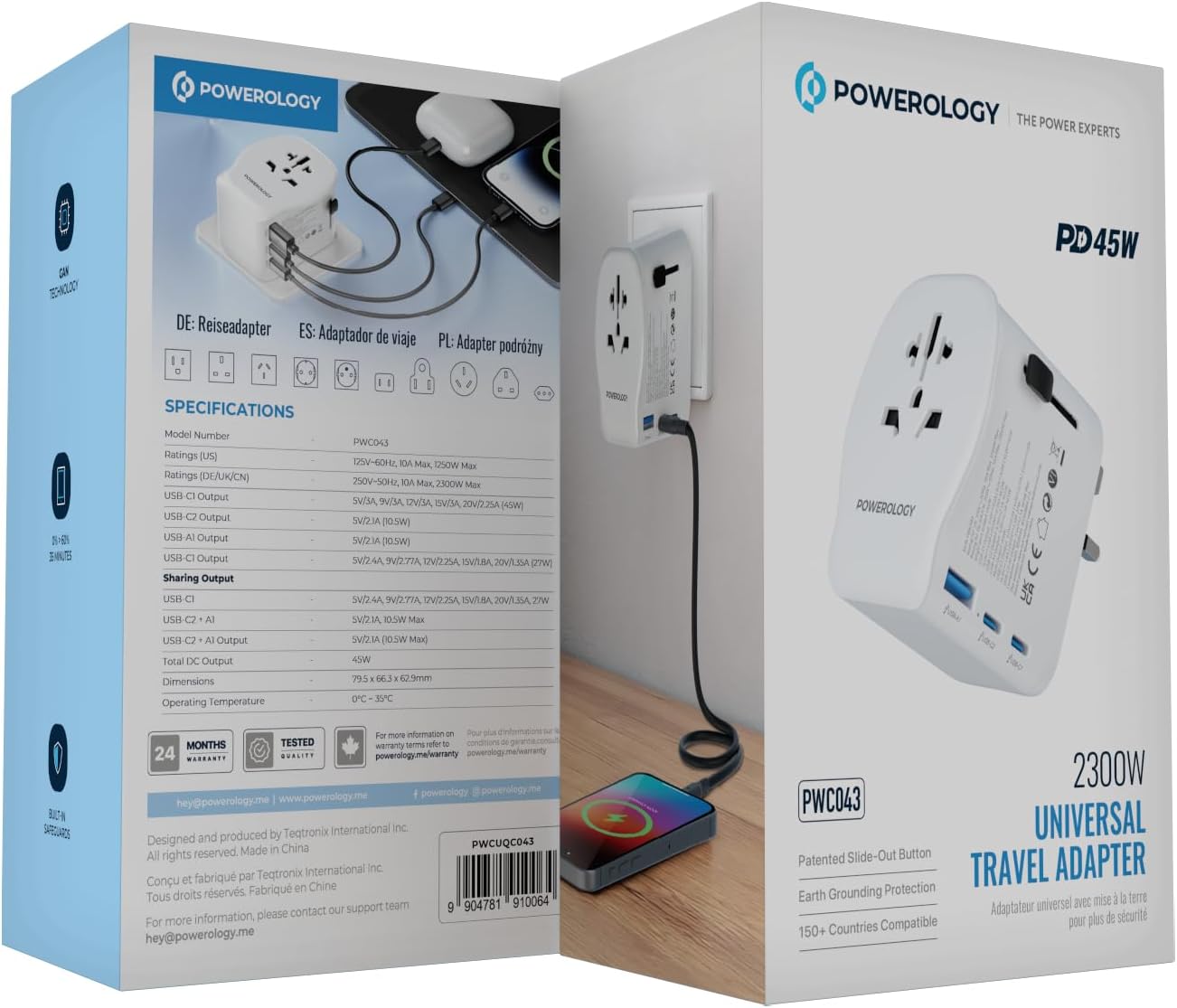 Key Features: 【 】Compatible with outlets in over 150 countries, making it perfect for international travel. 【 】Delivers a robust 2300W output, ideal for powering multiple devices simultaneously. 【 】Includes 45W PD USB-C output for rapid charging of smartphones, laptops, and other devices. 【 】Equipped with Earth Grounding Protection to ensure secure use in all environments. 【 】The package includes Powerology 2300W Universal Travel Adapter, a QR Code Card for easy access to the user manual, – , , and a + .