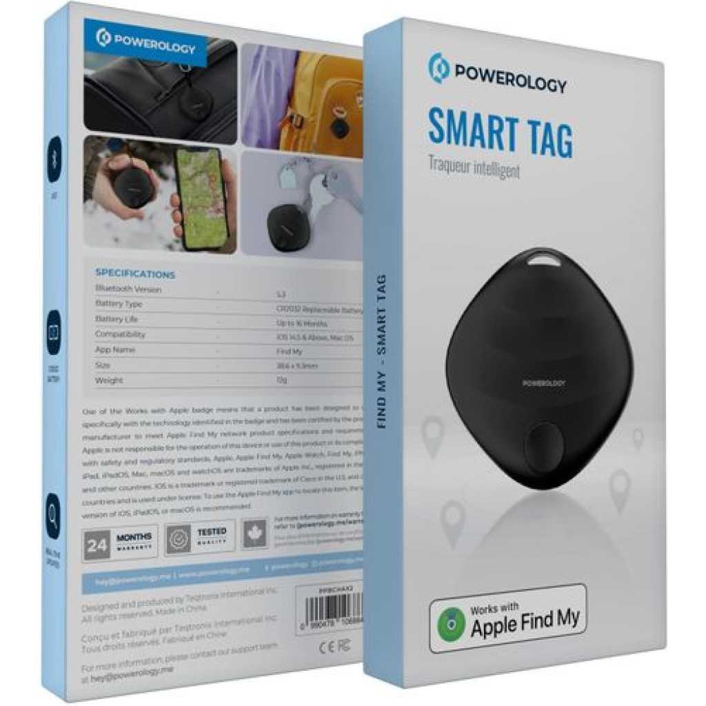Key Features: Ensures fast and reliable real-time tracking with enhanced connectivity. Comes with a CR2032 replaceable battery that offers up to 16 months of usage. Works seamlessly with iOS 14.5 & above, as well as macOS for easy integration with the Find My app. Small and easy to attach to your belongings without adding bulk, measuring only 38.6 x 9.3mm and weighing just 12g. The package includes Powerology Find My Smart Tag, a QR Code Card for easy access to the user manual