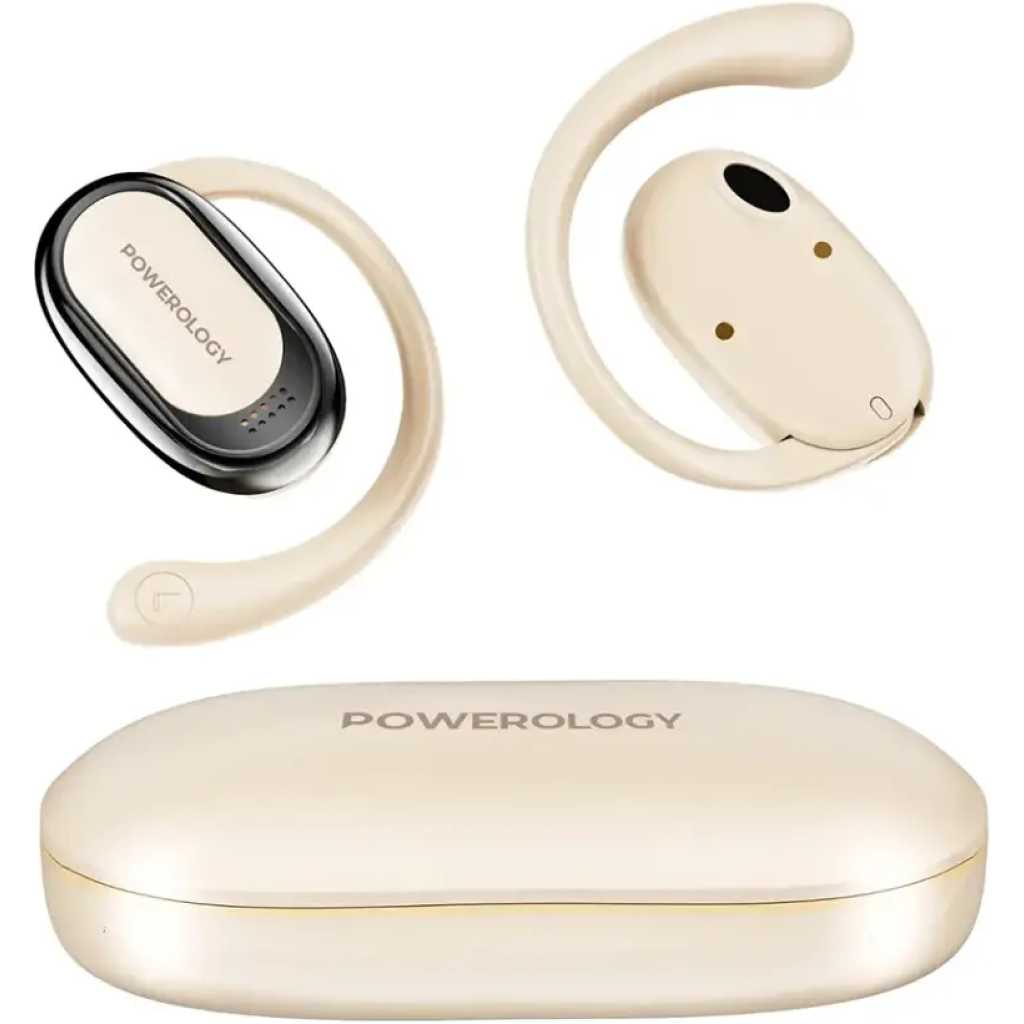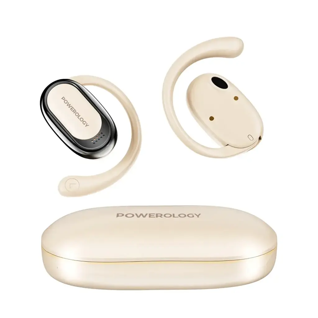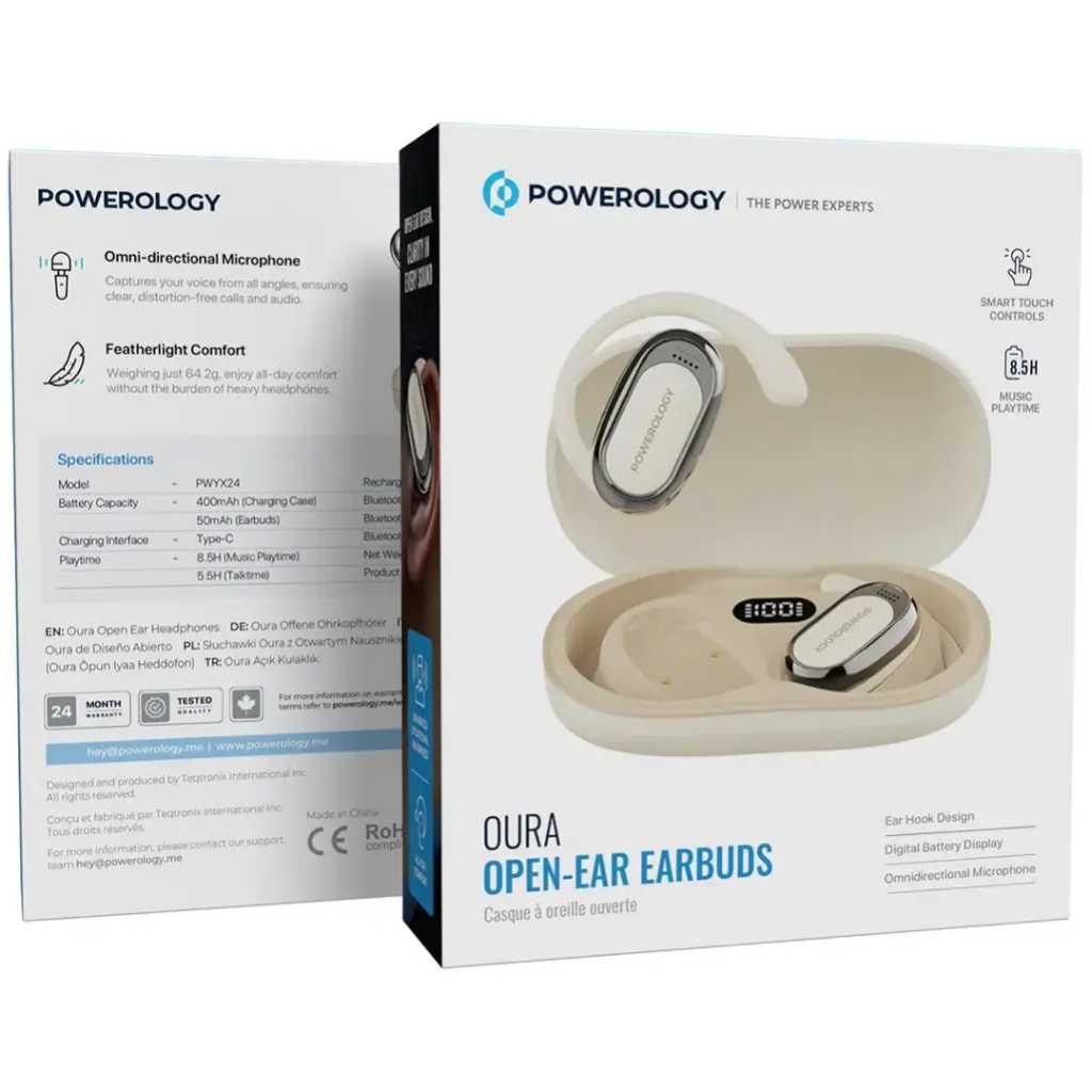The Powerology Oura Open-Ear Earbuds combine comfort, convenience, and high-quality audio for an exceptional listening experience. Featuring an omni-directional microphone, these earbuds capture your voice clearly from all angles, ensuring distortion-free calls and audio. Weighing just 64.2g, they offer featherlight comfort, allowing you to wear them for hours without discomfort. The open-ear design enhances situational awareness, letting you stay aware of your surroundings while enjoying immersive sound. With an ergonomic fit and smart touch controls, managing your music and calls is simple and intuitive. Offering up to 8.5 hours of music playtime and 5.5 hours of talktime, these earbuds are designed to keep you connected all day. The quick 1-hour recharge time ensures minimal downtime. Bluetooth V5.4 ensures stable, high-quality connectivity within a 10-meter range, making these earbuds a great choice for everyday use.