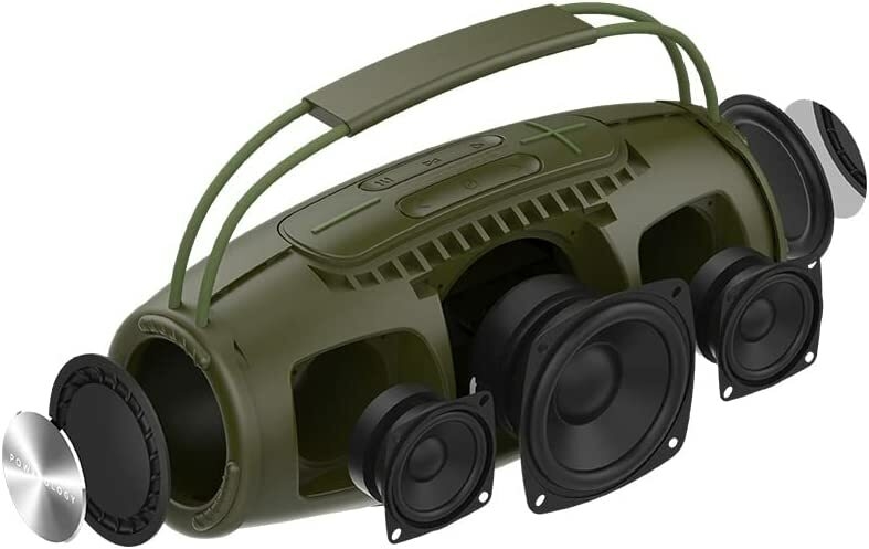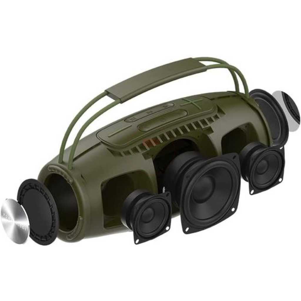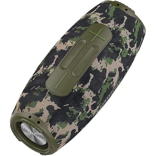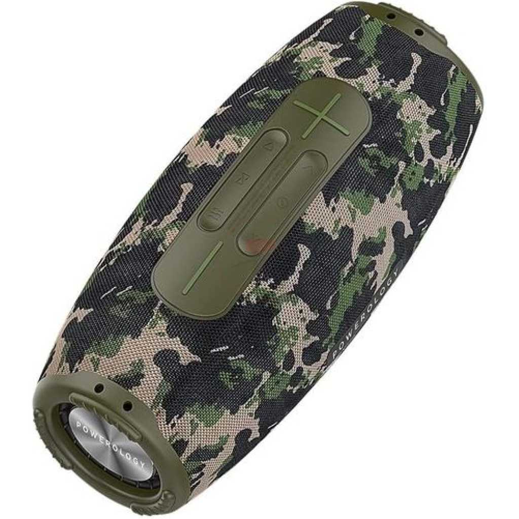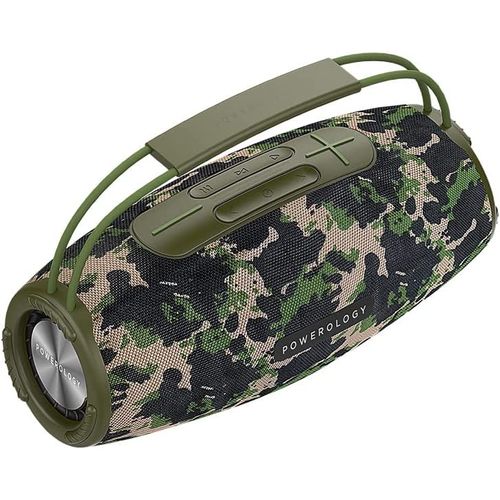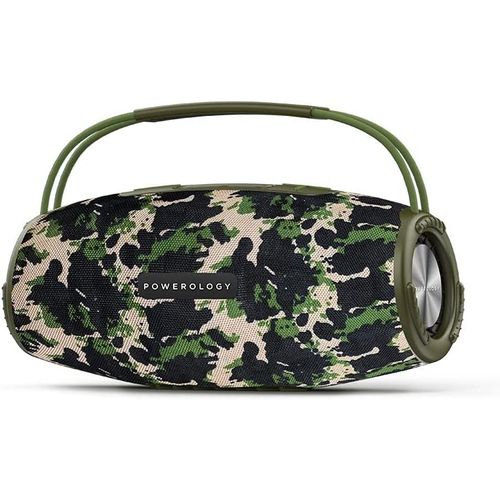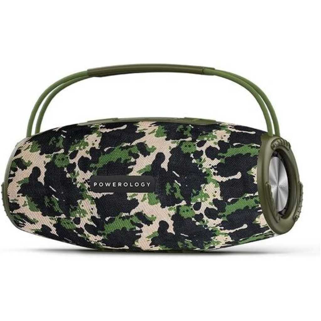 Powerology Phantom Boombox Bluetooth Speaker – Camouflage Green Powerology unmatched quality brought to the speaker space. The Powerology Phantom Boombox waterproof speaker brings you unmatched sound and design meant to be enjoyed on the go. It comes with a 16580mAh battery with a maximum play time of 9 hours on full volume. One sub-hoofer backed by two mid-range range tweeters sends through unmatched acoustics. Buy this Phantom Bluetooth Speaker Receive today from TilyExpress.