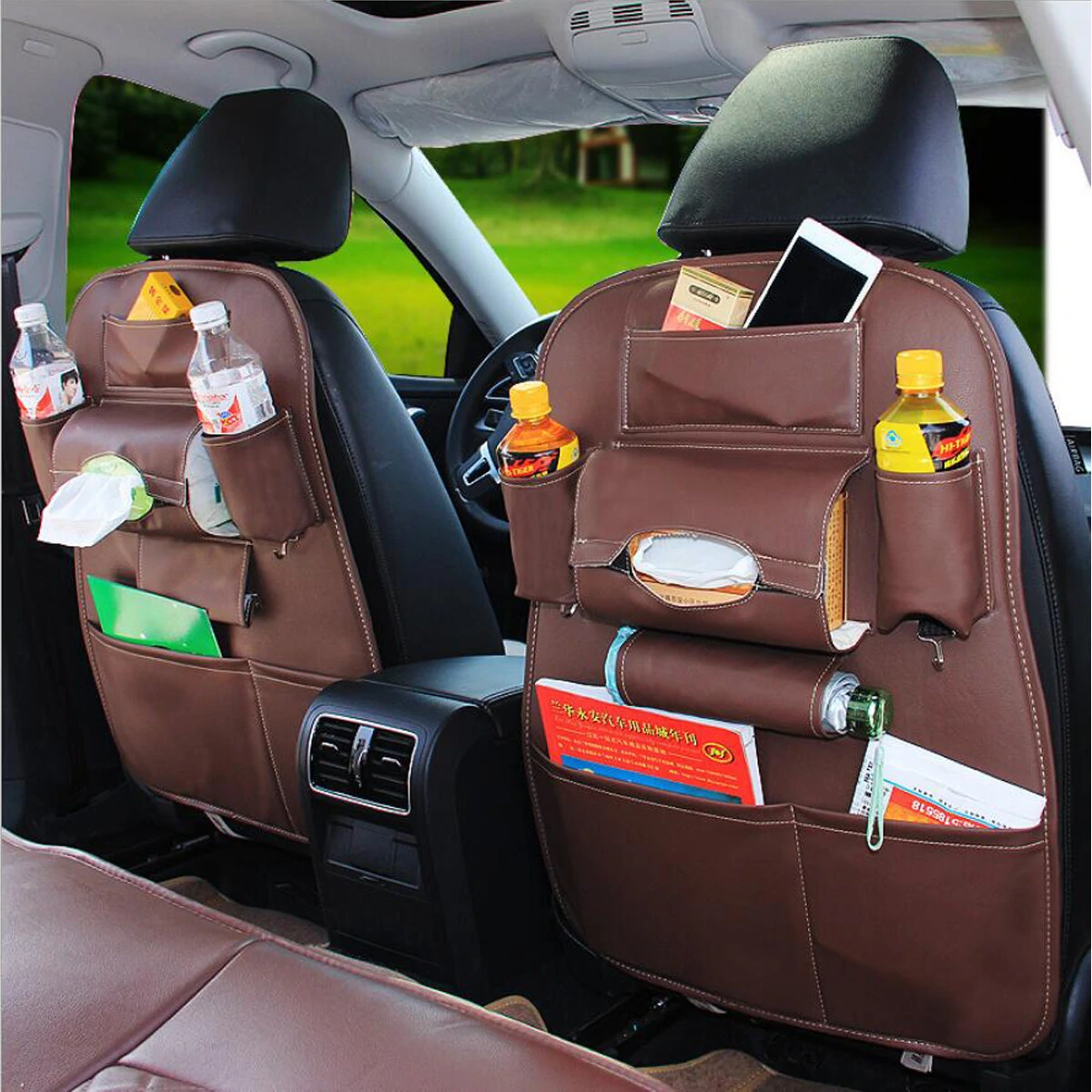 가죽 자동차 시트 백 스토리지 가방, 방수 시트 커버, 다기능 컵 홀더 정리함