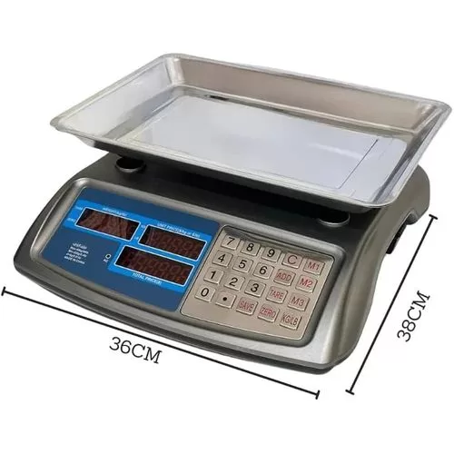Key Features: ADVANCED ACCURACY: Equipped with a high-precision digital weighing system, this professional scale provides accurate and reliable results from 5g to 40kg, making it perfect for a wide range of applications, both domestic and commercial. VERSATILITY FOR ALL REQUIREMENTS – Ideal for professional kitchens, pizzerias, bakeries, cold cuts and fruit and vegetable shops, the scale has a maximum capacity of 40kg and can easily weigh small ingredients and large items. STYLISH & FUNCTIONAL DESIGN – Compact size (13.6 x 12.8 x 4.9 inches), this scale fits perfectly in any environment, maximizing space without sacrificing style. EASY TO READ LCD DISPLAY – Large backlit LCD display ensures clear and simple weight reading in all light conditions. Also includes a screen for the customer, which increases transparency in business transactions. Durability and comfort of use: Powered by a rechargeable battery for extended use and equipped with non-slip rubber feet, this scale ensures stability and durability, ensuring an optimal using experience in any situation.