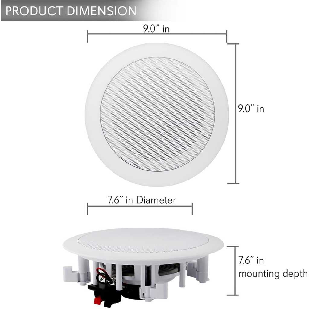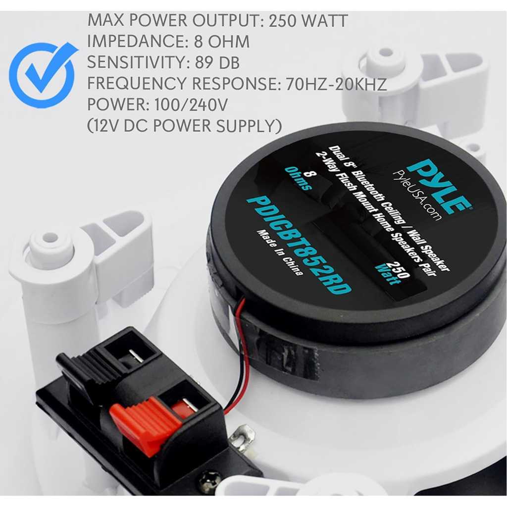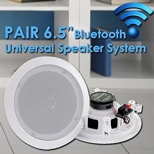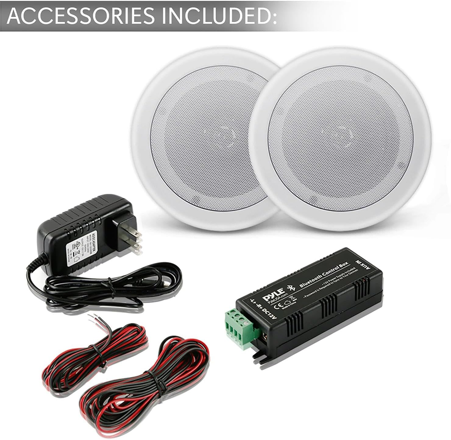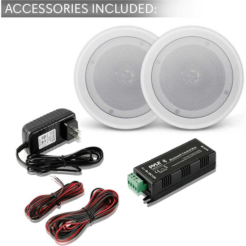 Key Features: BLUETOOTH – Built-in Bluetooth no hassle wireless music streaming from all your favorite Bluetooth enabled devices. Perfect for incredible stereo sound in any room in your home from speakers you can barely see without using any floor or shelf space. SPEAKER GRILL – Includes built in round stain resistant speaker grills. Match existing flush mounted designs in your home or workplace for a clean look & achieve wide-range sound performance without compromise. SEAMLESS INTEGRATION – Perfect sound wherever you need it. Great for existing home theater systems and custom applications this Pyle 2-way in-ceiling or in-wall speaker system will deliver on-demand crisp audio sound clarity all the time. FLUSH MOUNT DESIGN – Compact flush mount design for simple easy installation in-wall / in-ceiling , or pre-cut speaker openings, for in home use, office, professional, or custom audio applications on any flat surface. EASY TO INSTALL – Includes a cut-out size template & quick connect spring-loaded speaker terminals with spring loaded fixing clips for simple, easy, no hassle installation with included speaker connection wire, bluetooth Controller & power supply.