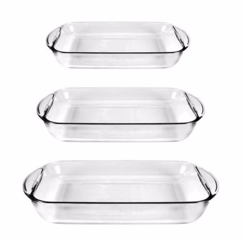 The Anchor 3 Piece Rectangular Glass Bakeware Set has clear tempered heat resistant glass. Oven Safe to 425 F. Includes 4 qt rectangular bake dish, 3 qt rectangular bake and 2 qt. rectangular bake dish.