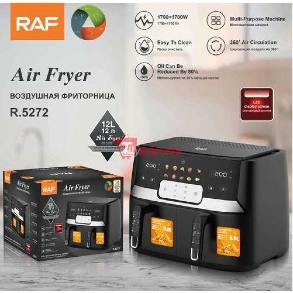 RAF 12L Air Fryer With 2 Independent Baskets Grill Oven- Black Who said tasty can’t be healthy? With the use of rapid air technology, the RAF Air Fryer can make some of your favorite snacks completely oil-free. Here is your chance to stay in shape without giving up those delicious snacks you crave so much. Confused on how to make them? Not to worry! Our helpful manual provides examples of a wide variety of dishes that can be prepared with the air fryer and exactly how to make them. Whether you are looking to fry, grill, or bake the Raf Air Fryer is the way to go. The Air Fryer uses 360° air flow technology that creates a crispy texture, with up to 93% less fat than the traditional deep-fry method. A healthy gift for your family members or friends. Premium slick knob and fingerprint-resistant stainless steel material, the greasy stains will be gone with one simple wipe, and all accessories are dishwasher safe. Large Capacity: It can make 3.5 lbs fries at one round, perfect helper for a family of 5–7 or a big gathering. SpecificationsProduct Name Air FryerBrand RAFModel Number R5272 12 liters, double bowl, air fryer, convection oven, 2800W, Digital control panel, RAF