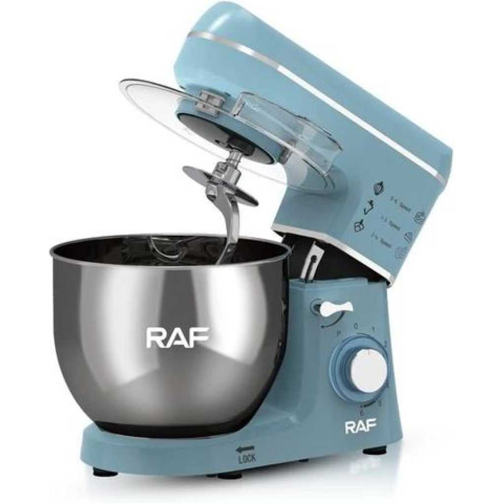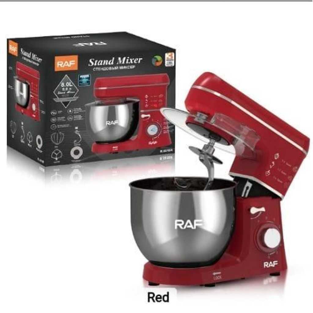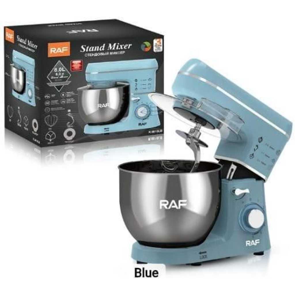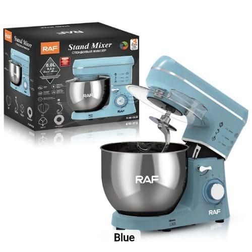 RAF 6-Speed Kitchen 8L Electric Food Stand Mixer Kneading Bread Dough Mixer- Multicolor A multiple-speed hand mixer will meet all of your mixing needs. A slower start, a zero speed gives you a smooth and trouble-free start. The hand mixer has easy-to-reach buttons and a slanted handle that offers a comfortable grip. You will feel more comfortable when doing kitchen work with the hand mixer. The impressive design and flawless construction will save you time cleaning it. You can clean it with a single damp cloth. The stand mixer is perfect for food preparation on different occasions, like daily cooking at home, birthday parties, bakery, and so on.