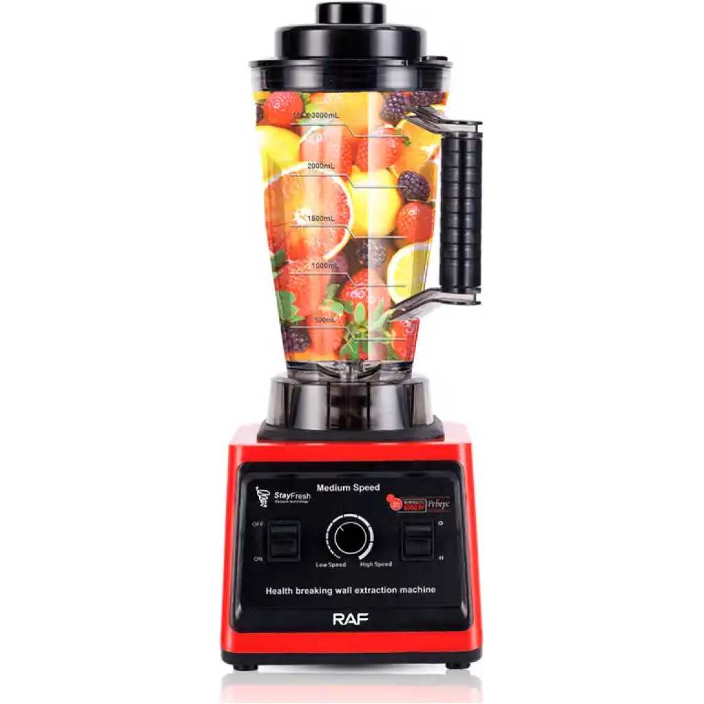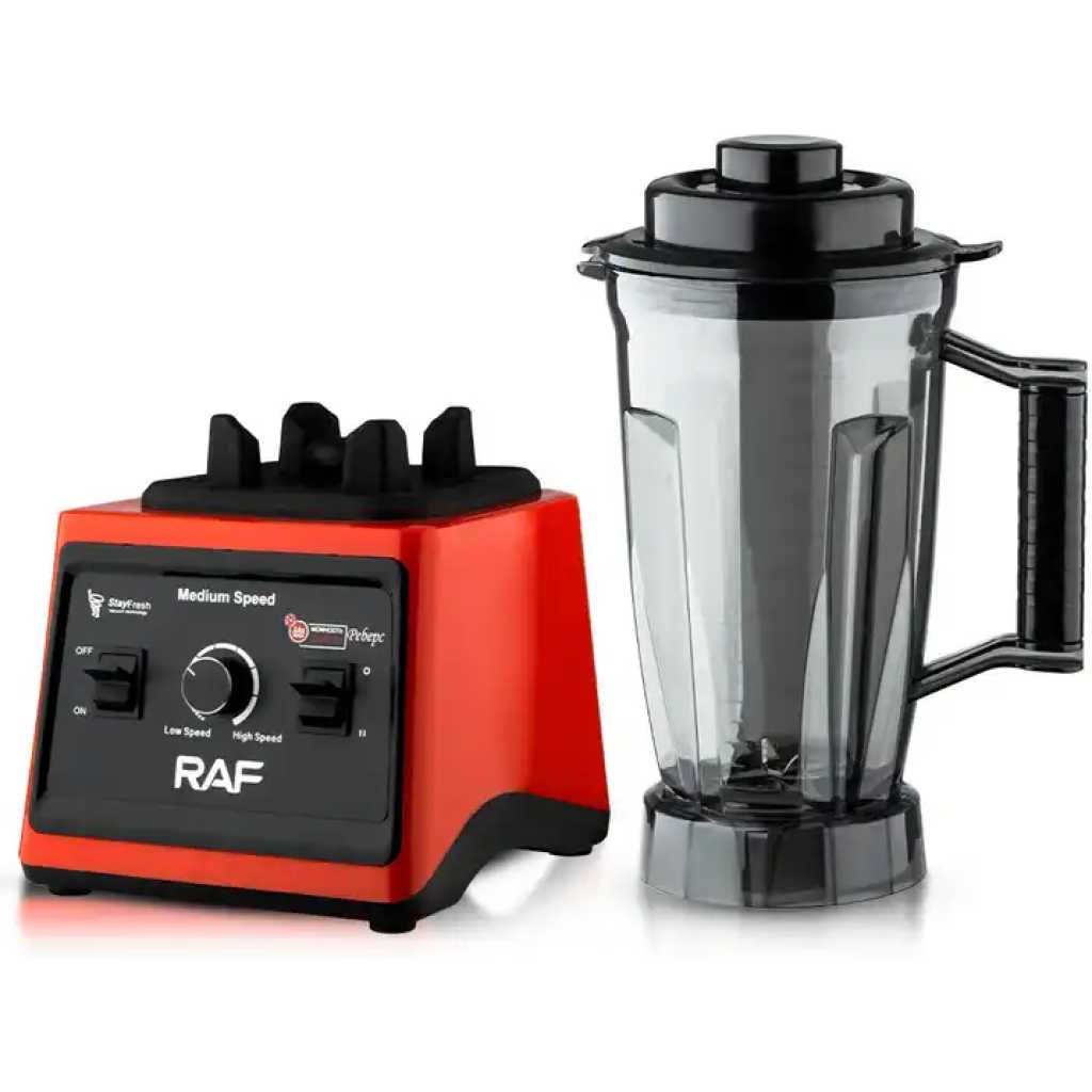 RAF 3L Commercial Blender 2400W BPA Free Jar | R2842 Its sharp stainless-steel blades guarantee it will last you for a very long time, while its practical dosing cup makes it oh-so-easy to use! Simply open the lid and dosing cup to safely and easily add ingredients while the blender is operating. whole new world of possibilities, allowing you to grind and grate your spices and ingredients in the blink of an eye. Blending has never been so easy! RAF Blender is a must have kitchen appliance for every home. It is a safe and healthy way of blending and grinding food in the kitchen, cleaning will be easier than ever before. It is better than the old and crude way of grinding pepper in our homes. Staying healthy requires that you eat balanced meals, to help you prepare these meals conveniently; you need the right appliances. Find the RAF Stand Blender today on TilyExpress at the best price you can ever imagined today. Highlights 2400W Removable Measuring Cup 3L Plastic Cup Stainless Steel Blade 8 Speed Settings Plus Pulse Setting Motor Housing Easy To Clean Specifications Brand: RAF Usage: blender Model: R.2842 Capacity: 3L Power:2400w 8 blade Food grade 8-leafsteel knide Motor speed 2400rpm Fast start Easy to cleam Strong power