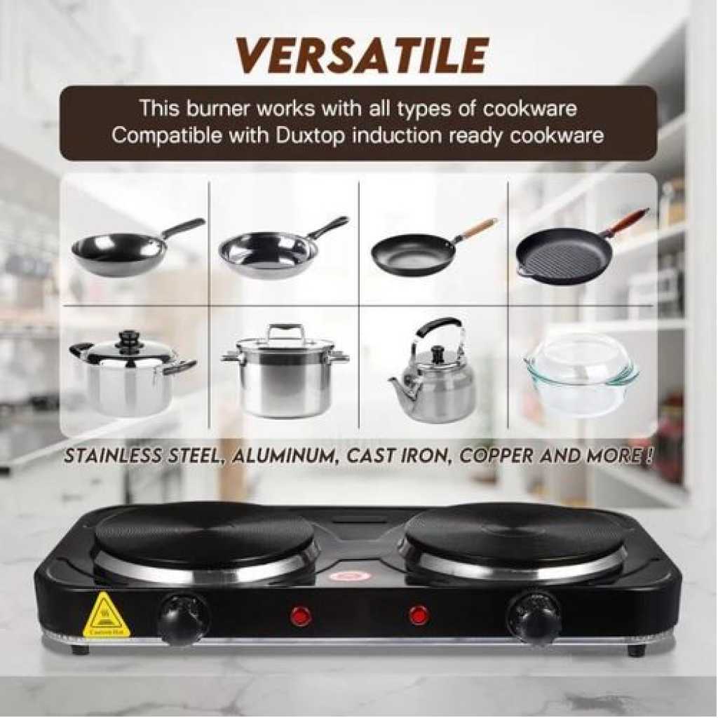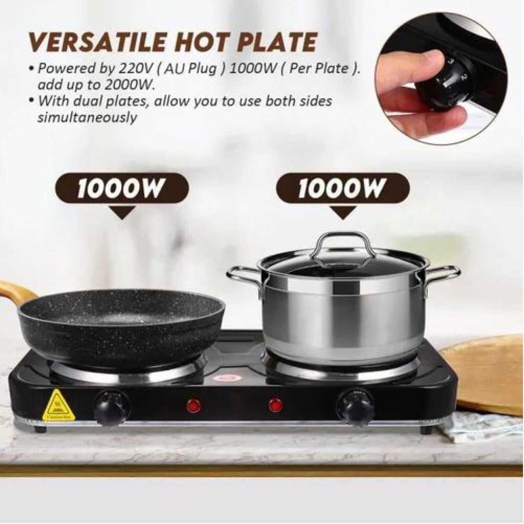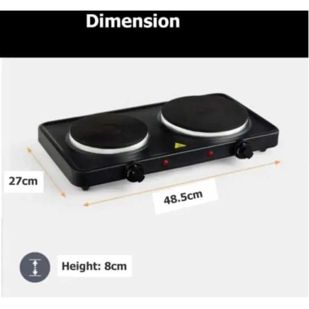 RAF Electric Ceramic Stove 1000+1000 Watts cooking hot plate with temperature control overheat protection electric cooker 2000 watts- Black This portable and easy-to-use appliance now allows you to cook easily and efficiently wherever you are. The adjustable thermostat gives you complete control of your cooking while the safety shut-off and the non-skid features ensure the product is safe to use. This elegant and powerful appliance would be a great addition to your kitchen. The RAF electric 2 burner Hotplate makes cooking faster and easier. The cooker is portable, energy-efficient, and affordable. Unlike other regular burners, the rapid heat and cool mechanism is a time and energy saver. Heat control knobs ensure you regulate your cooking to preferred temperatures. This portable single spiral hot plate has a temperature control knob and comes with a chrome drip pan which makes it easy to clean. Has efficient energy consumption with automatic switch temperature control.