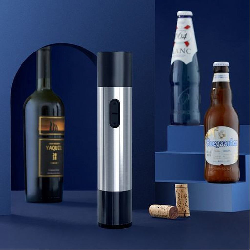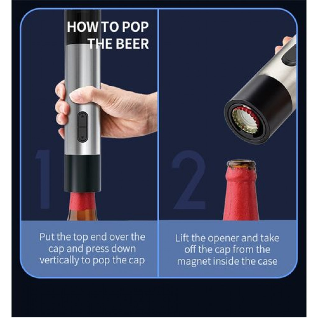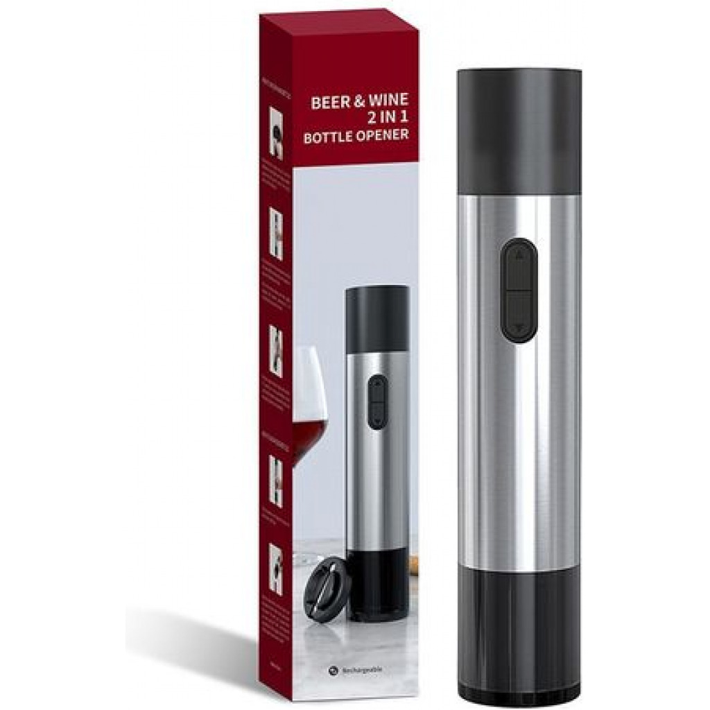 Key Features: Special 2-in-1 Design: An electric corkscrew that can be used to open wine bottles and beer Unique Surface: The brushed nickel and matte black finish is beautiful and the touch feeling is smoother Rechargeable: Comes with a Type-C cable, can open up to 50 wine bottles when fully charged Durable: Made of stainless steel and ABS which ensure the product quality Quick: Open wine or beer within 8 seconds Quiet: Noise is less than 70 decibels when in use