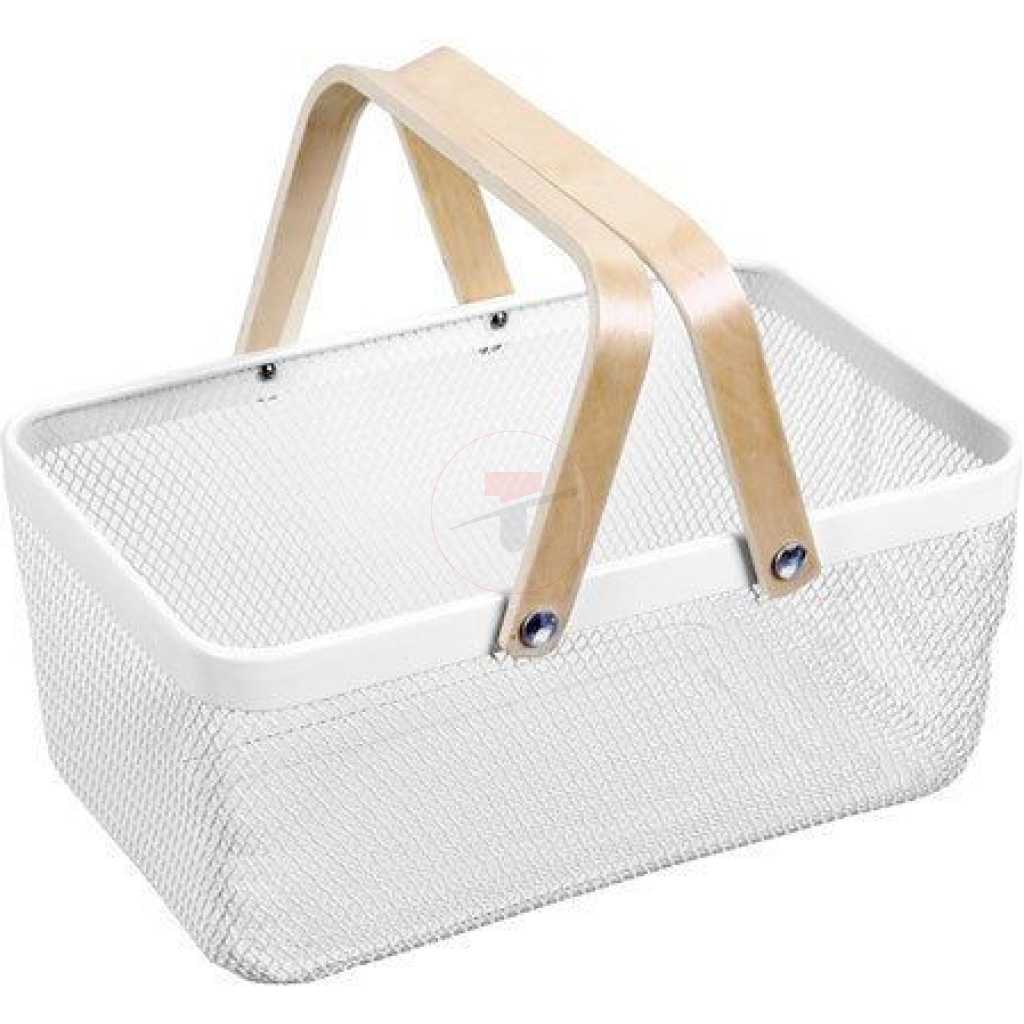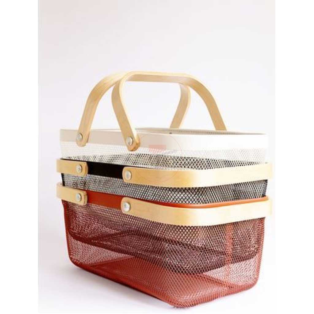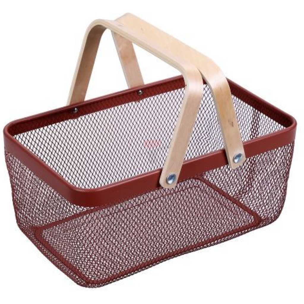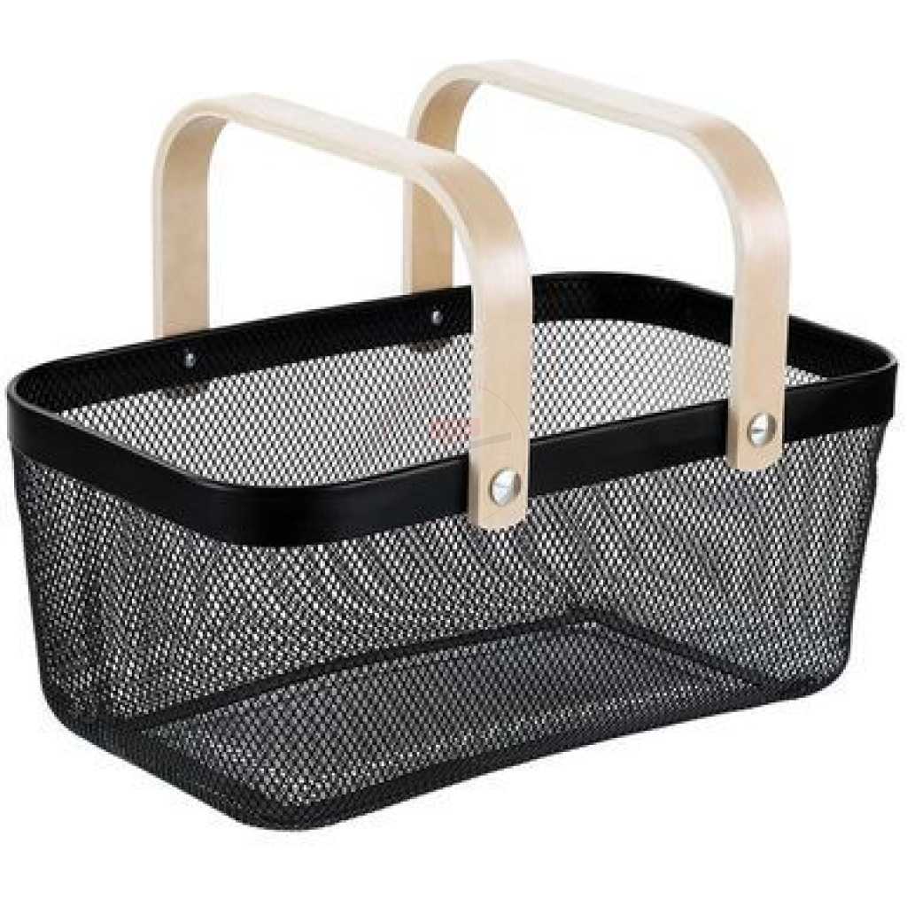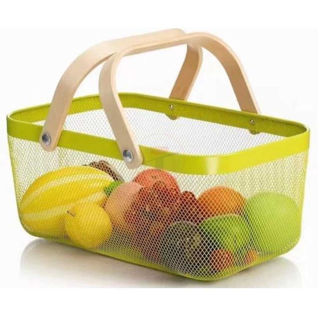 Rectangle Metal Mesh Fruit Shopping Wooden Handle Storage Basket- Multi-colour. 1. Made of metal steel mesh and wooden handle, durable. 2. Anti-rust and anti-corrosion. 3. It can be used for household daily use and kitchen storage. For example, fruits, snacks, vegetables, toys, bathroom storage, etc. Specifications: Product Name: Storage Basket Quantity: 1 Pc Package Included: 1x Storage Basket