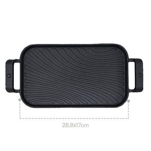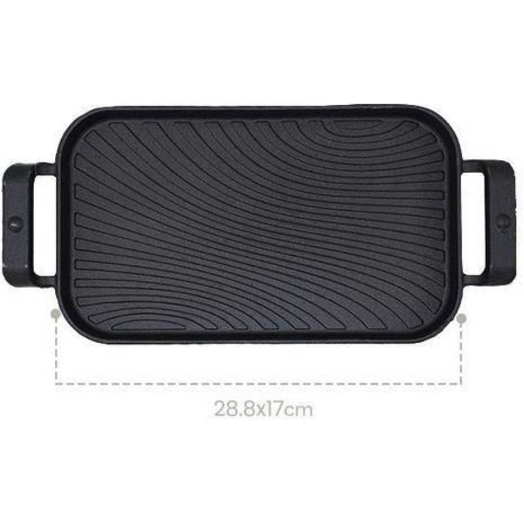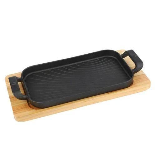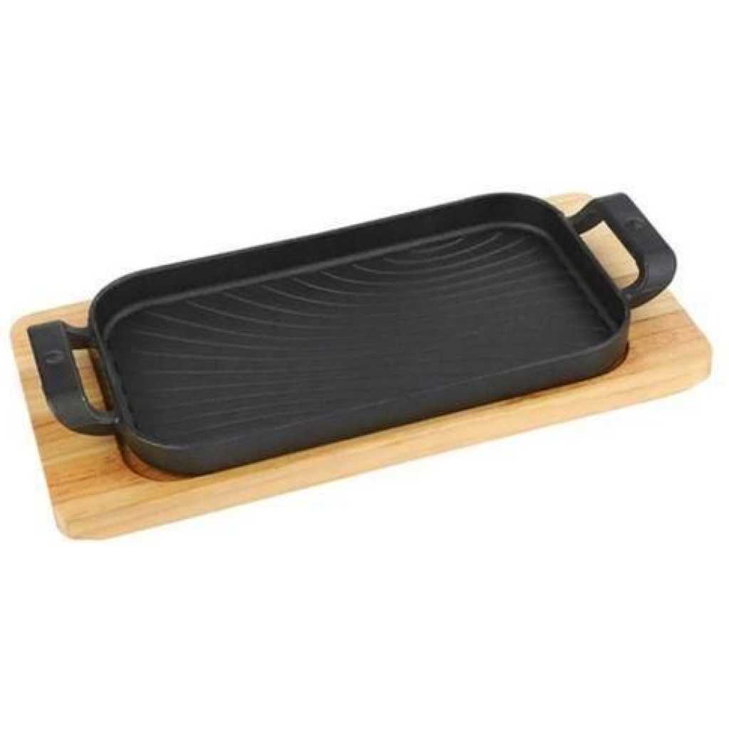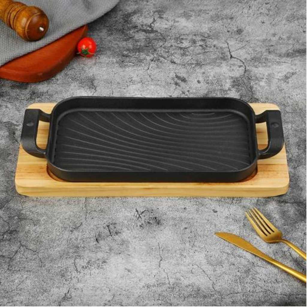 Rectangular Crystals Cast Iron Cookware Frying Pan Grill Backing Pot Skillet Plate with Wood Serving Board (26 cm) Cast Iron Steak Sizzler Pan Backing Pot Skillet Grill Wood Serving Board Platter