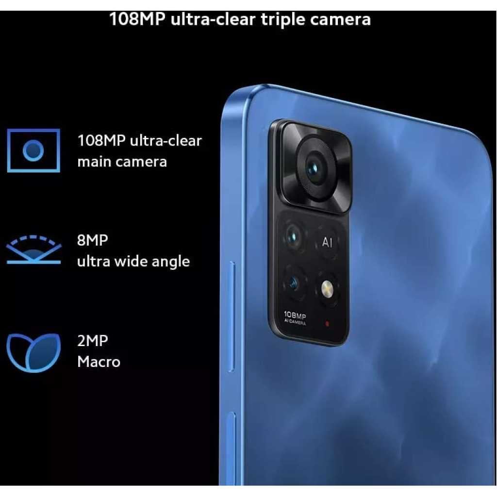 Key Features: Redmi Note 11E Pro 5G 6.67″ 8GB RAM 256GB ROM 108MP 5000mAh – Blue. Network Technology: GSM / CDMA / HSPA / CDMA2000 / LTE / 5G SIM: Hybrid Dual SIM (Nano-SIM, dual stand-by) Size: 6.67 inches Platform: OS Android 11, MIUI 13 Internal: 256GB 8GB RAM Main Camera: Triple 108 MP Comms; WLAN Wi-Fi 802.11 a/b/g/n/ac, dual-band, Wi-Fi Direct Bluetooth: 5.1, A2DP USB: USB Type-C 2.0, OTG Battery: Type Li-Po 5000 mAh, non-removable